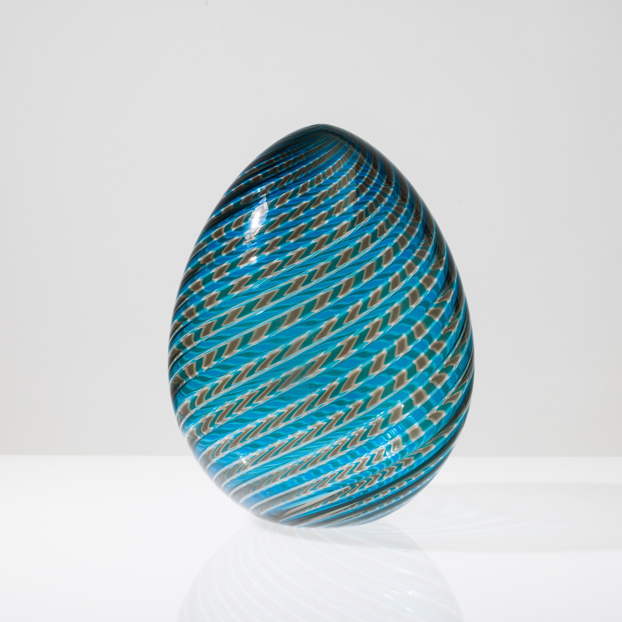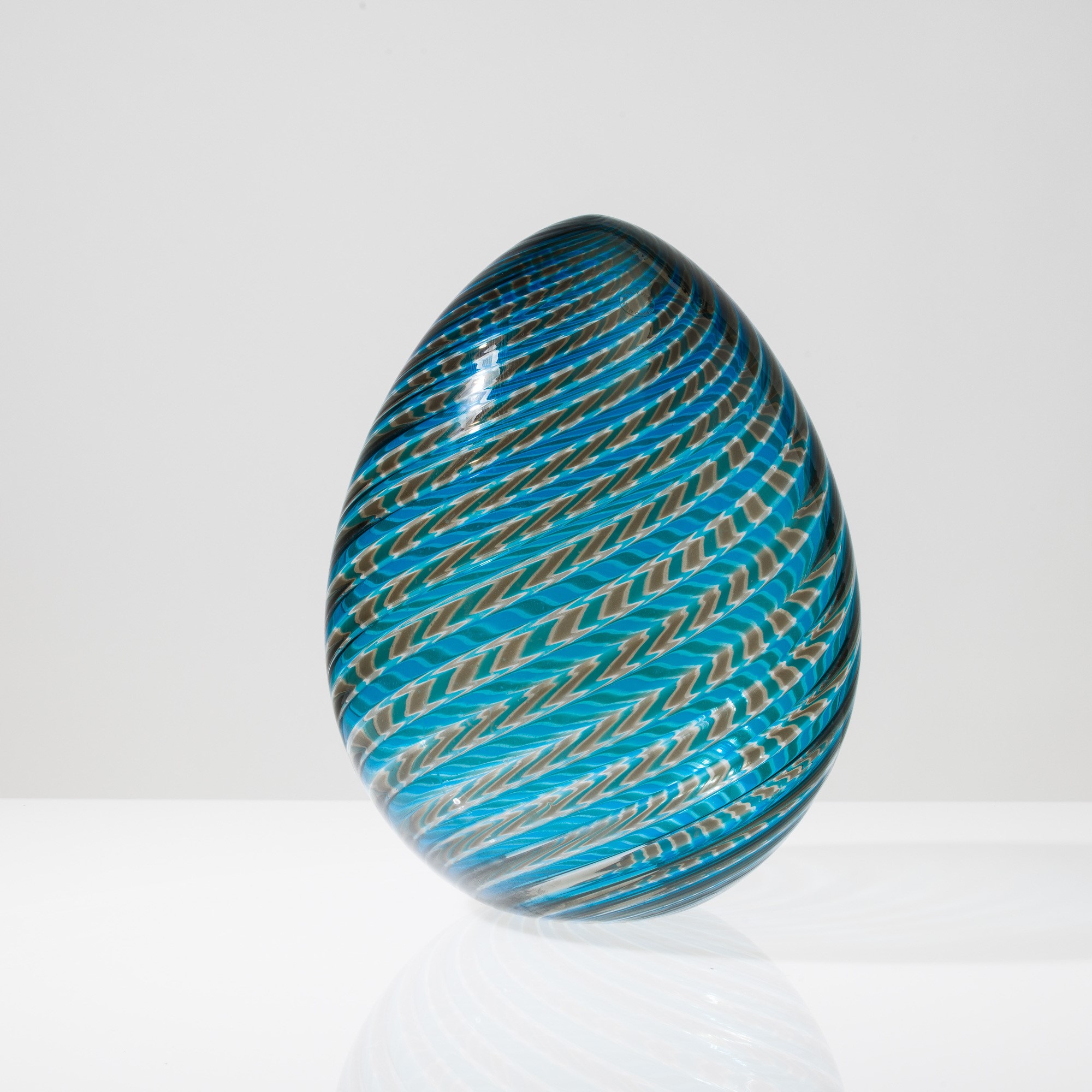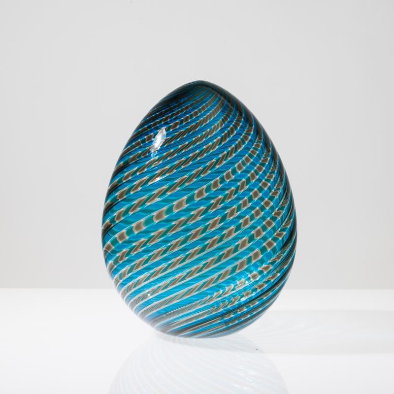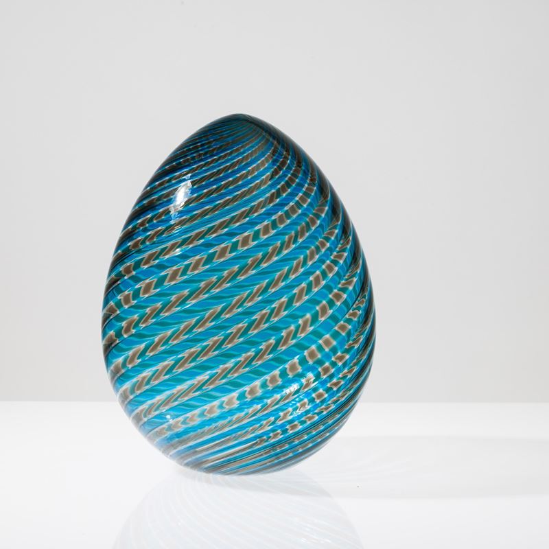 Soprammobile in forma di uovo in vetro soffiato con decoro di canne talpa, acquamare e cristallo a spirale.