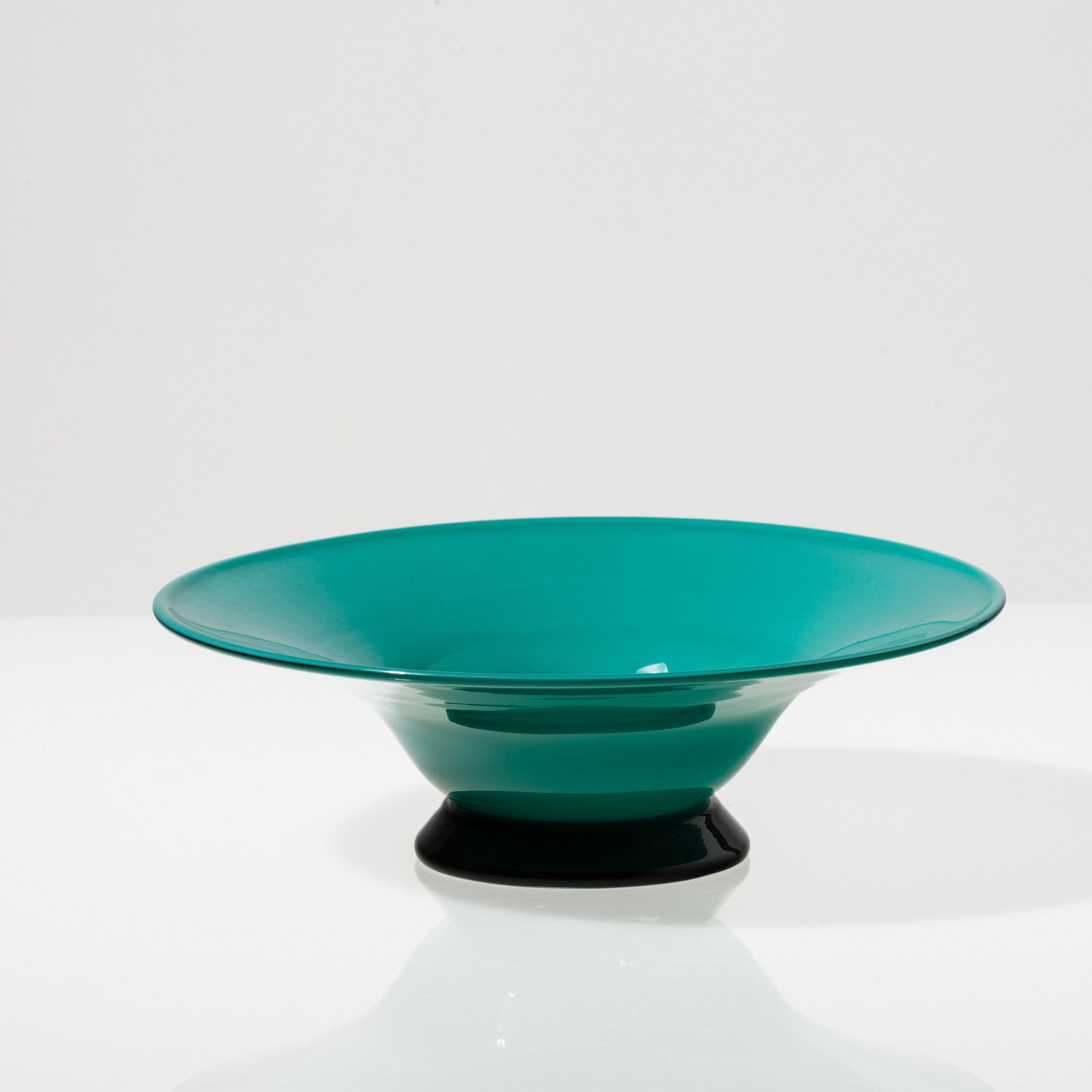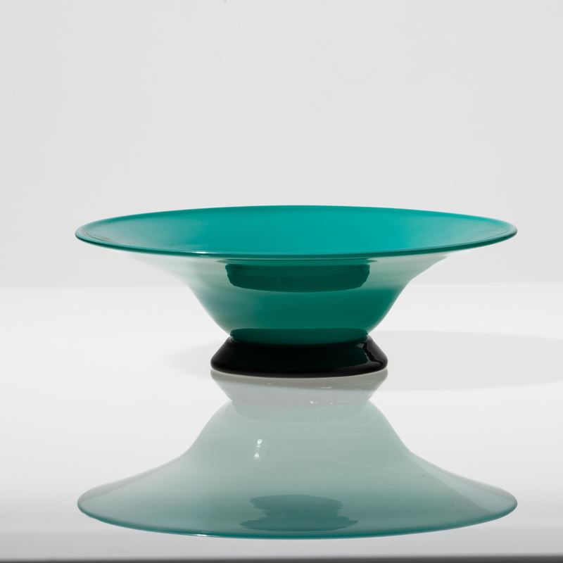 Coppa serie Anni Trenta in vetro soffiato opalino verde su piede troncoconico nero.