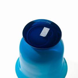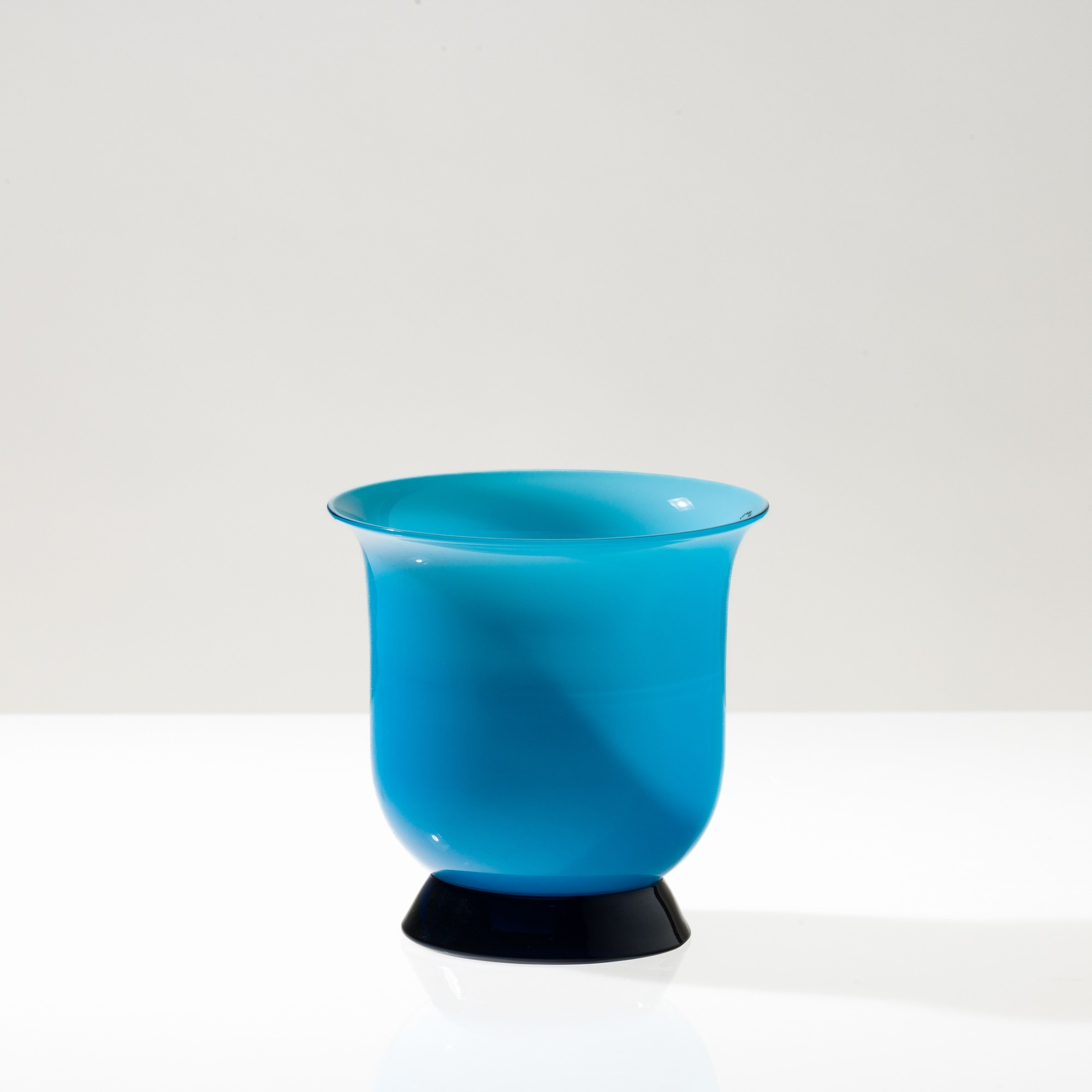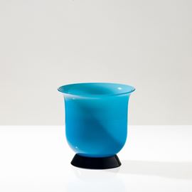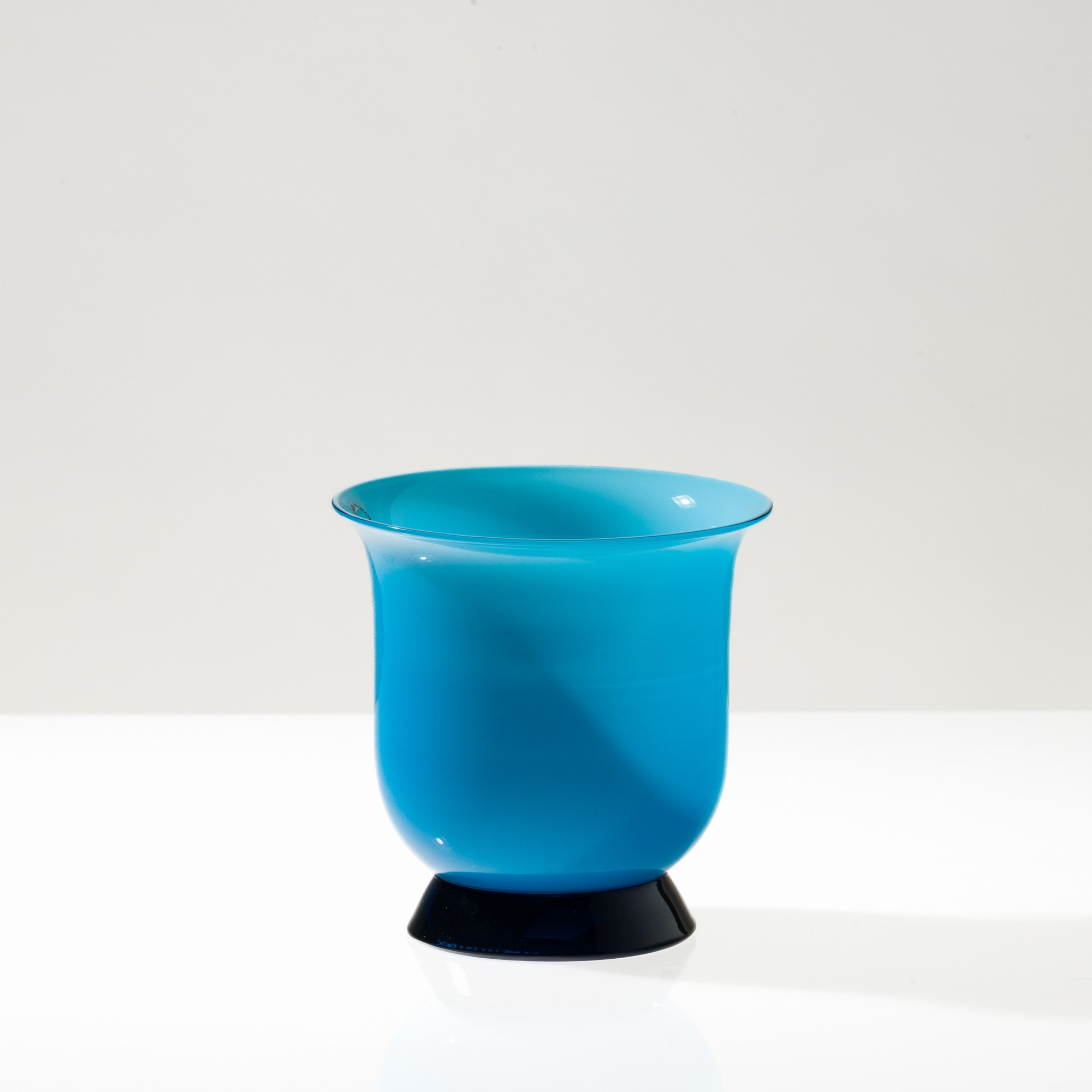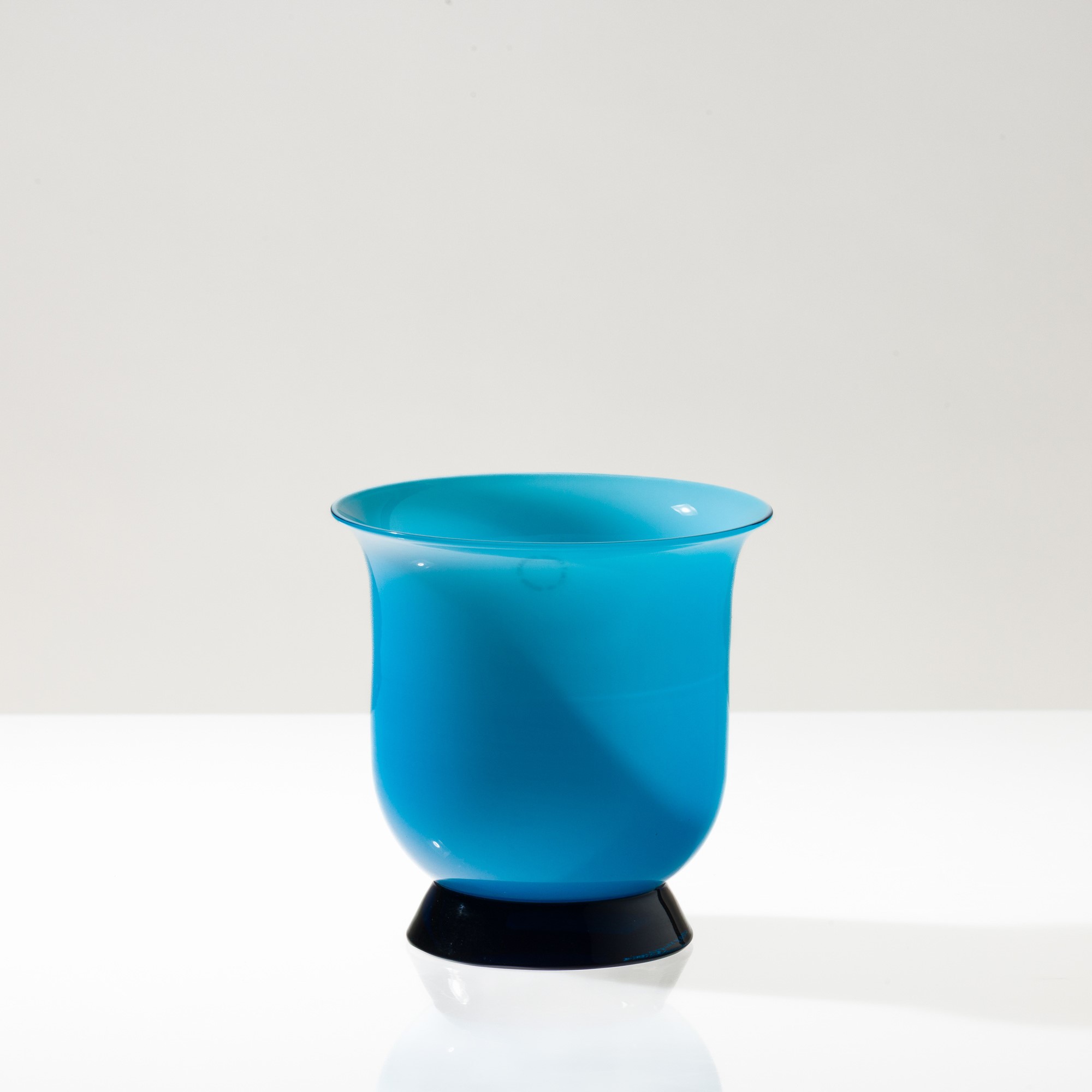 Vaso serie Anni Trenta in vetro soffiato opalino acquamare su piede troncoconico zaffiro.