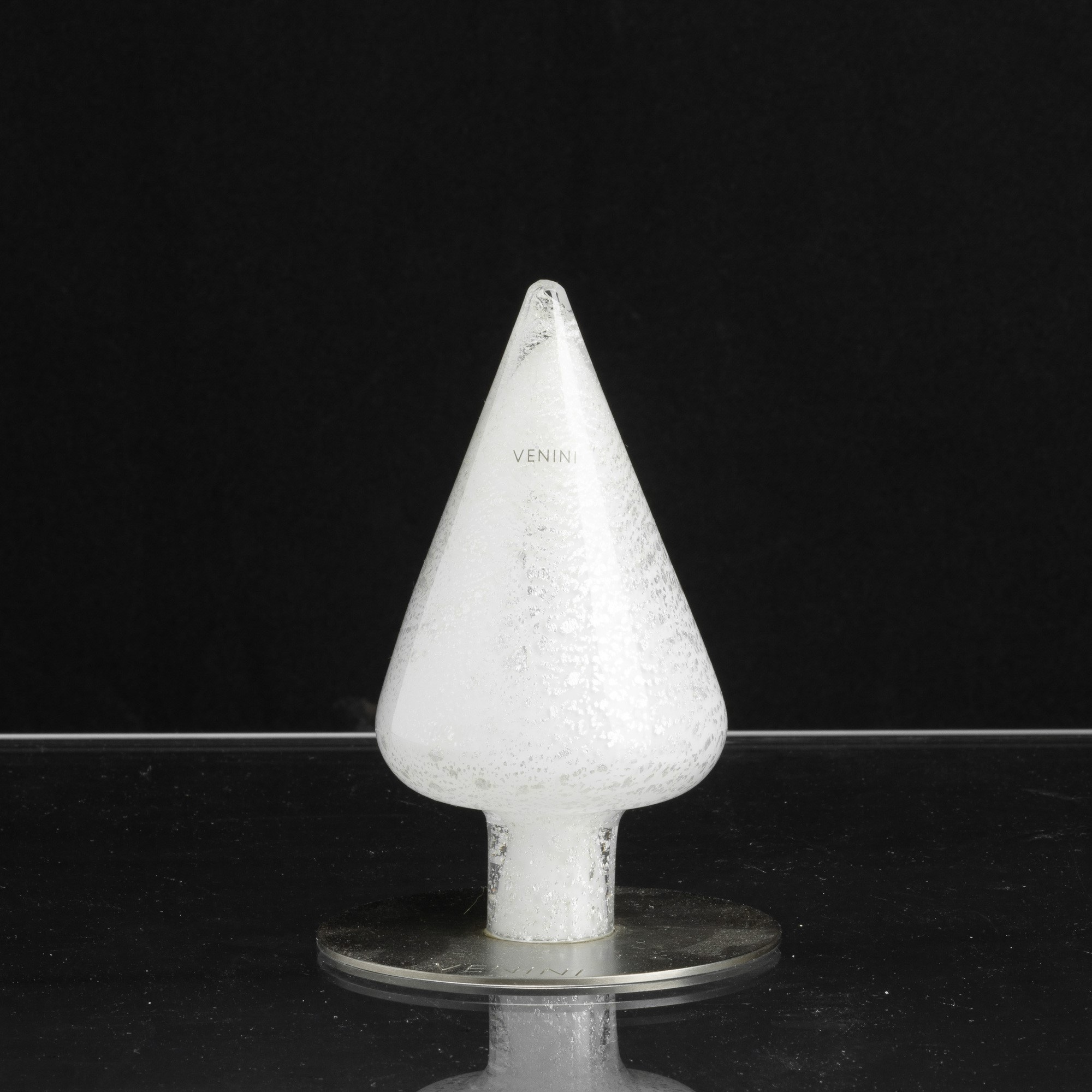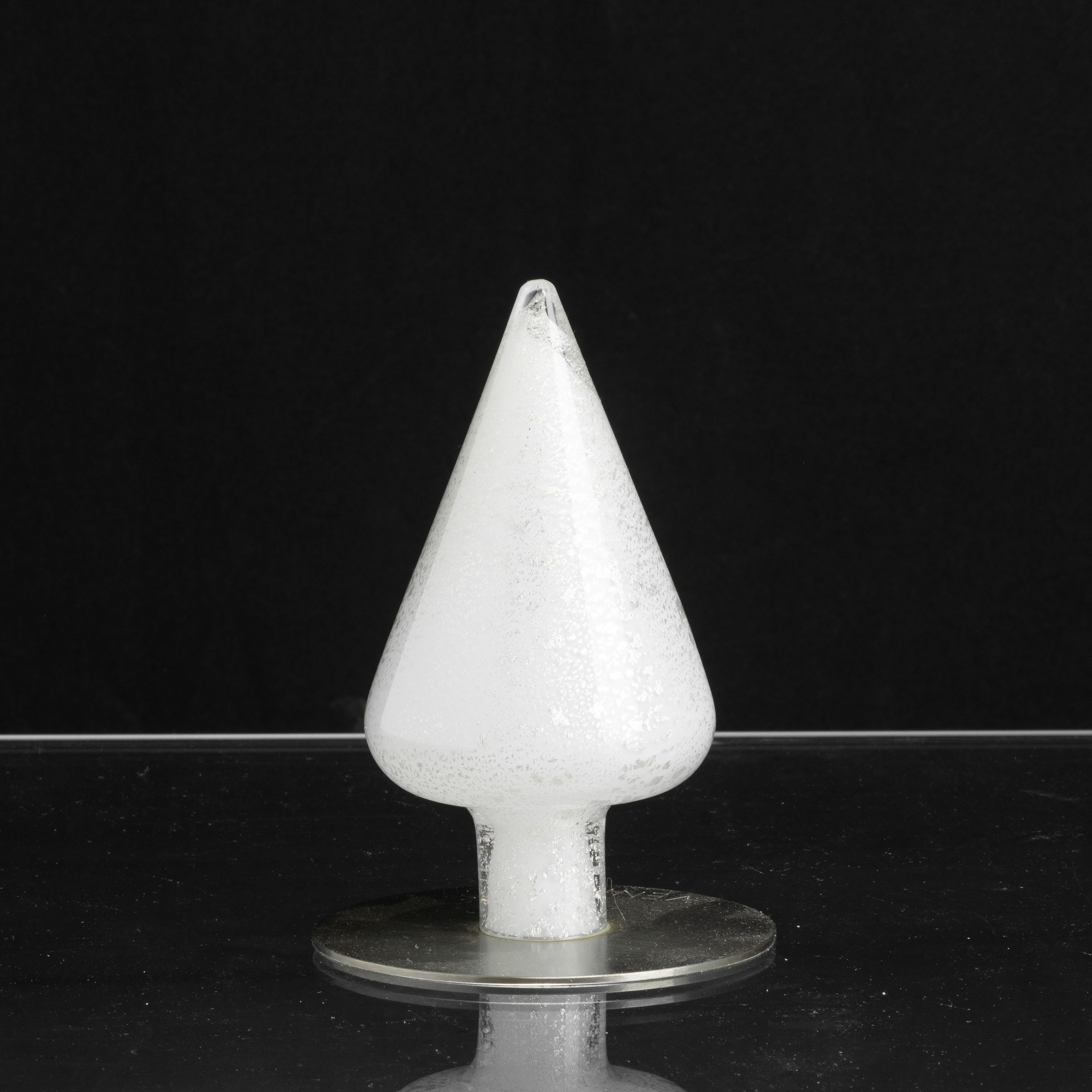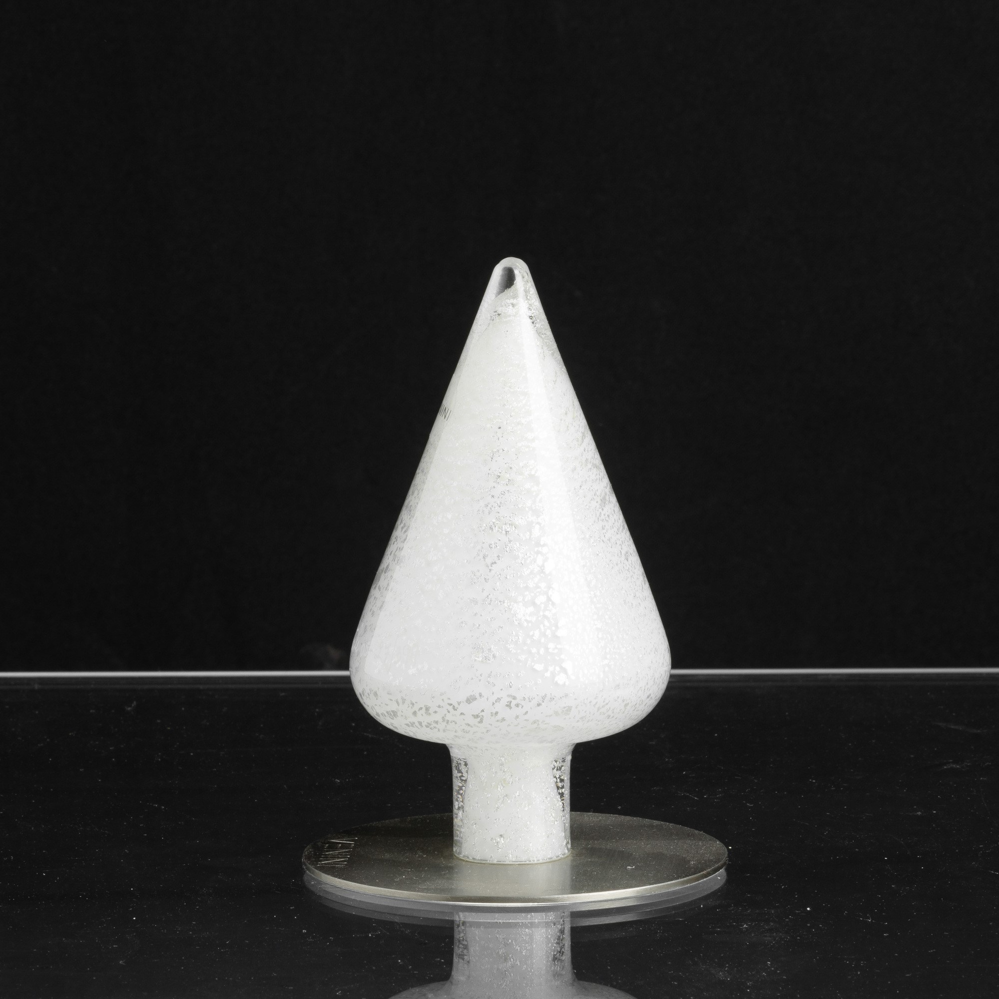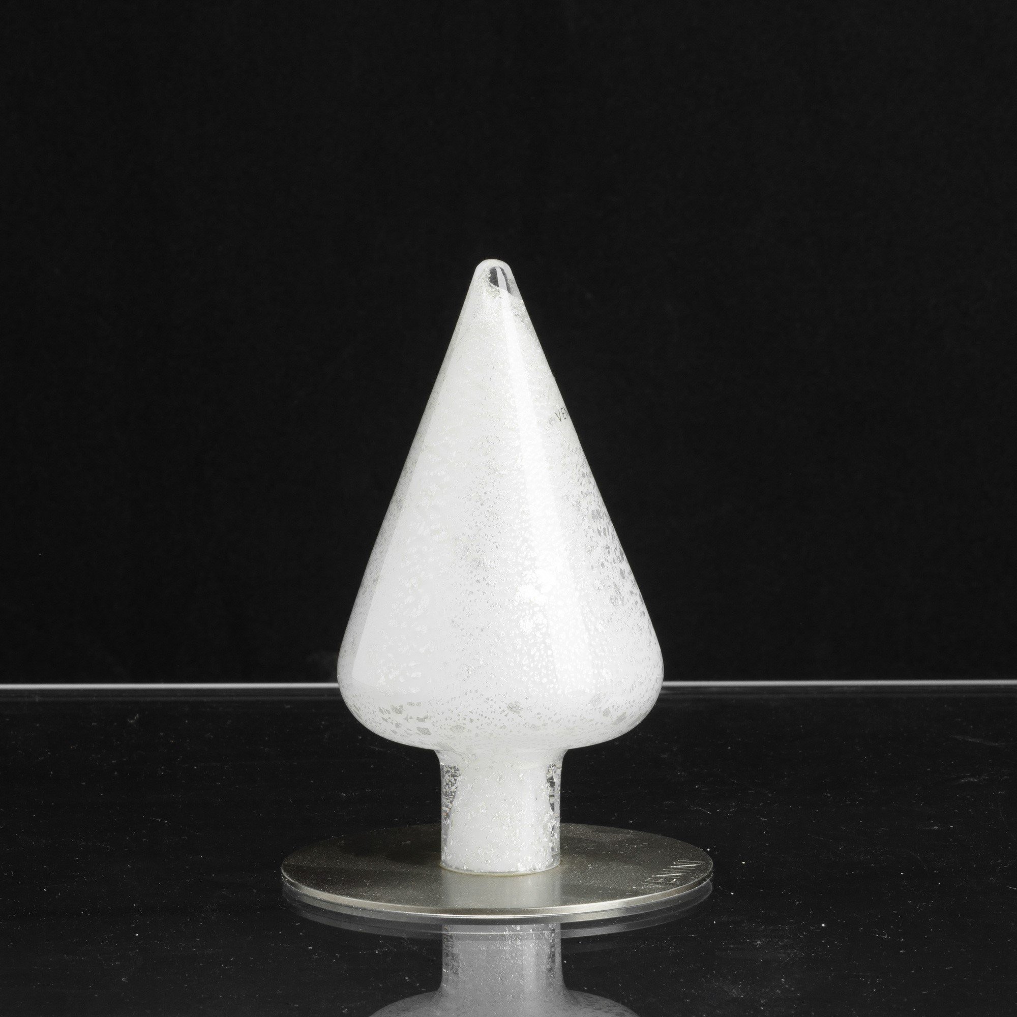 Soprammobile in forma di albero di natale in vetro sommerso con decoro di foglia argento. Base in metallo. Firma impressa sulla base e vecchia etichetta.