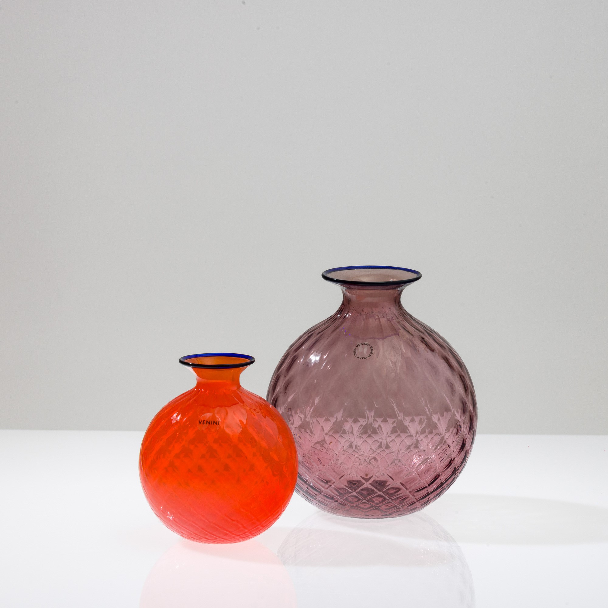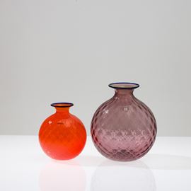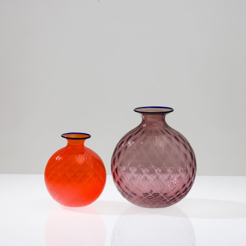 Due vasi sferici serie Balloton in vetro soffiato ciclamino e arancio. Firme a punta Venini 2000, Venini 2006 e vecchie etichette.