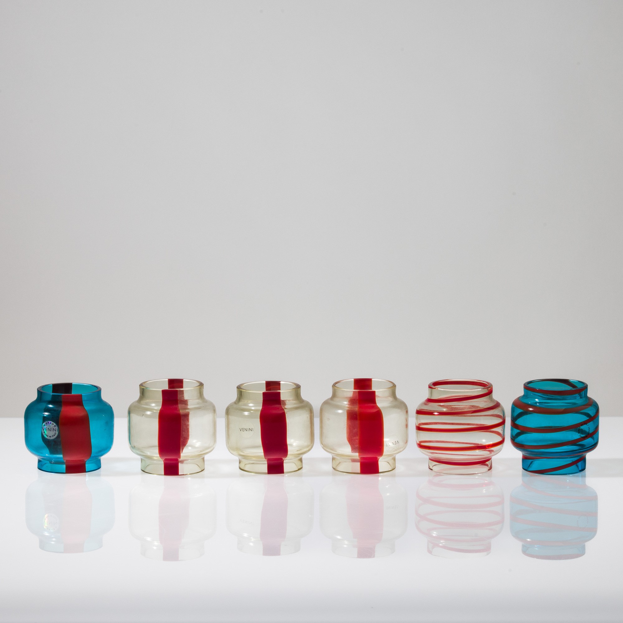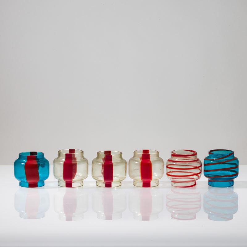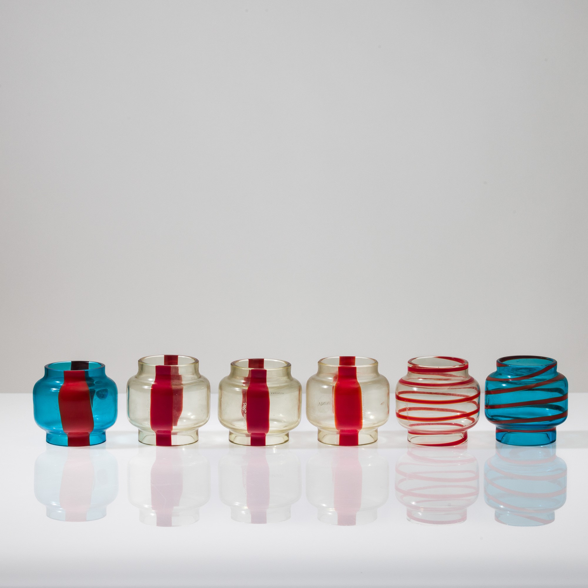 Sei piccoli portacandele in vetro soffiato con decoro di canne e fasce rosse.