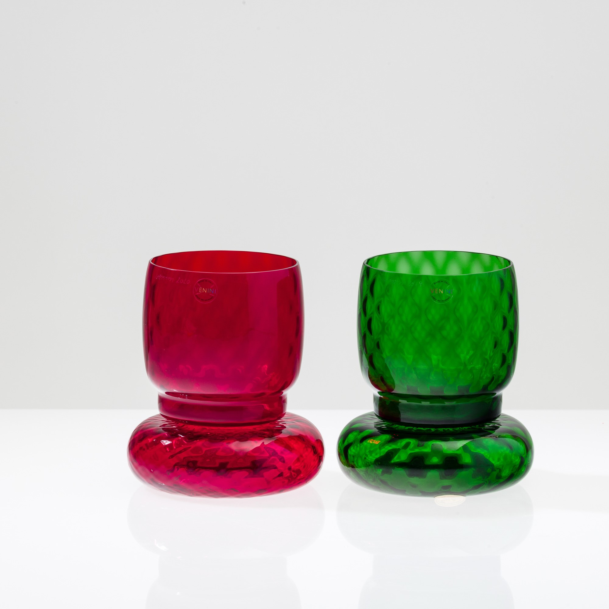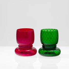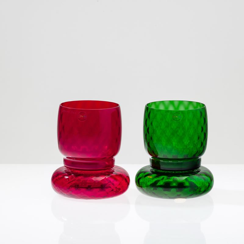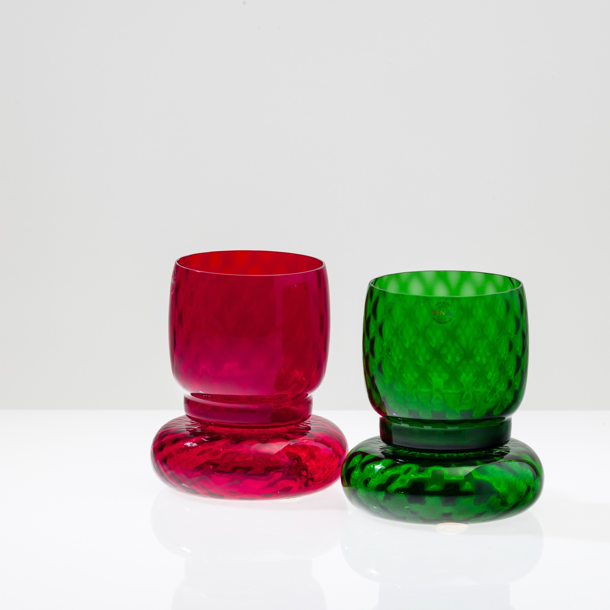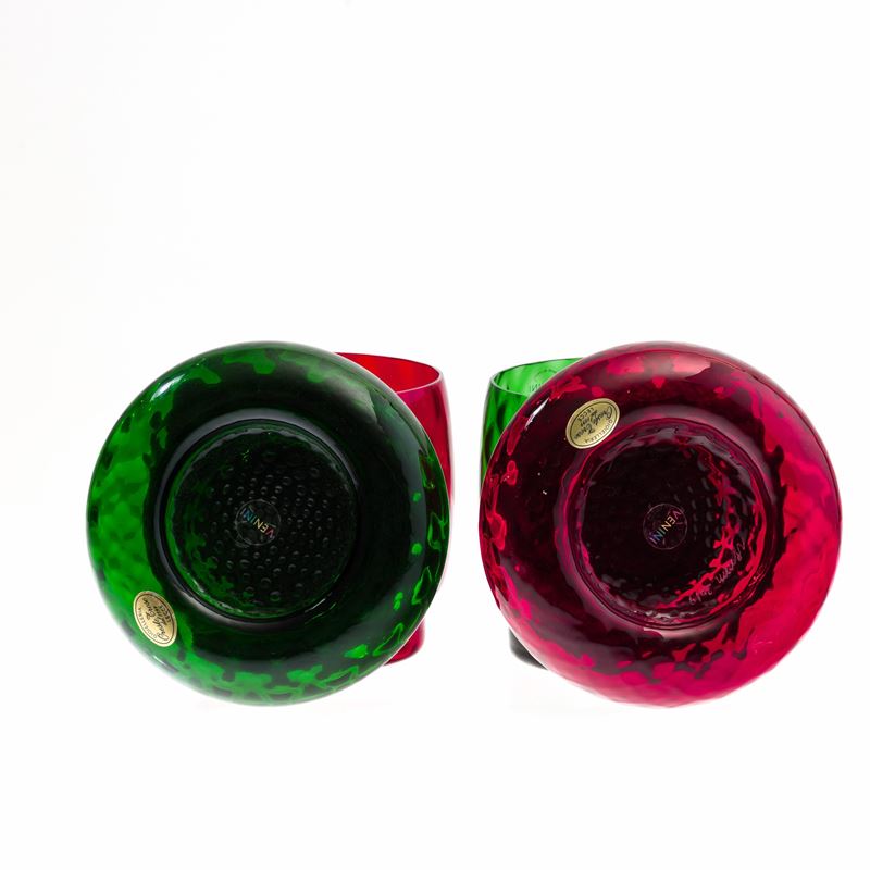 Coppia di portacandele con basamento a ciambella in vetro Balloton rosso e verde.
