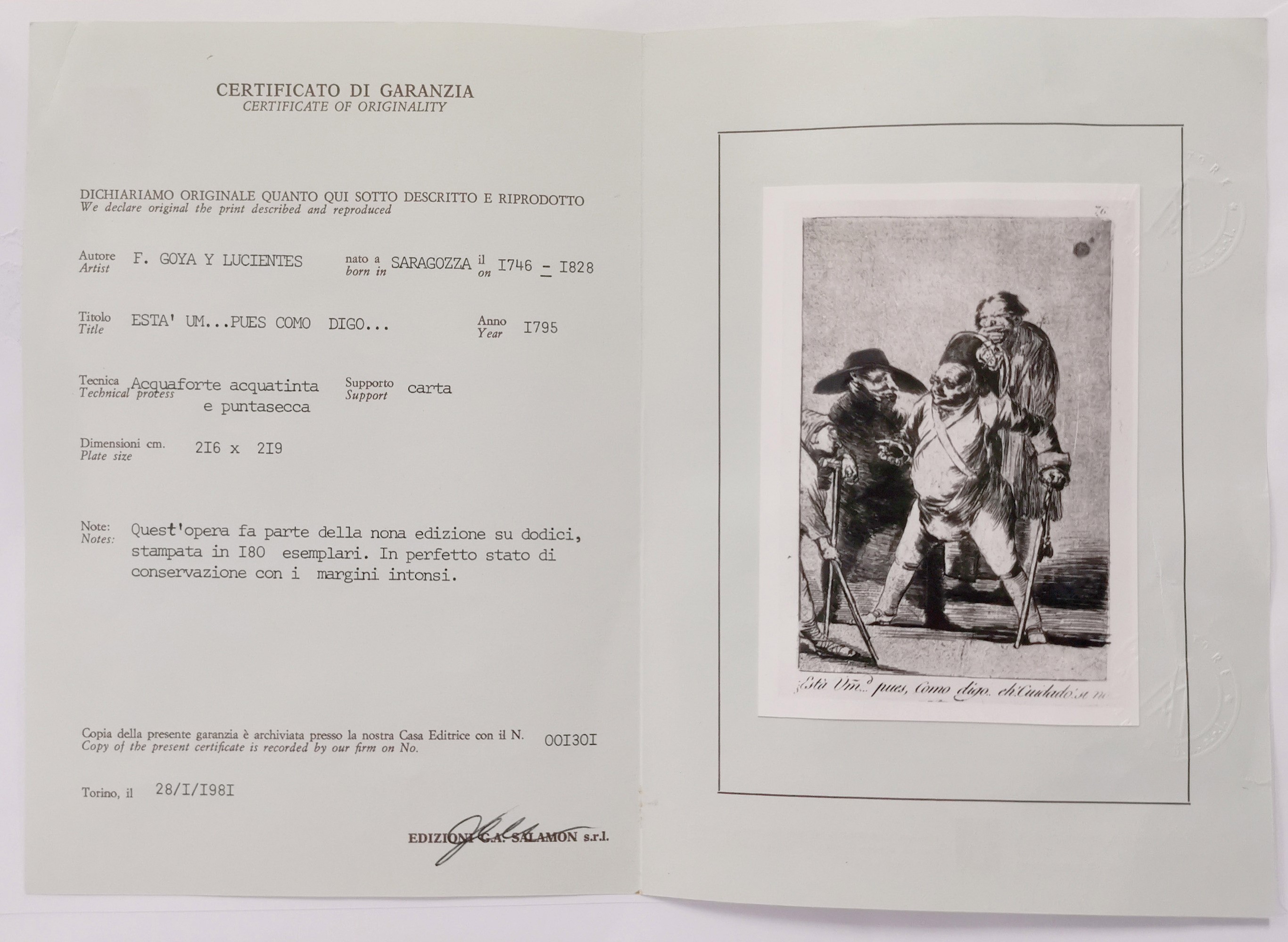 Accompagnata da certificato di garanzia di "Edizioni G.A. Salamon S.r.l." del 1981.