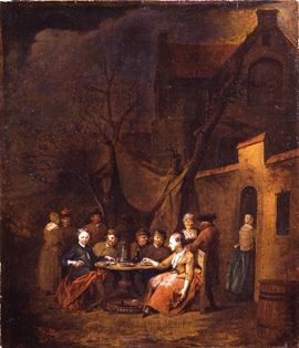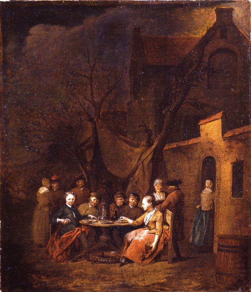 Esterno di locanda con figure attorno a un tavolo