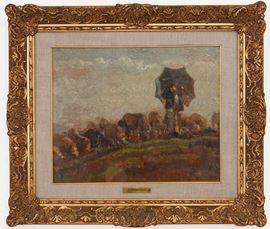 Contadino con ombrello e gregge