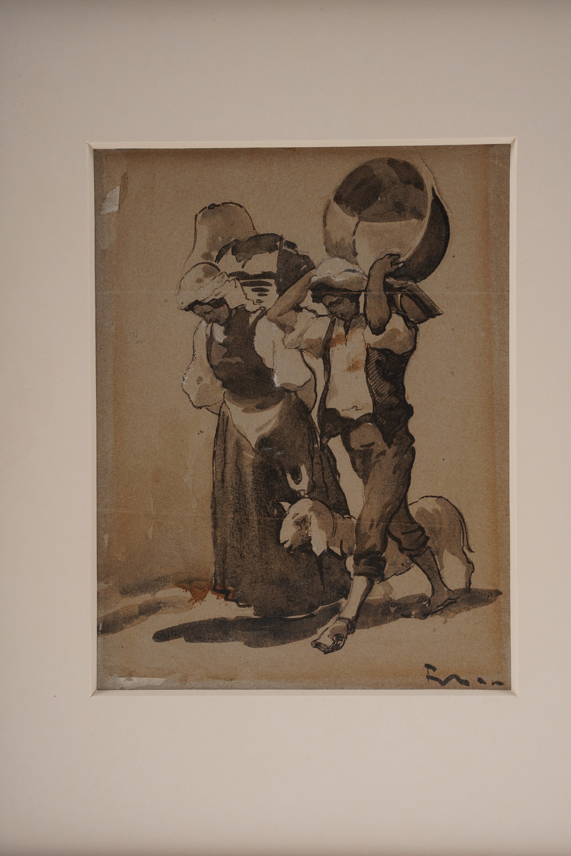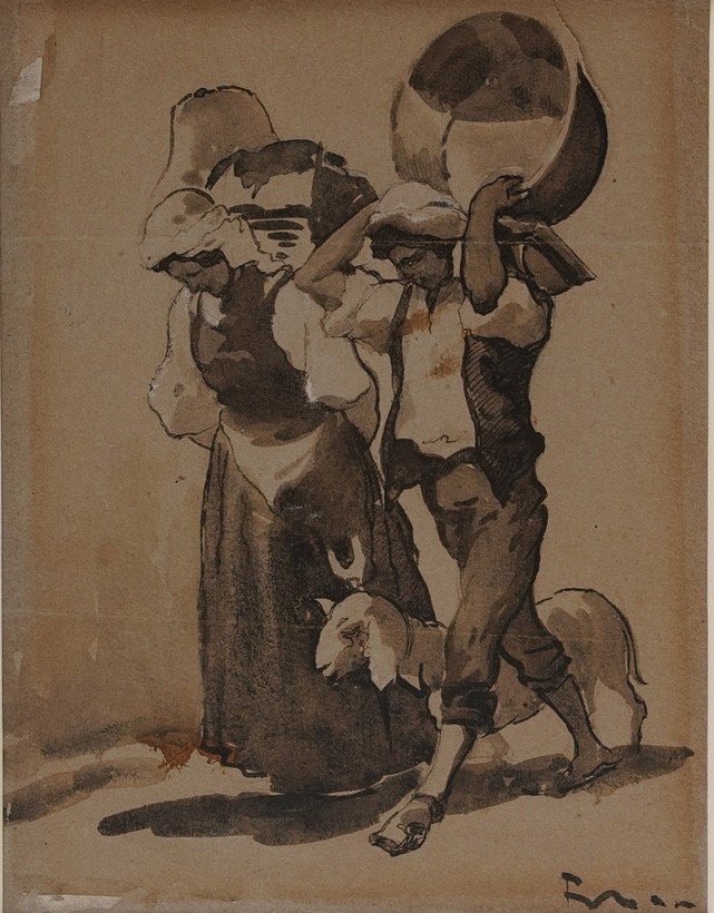 Scena di vita quotidiana: un pastore che porta un secchio e una contadina, tra loro un agnello