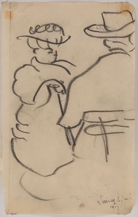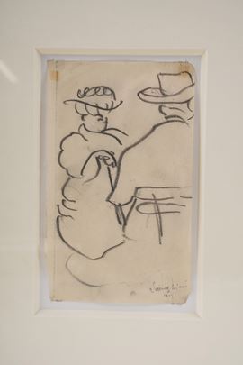 Schizzo a pastello su carta, raffigurante una dama di profilo con cappello e bastone da passeggio seduta, a fianco di un signore di spalle con cilindro e cappa.