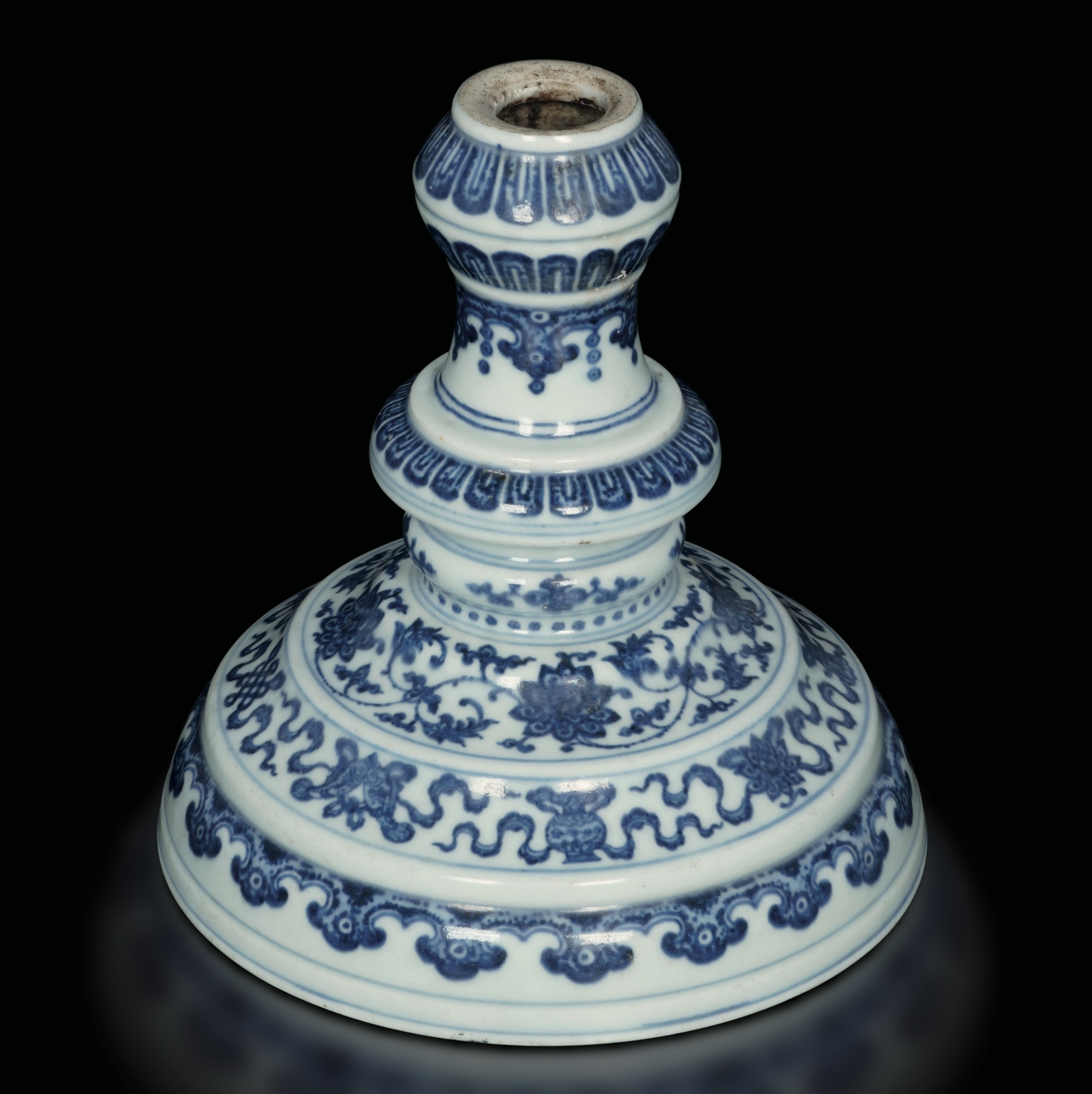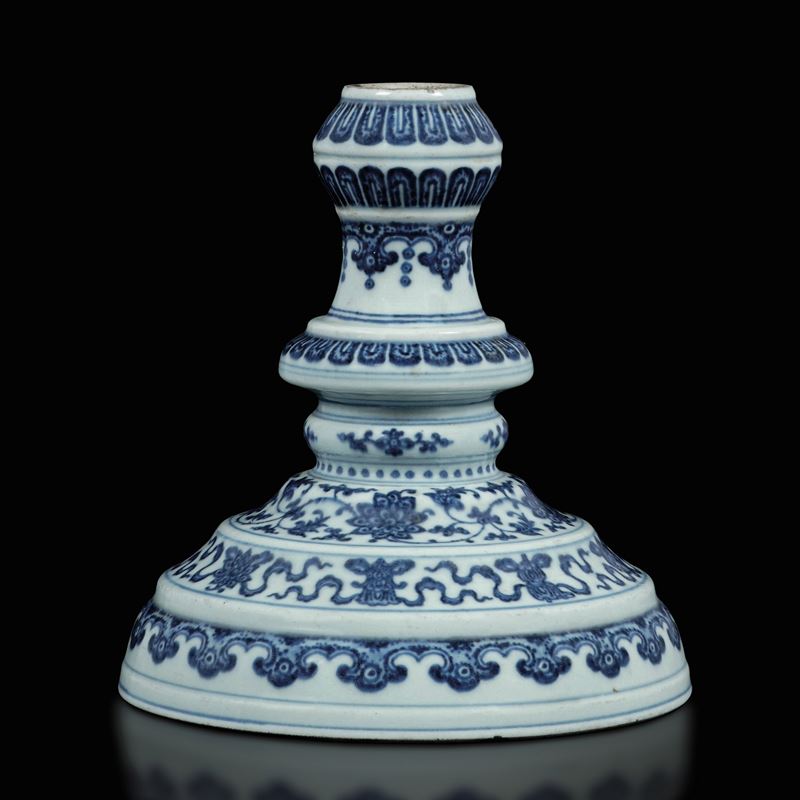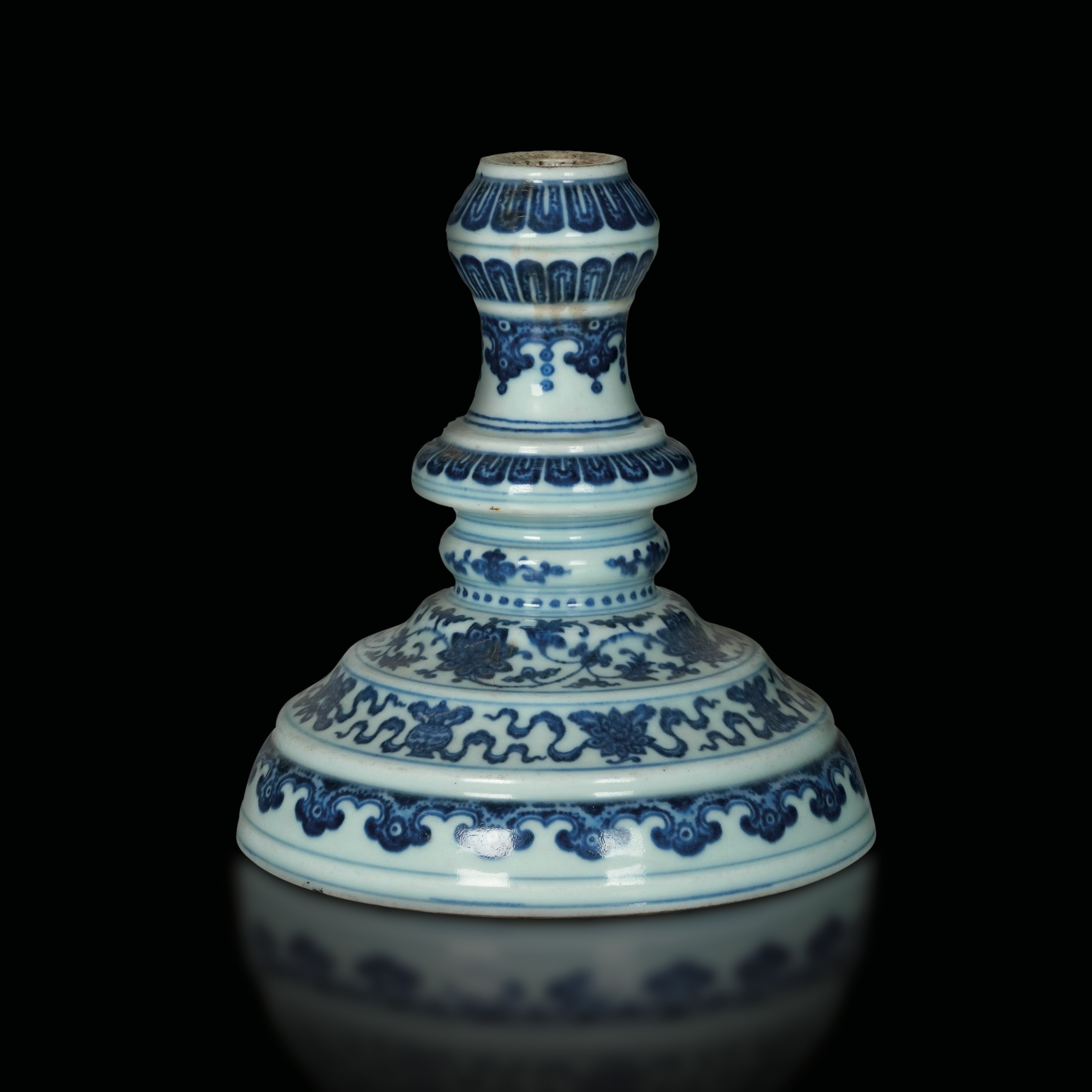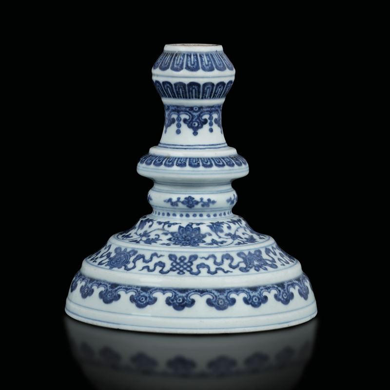 Candeliere in porcellana bianca e blu a motivi floreali, Cina, Dinastia Qing, epoca Qianlong (1736-1796)