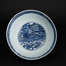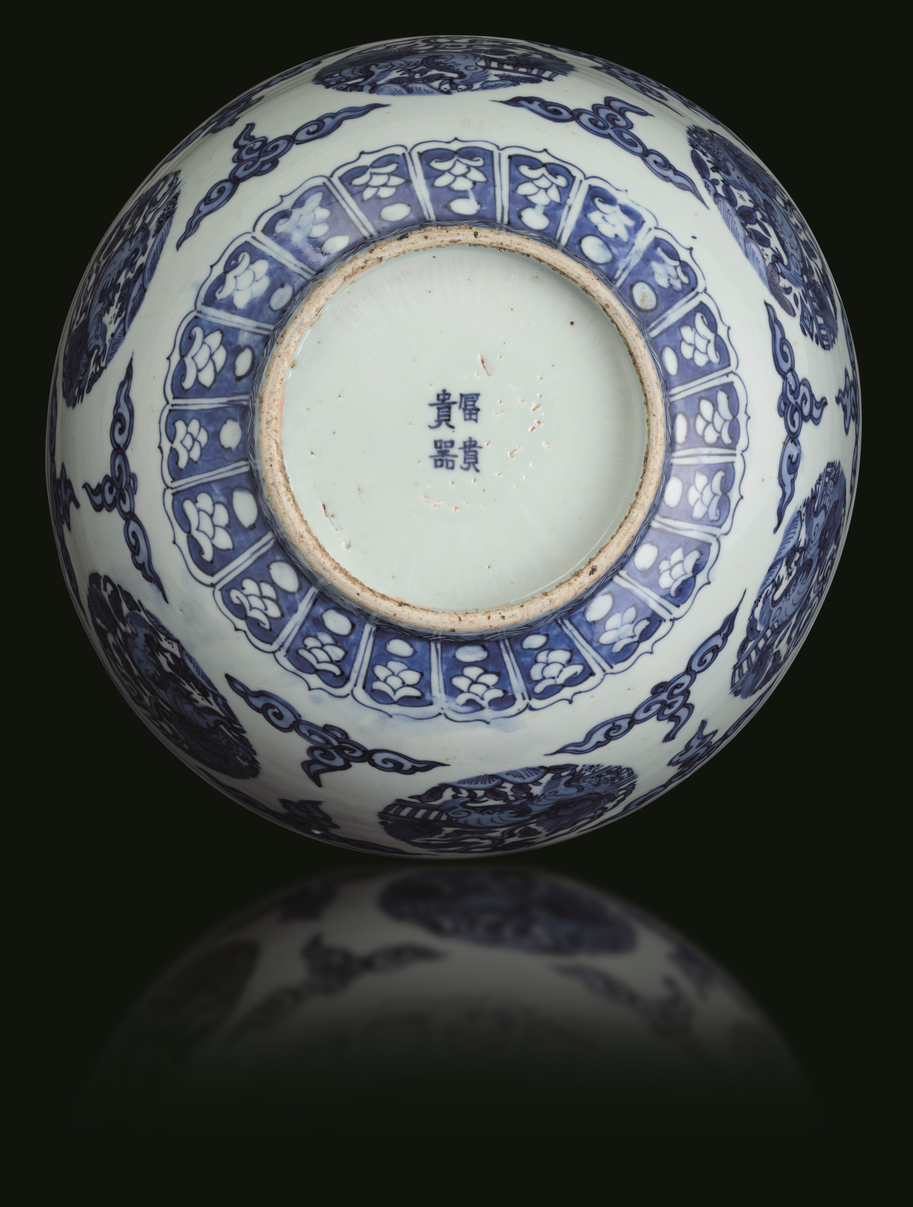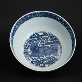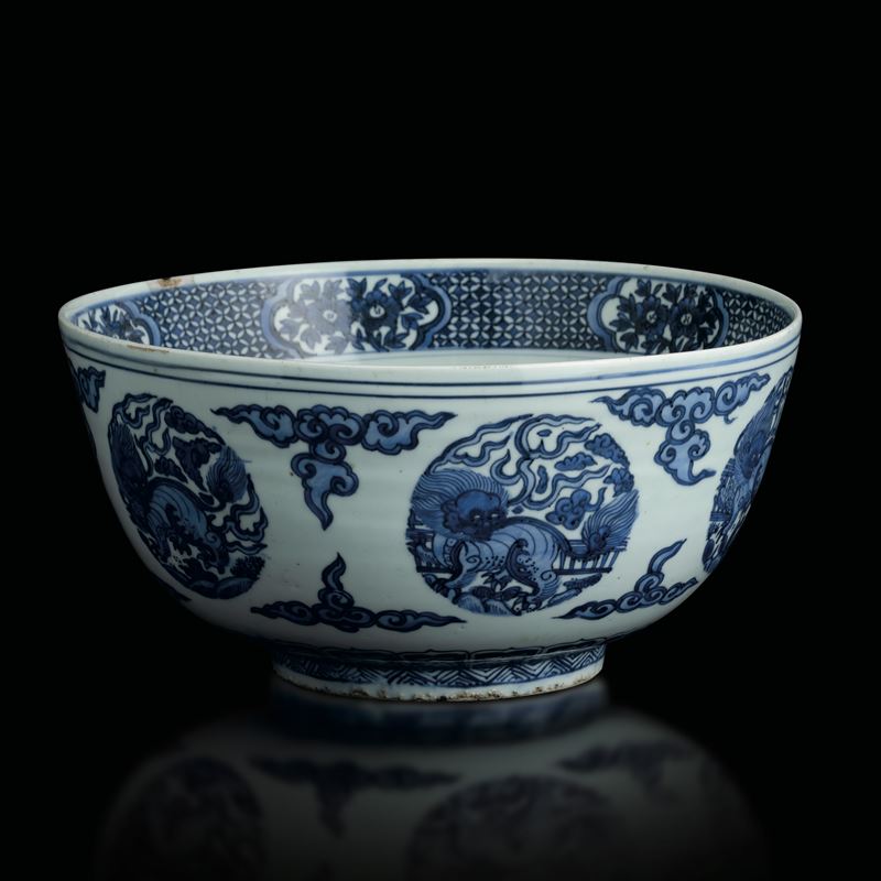 Ciotola in porcellana bianca e blu con motivi naturalistici, Cina, Dinastia Ming, marca Fu Gui Gui Qi