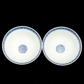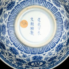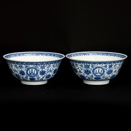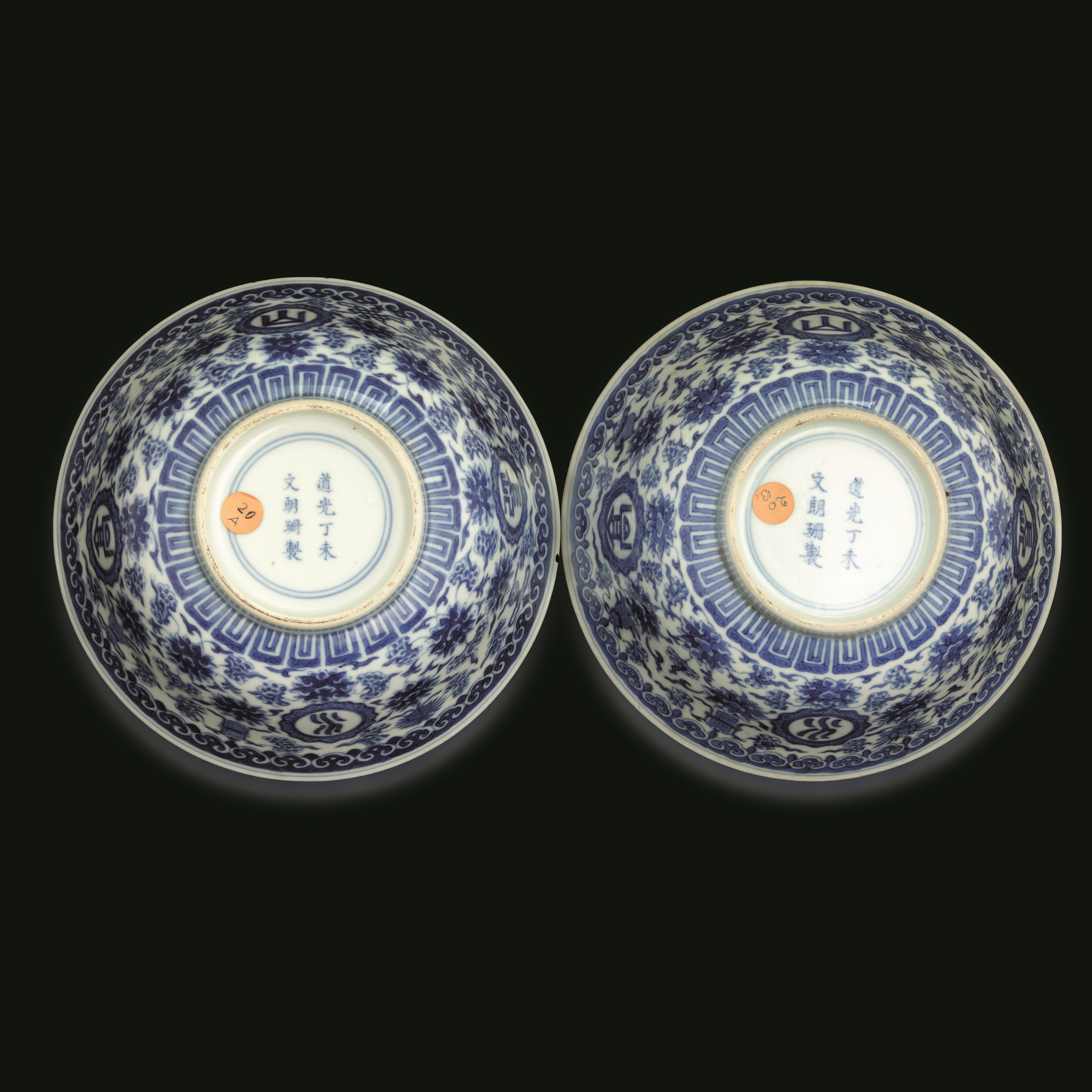 Coppia di ciotole in porcellana bianca e blu a motivi floreali, Cina, Dinastia Qing, marca e del periodo Daoguang Dingwei Wen Lang Shan Zhi: ventisettesimo anno della epoca Daoguang (1821-1850), 1847