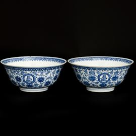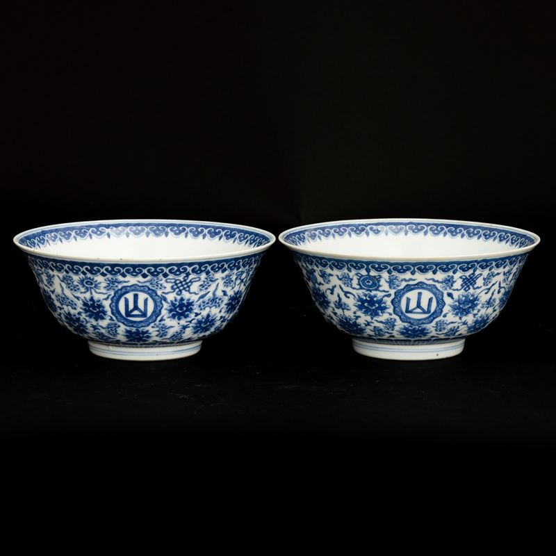 Coppia di ciotole in porcellana bianca e blu a motivi floreali, Cina, Dinastia Qing, marca e del periodo Daoguang Dingwei [..]