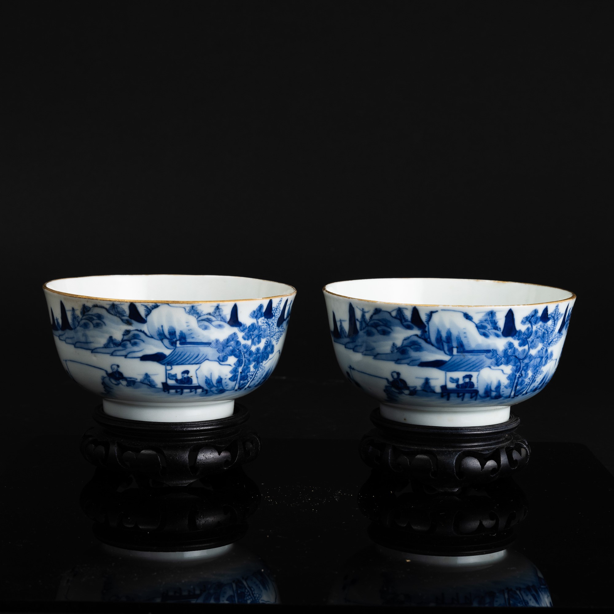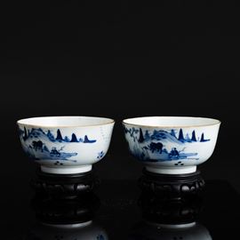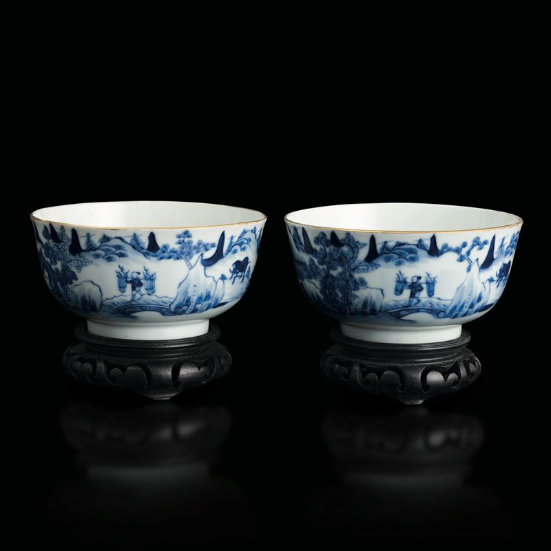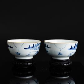 Coppia di ciotole in porcellana bianca e blu a soggetto paesaggistico, Cina, Dinastia Qing, marchio e del periodo Guangxu (1875-1908)