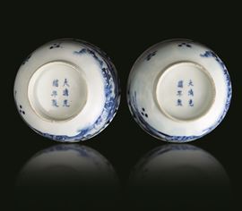 Coppia di ciotole in porcellana bianca e blu a soggetto paesaggistico, Cina, Dinastia Qing, marchio e del periodo Guangxu [..]