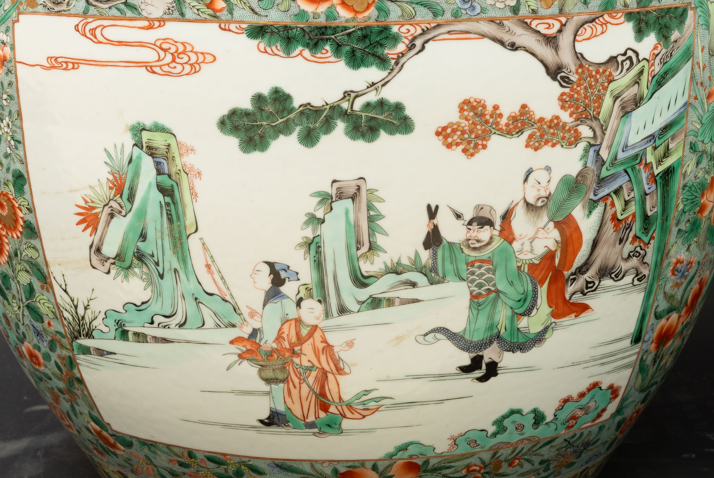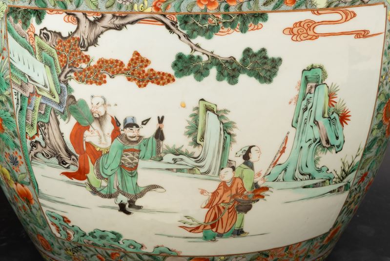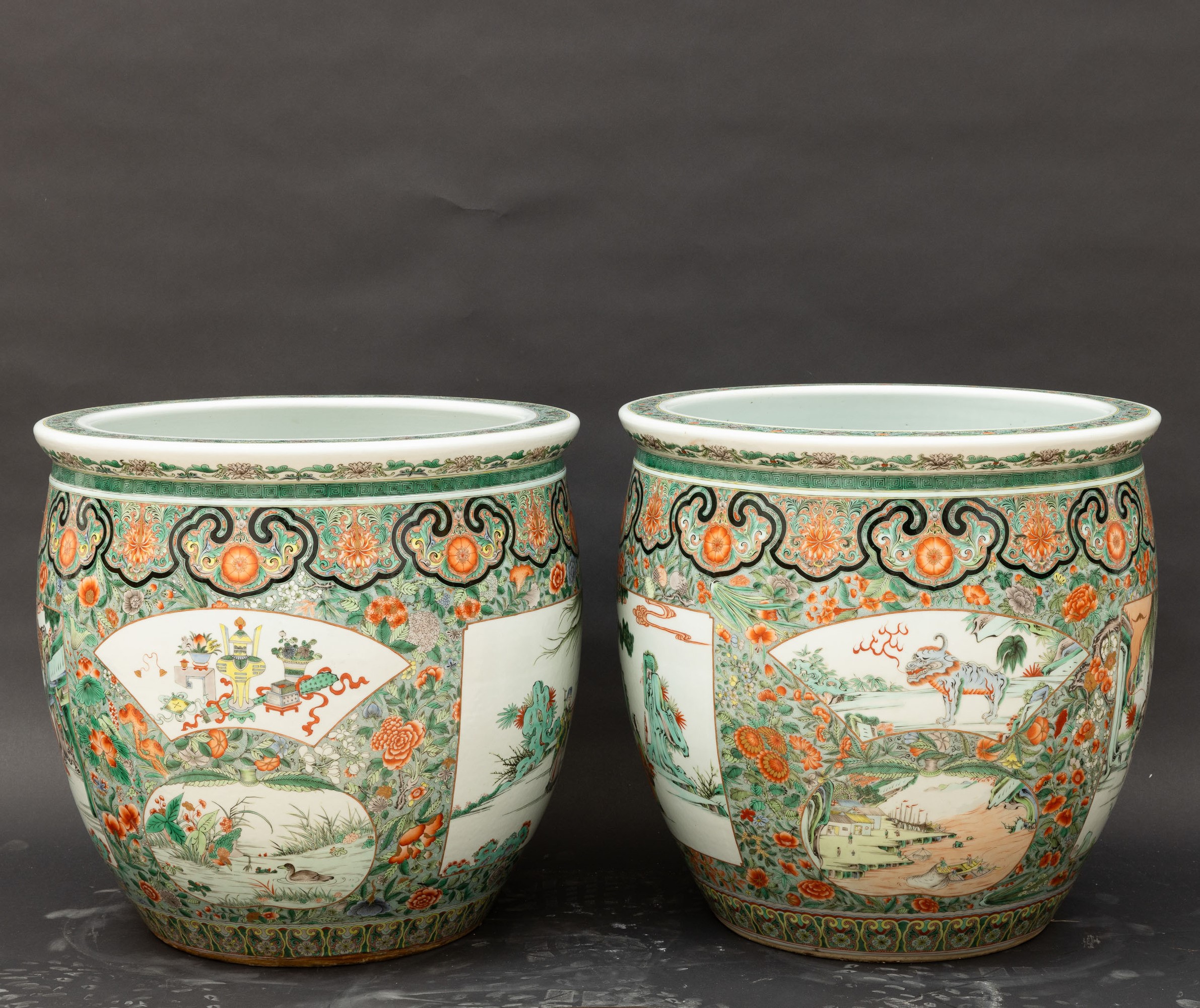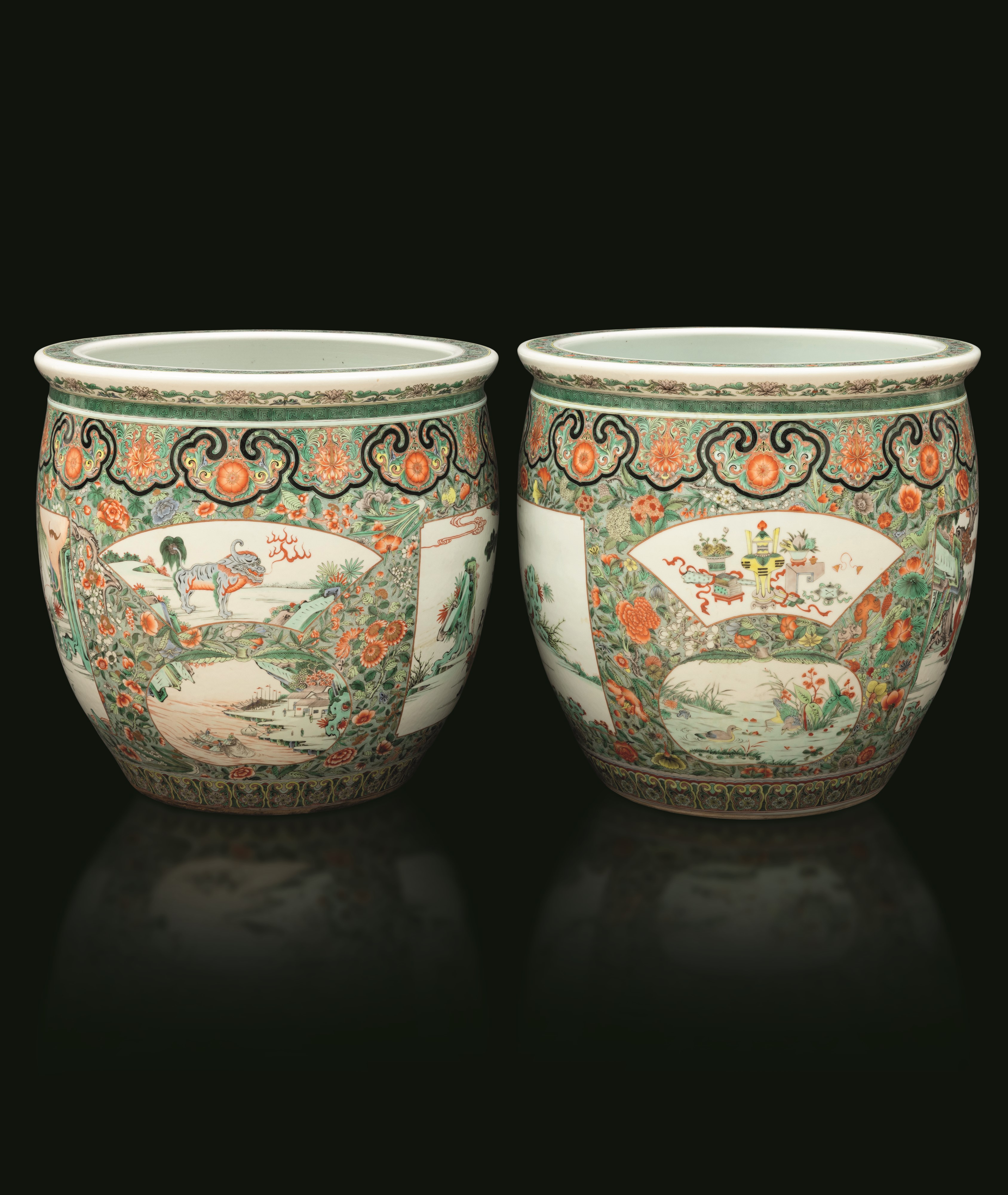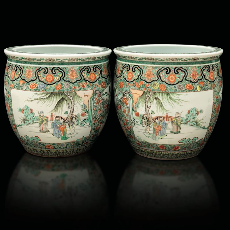 Coppia di grandi Cachepot in porcellana Famiglia Verde raffiguranti scene di corte entro riserve e decori floreali, Cina, Dinastia Qing, epoca Guangxu (1875-1908)
