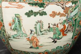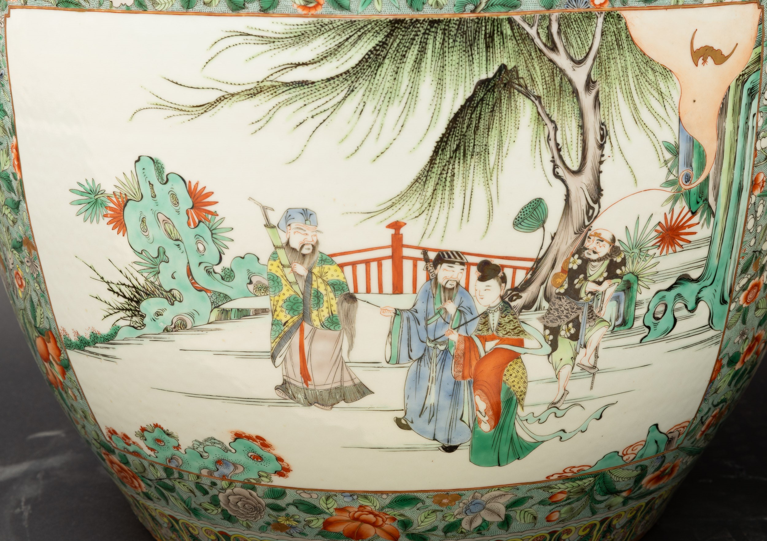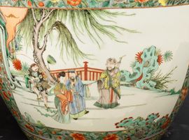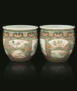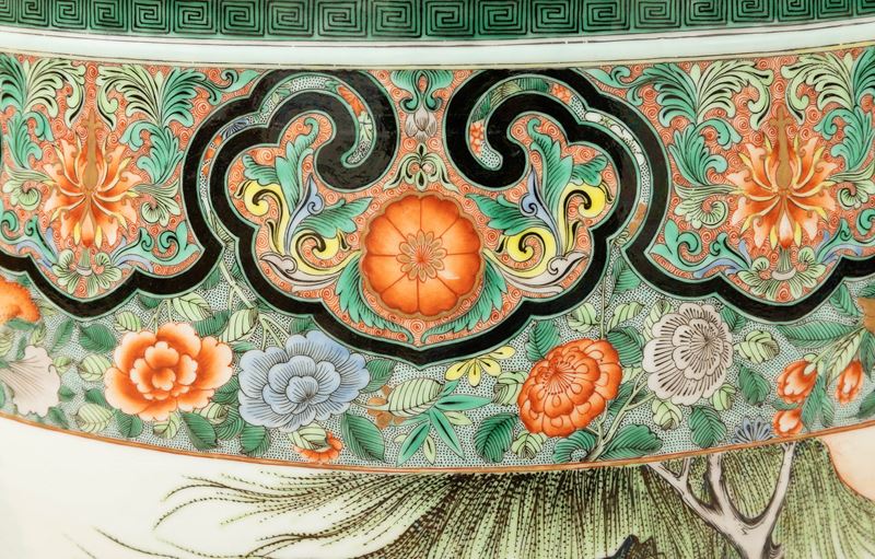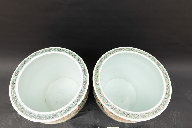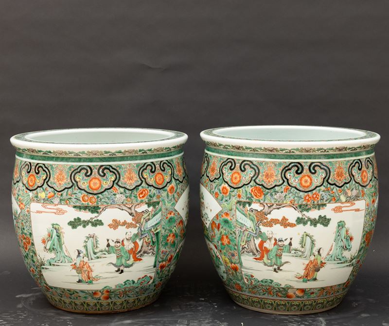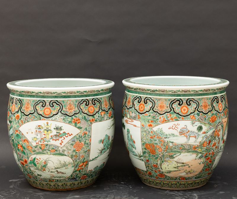 Coppia di grandi Cachepot in porcellana Famiglia Verde raffiguranti scene di corte entro riserve e decori floreali, Cina, [..]