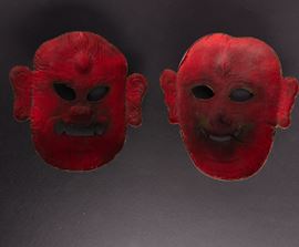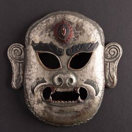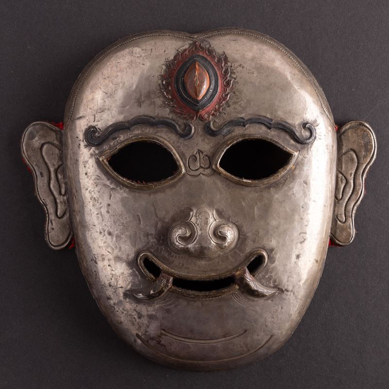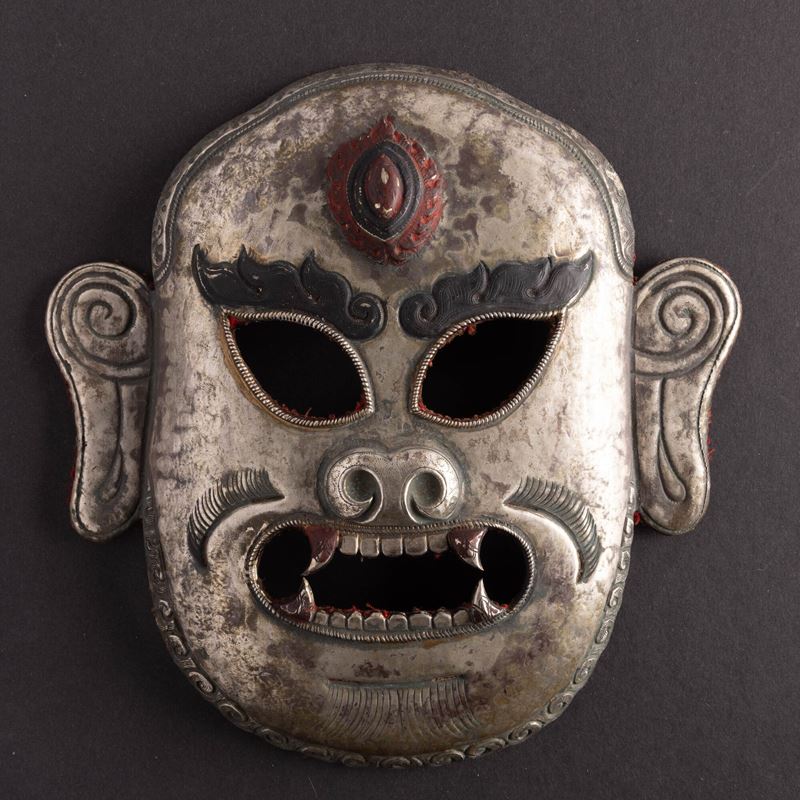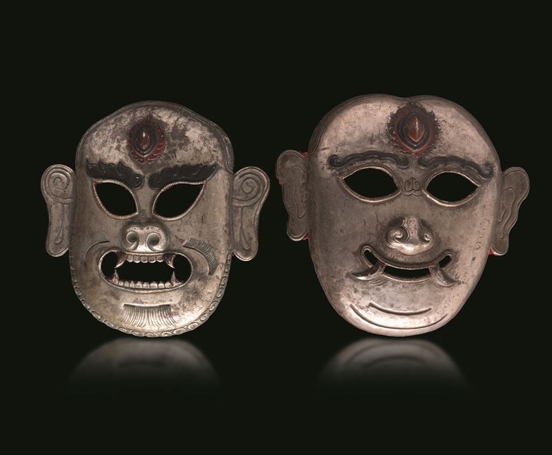 Coppia di maschere in lamina di argento, con tracce di doratura e parzialmente dipinte, Tibet, XIX secolo