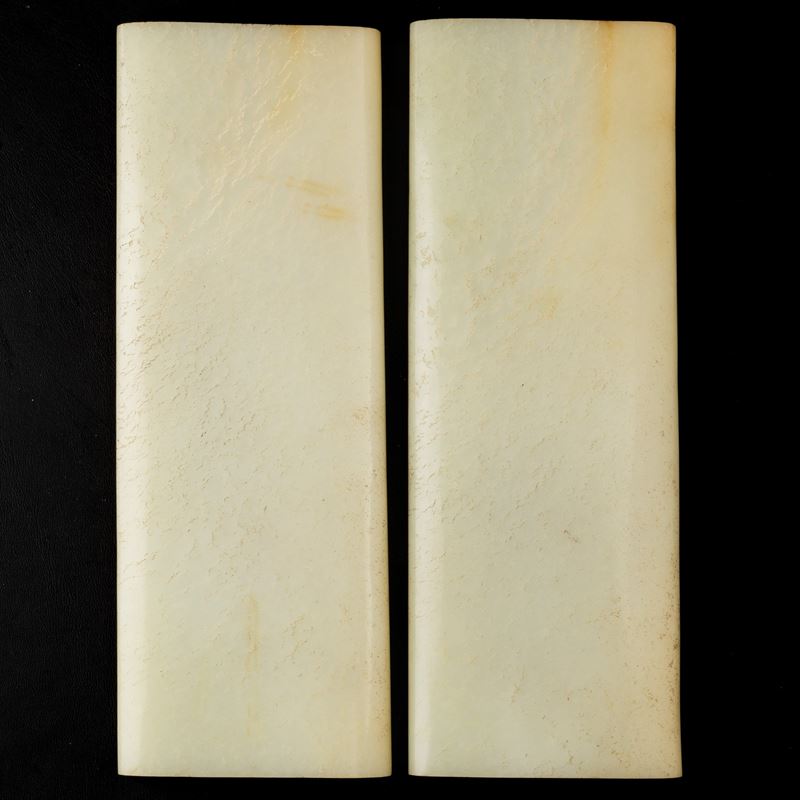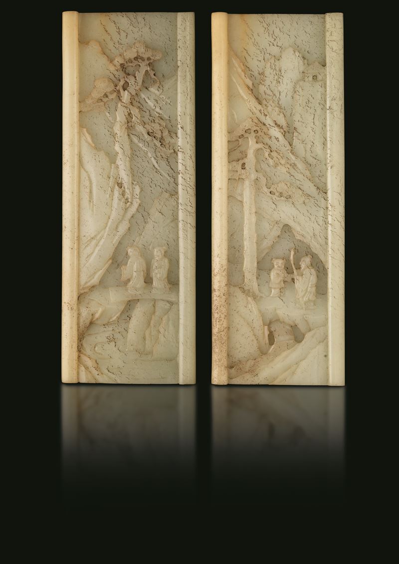 Coppia di placche in giada bianca con scene di paesaggio montano e personaggi a rilievo, Cina, Dinastia Qing, XIX secolo