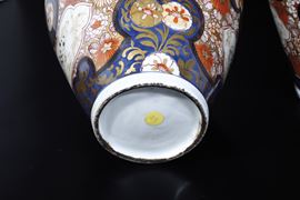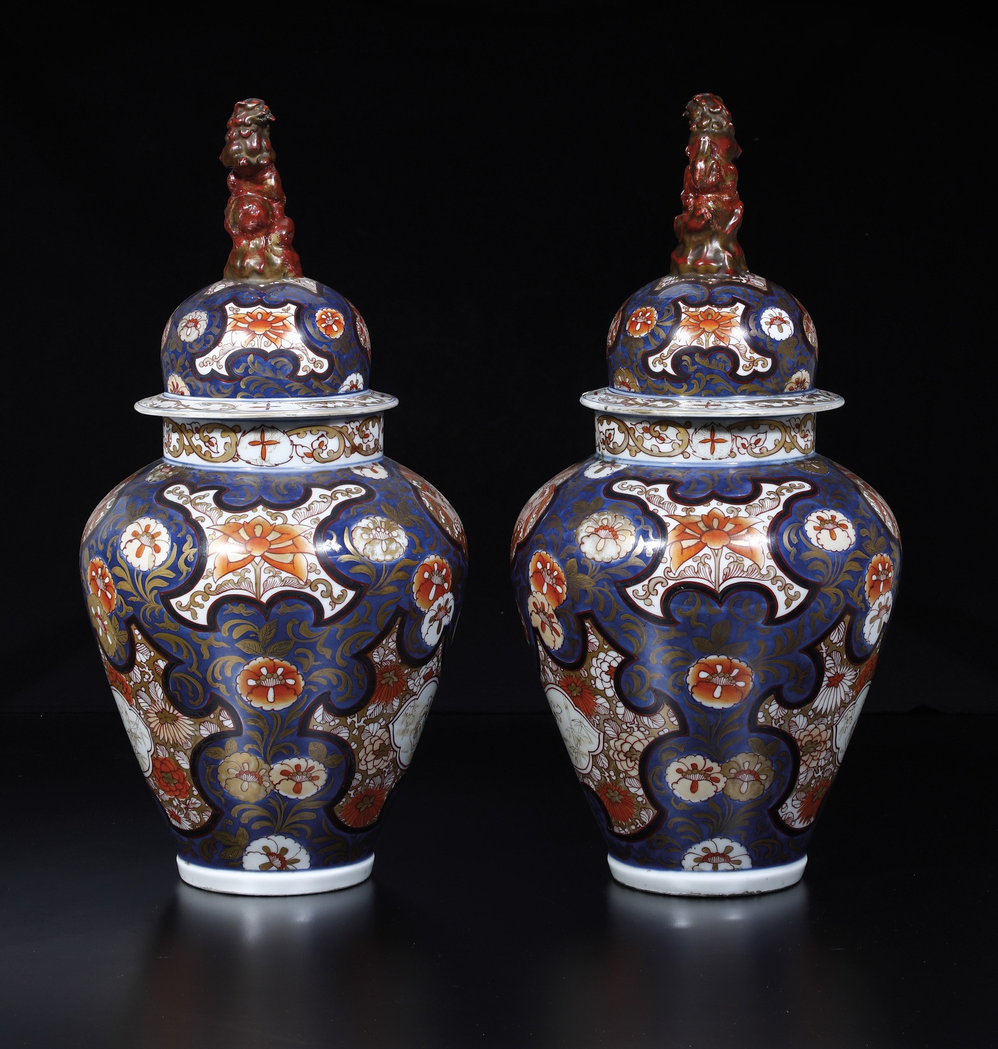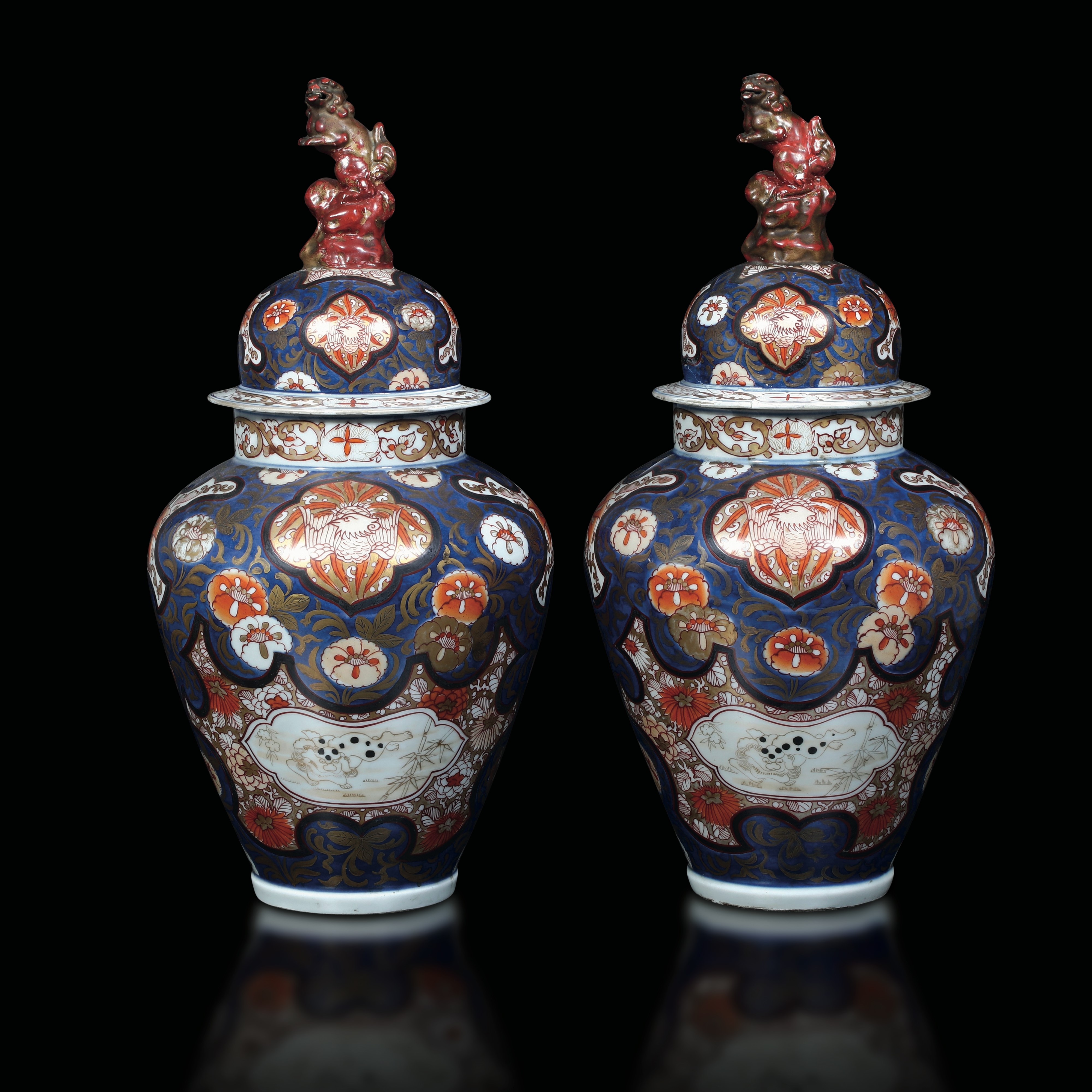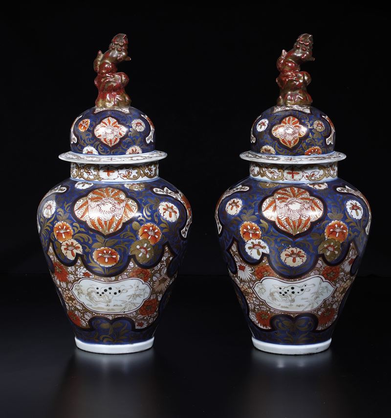 Coppia di potiche in porcellana Imari Arita con presa del coperchio a foggia di Cani di Pho , Giappone, fine XVII secolo