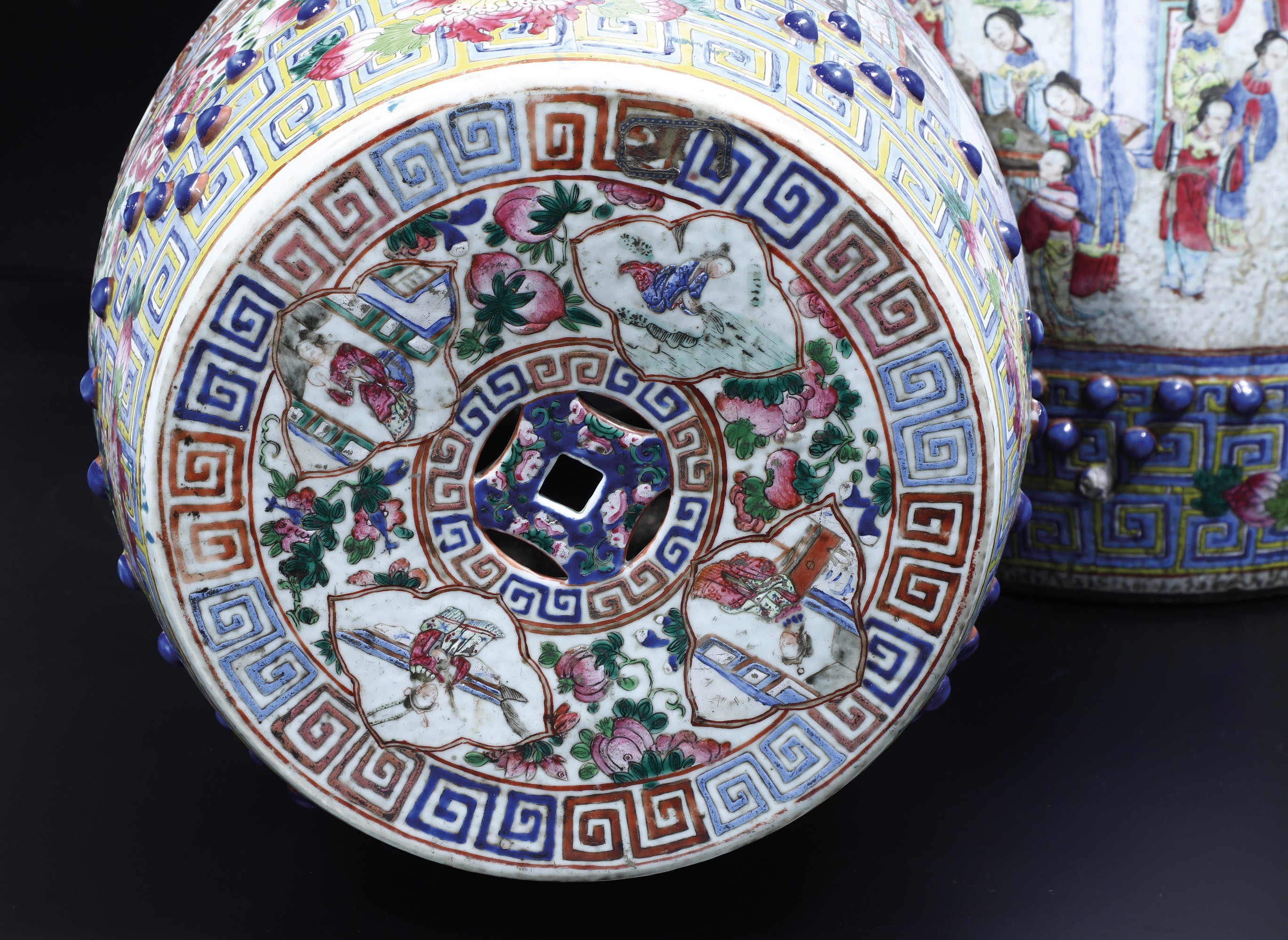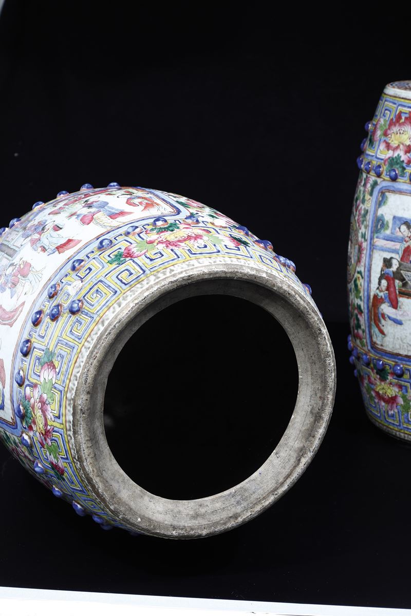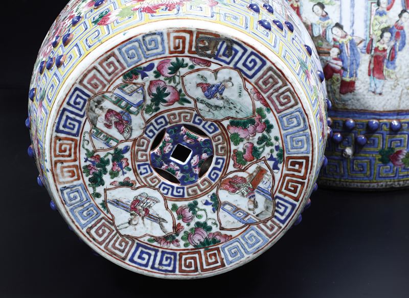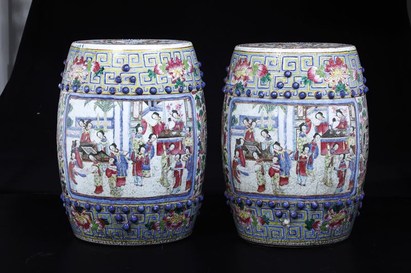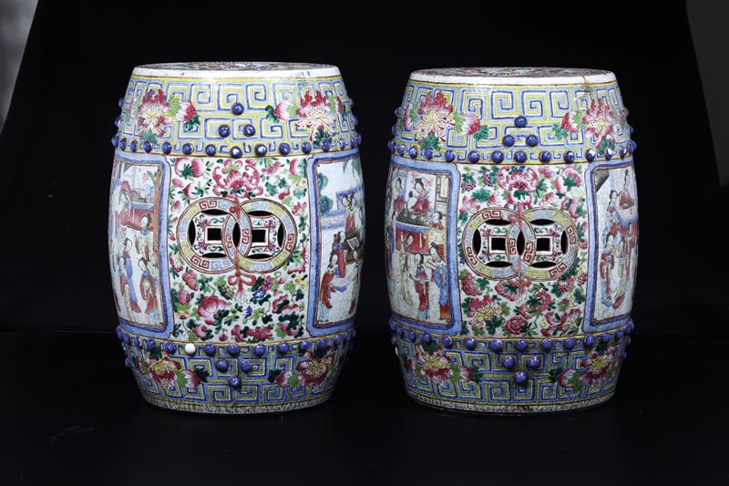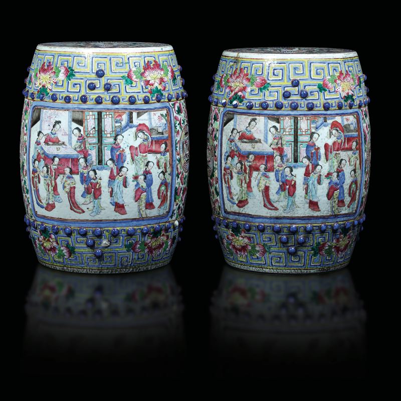 Coppia di sgabelli in porcellana Famiglia Rosa raffigurante scena di corte, Cina, Dinastia Qing, XIX secolo