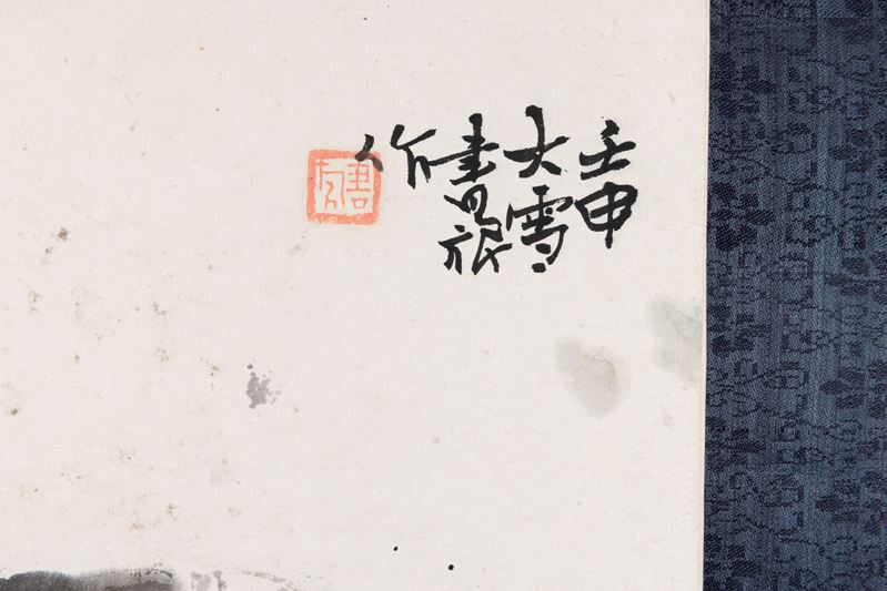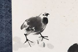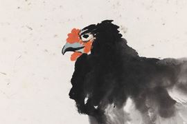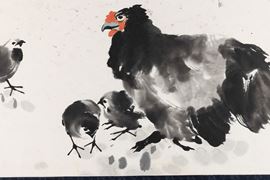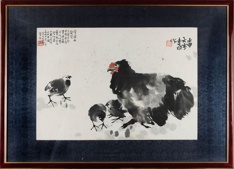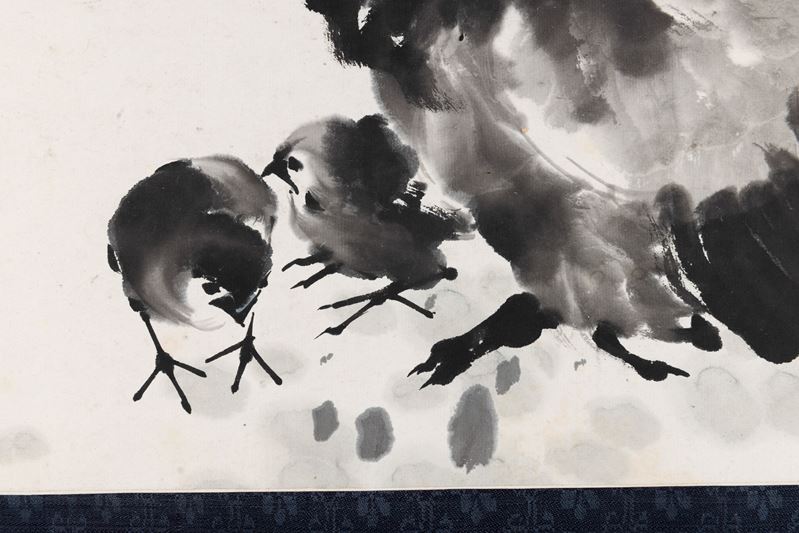 Dipinto raffigurante gallina con pulcini e iscrizioni, Xu Bei Hong (1895-1953), inchiostro su carta