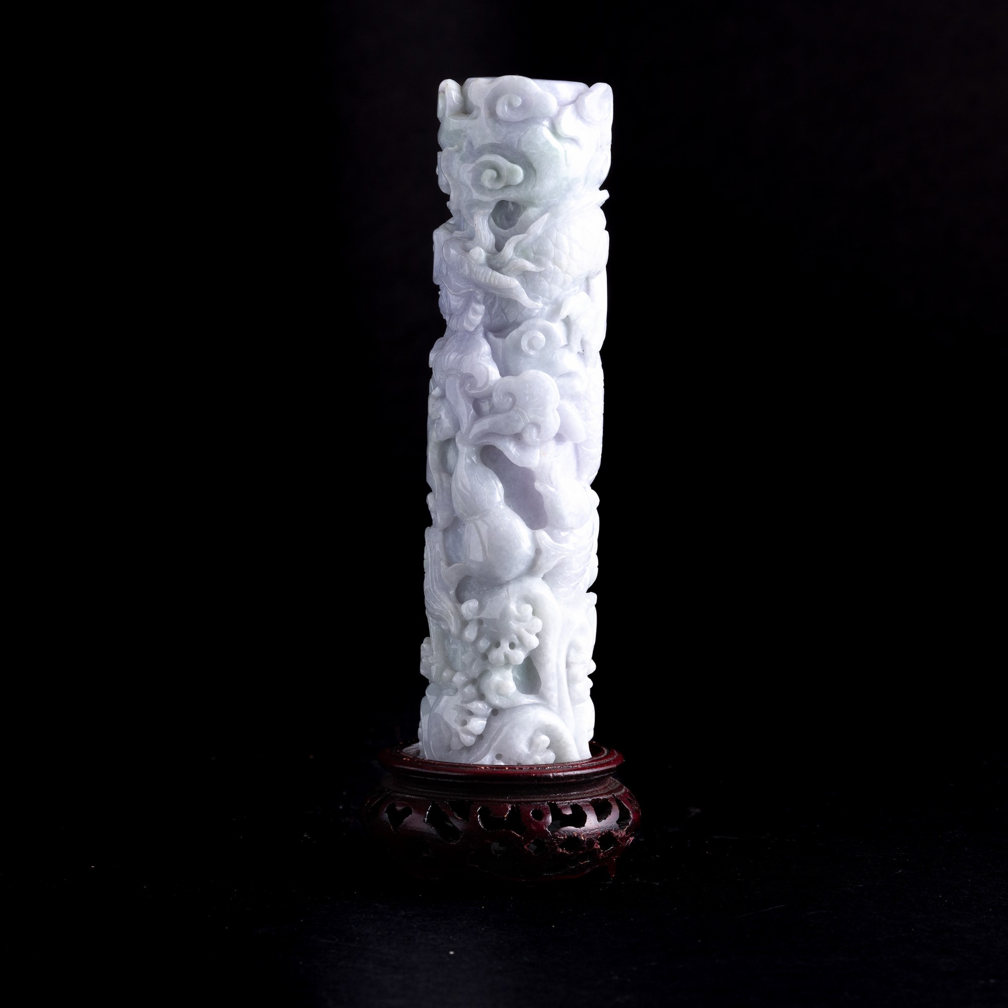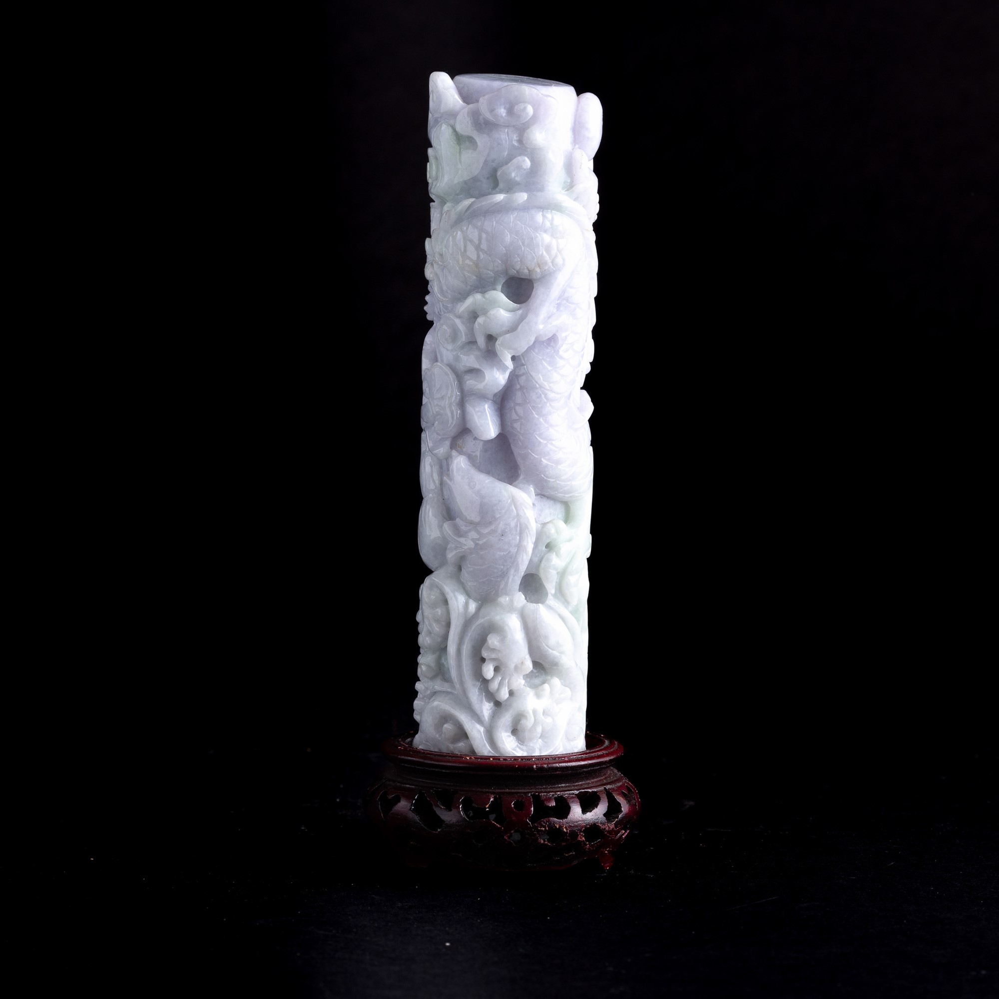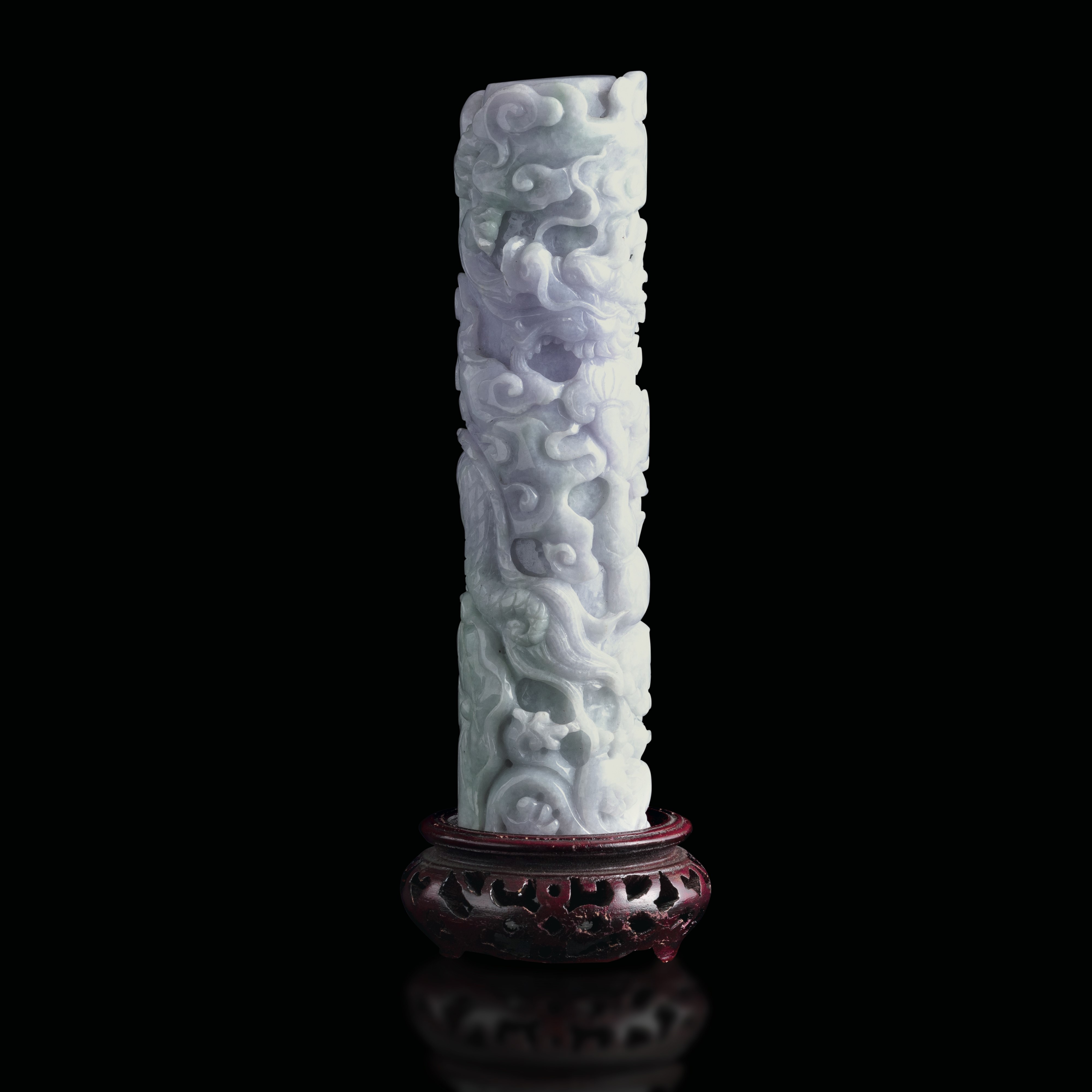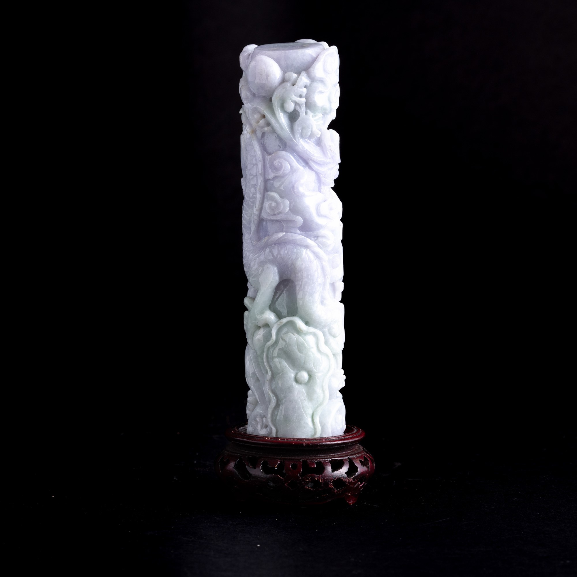 Elemento scolpito in giadeite sui toni lavanda e green apple raffigurante draghi e nuvole, Cina, Dinastia Qing, fine XIX secolo