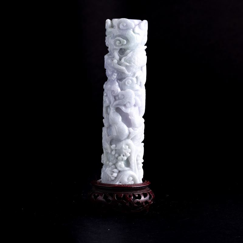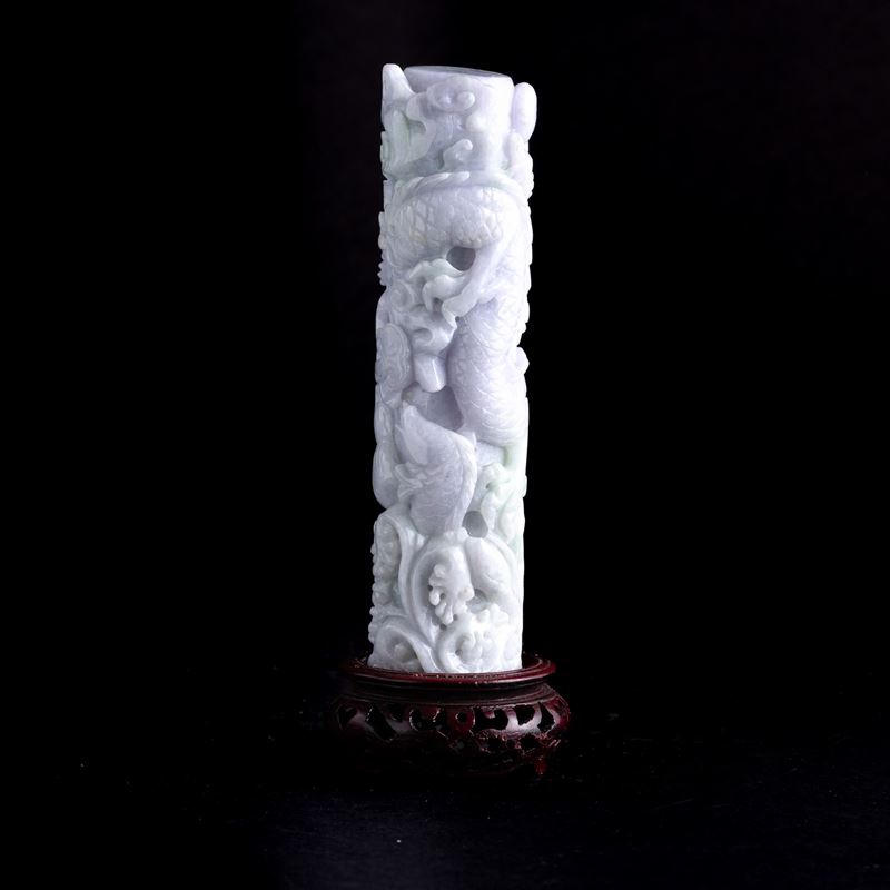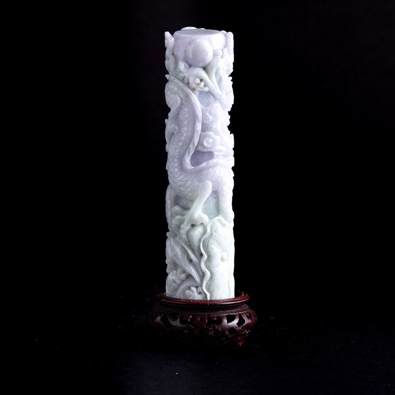 Elemento scolpito in giadeite sui toni lavanda e green apple raffigurante draghi e nuvole, Cina, Dinastia Qing, fine XIX [..]