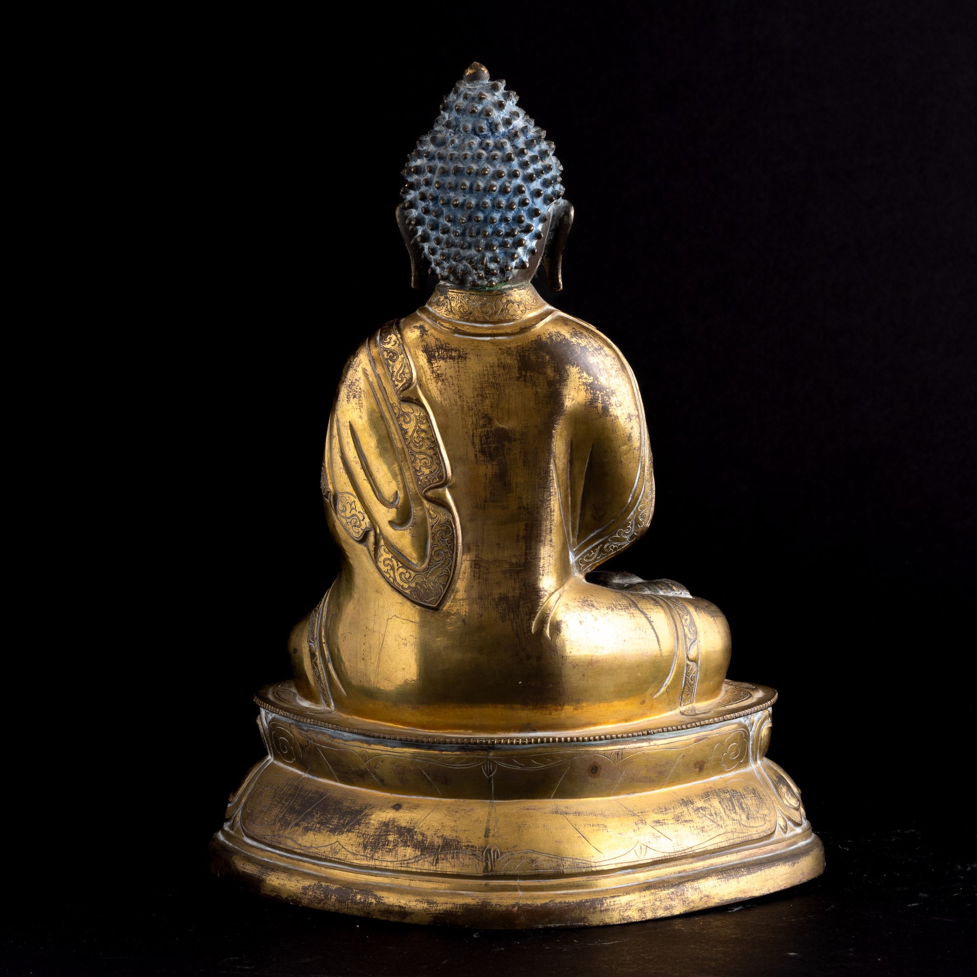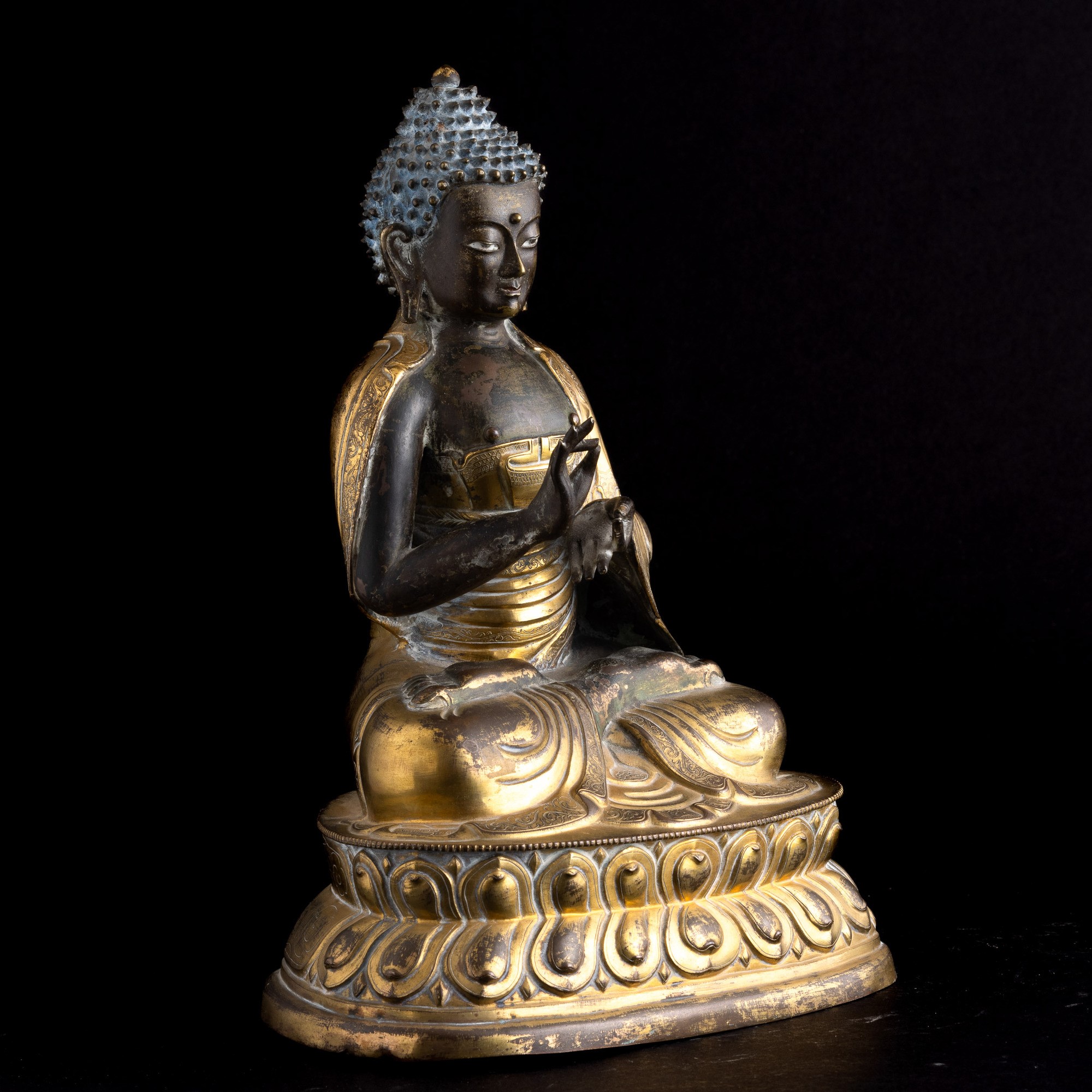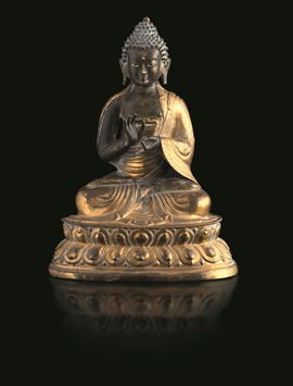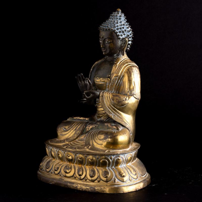 Figura di Buddha in bronzo dorato seduto su doppio fiore di loto, Cina, Dinastia Qing, epoca Qianlong (1736-1796)