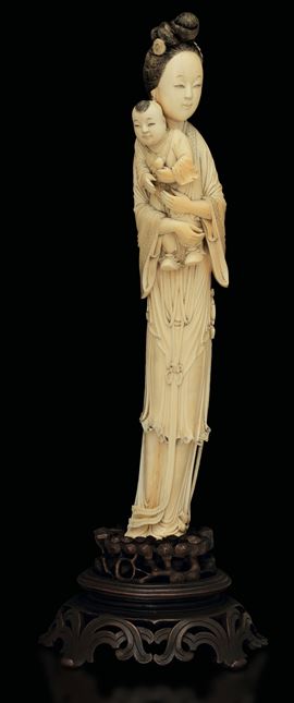 Figura di Guanyin con bambino scolpita in avorio, Cina, XIX secolo