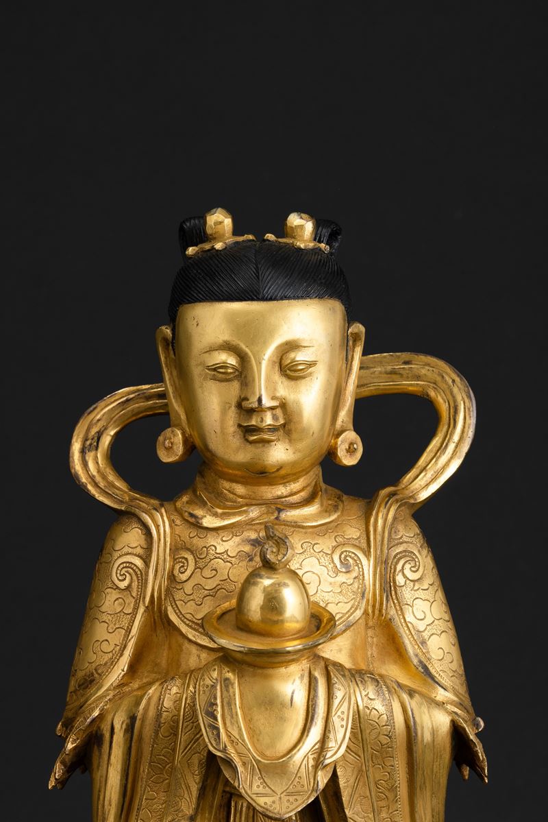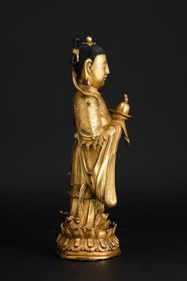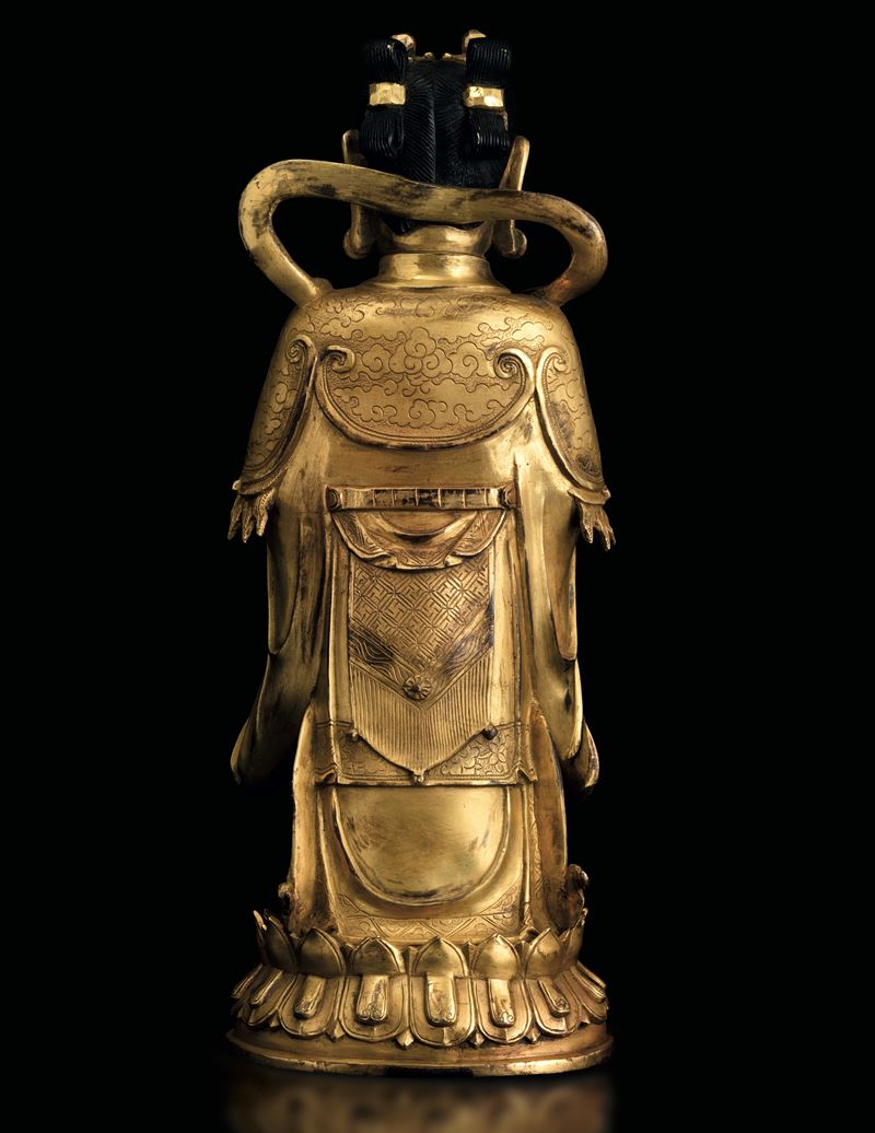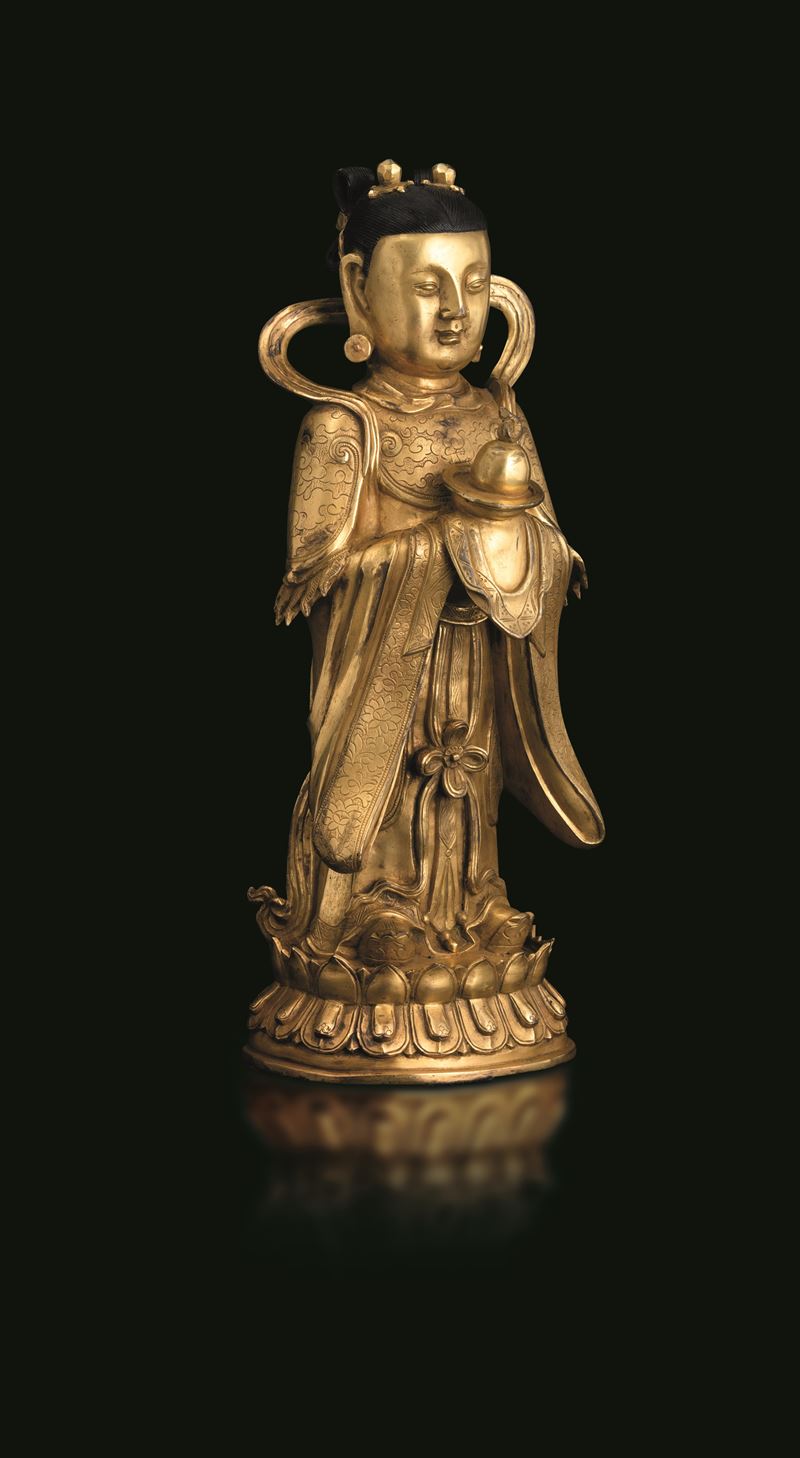 Figura di Guanyin scolpita in bronzo su doppio fiore di loto, doratura postuma, Cina, Dinastia Ming (1368-1644)