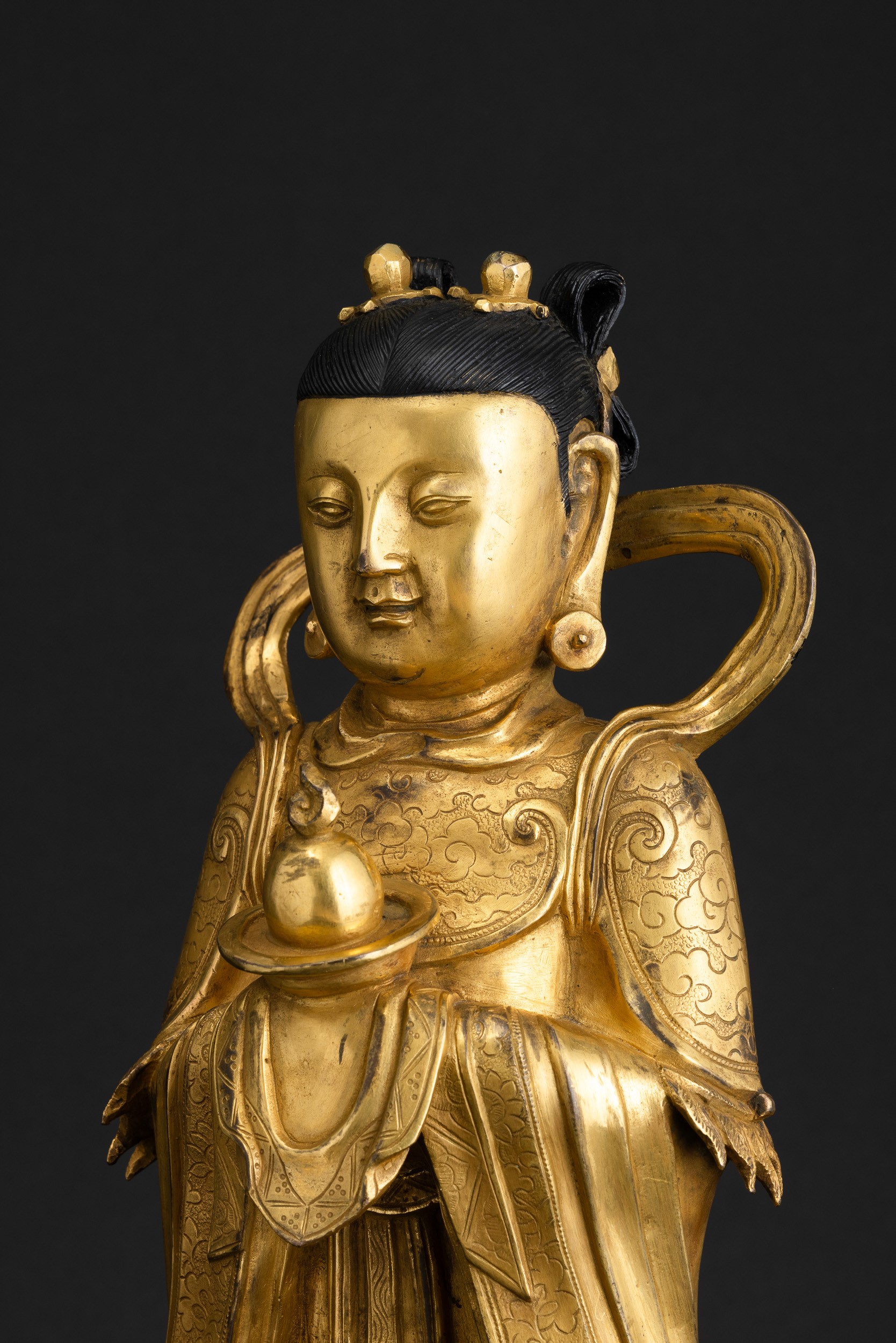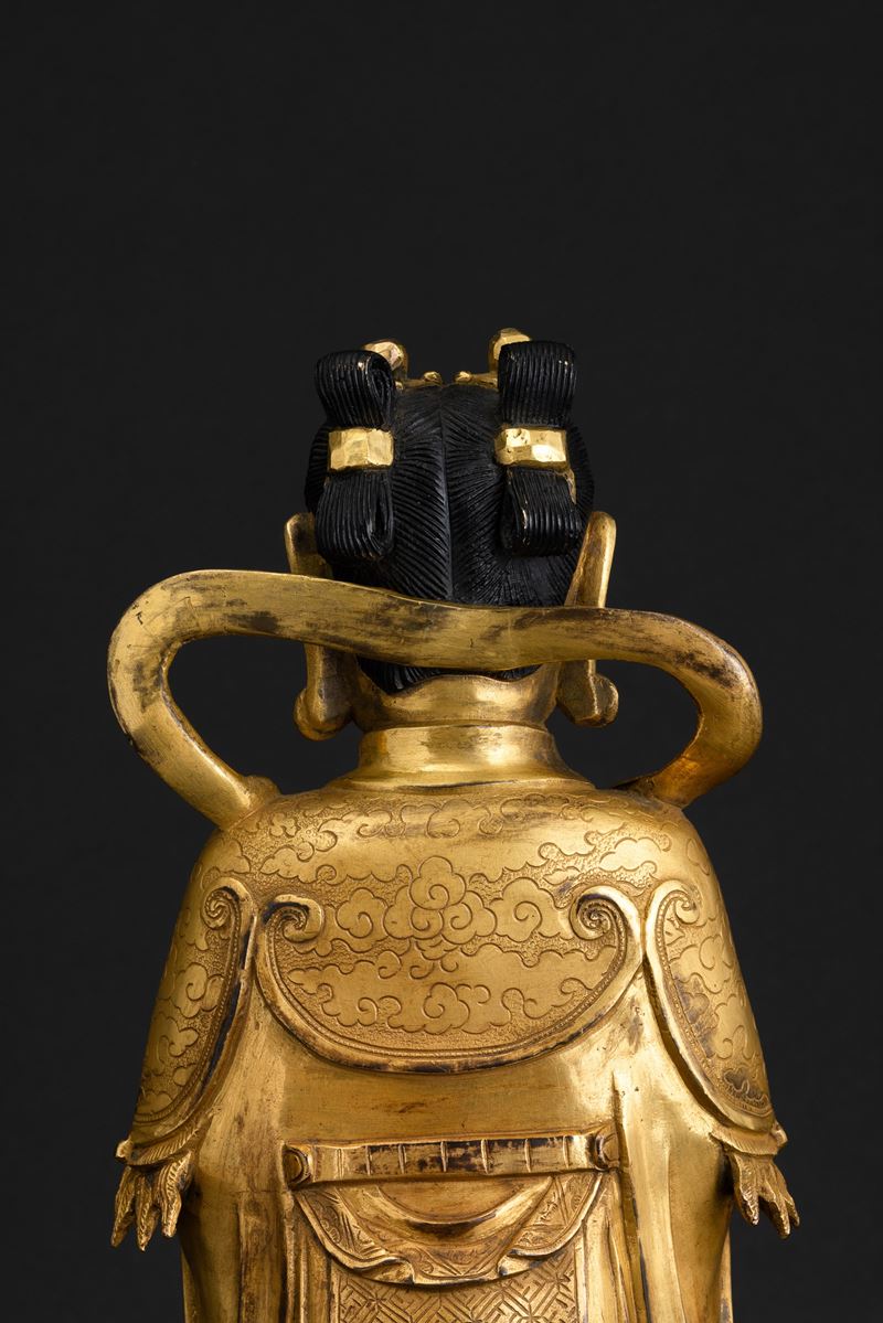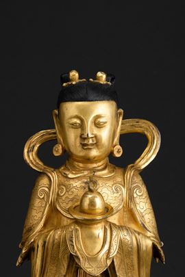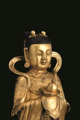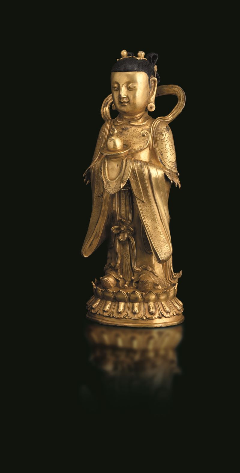 Figura di Guanyin scolpita in bronzo su doppio fiore di loto, doratura postuma, Cina, Dinastia Ming (1368-1644)