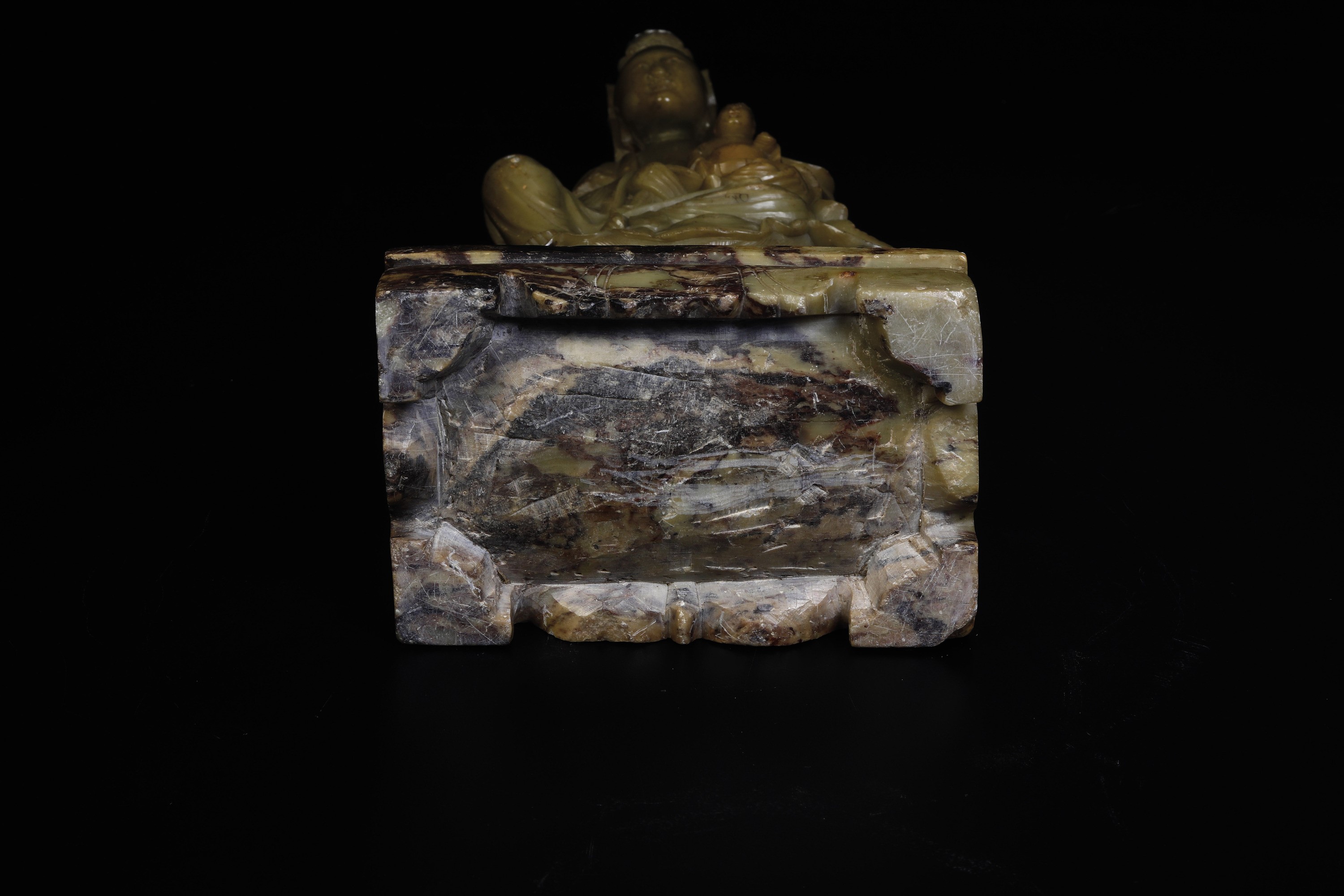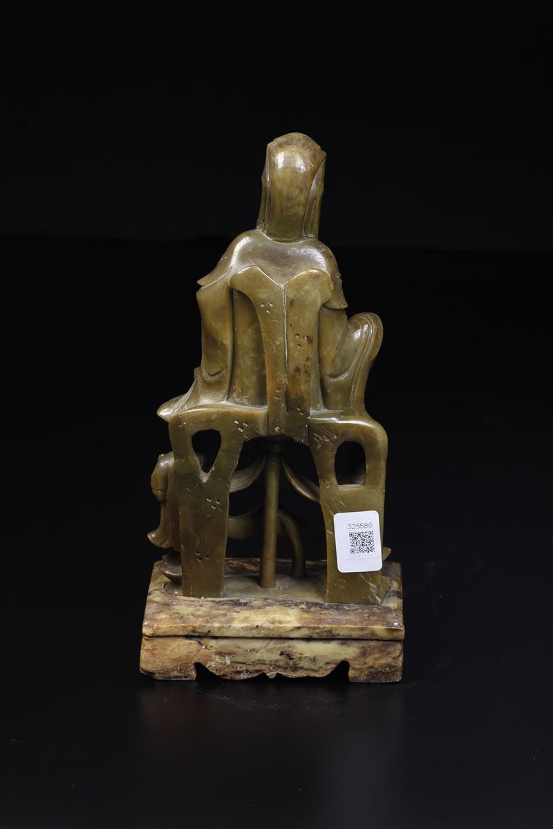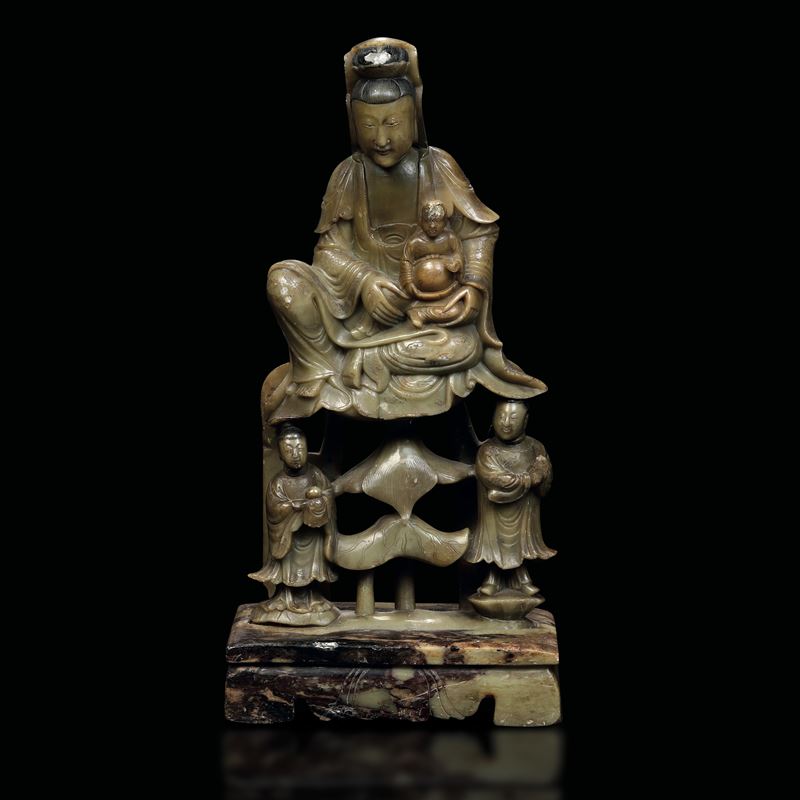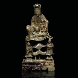 Figura raffigurante Guanyin con bambini scolpita in pietra saponaria, Cina, XIX secolo