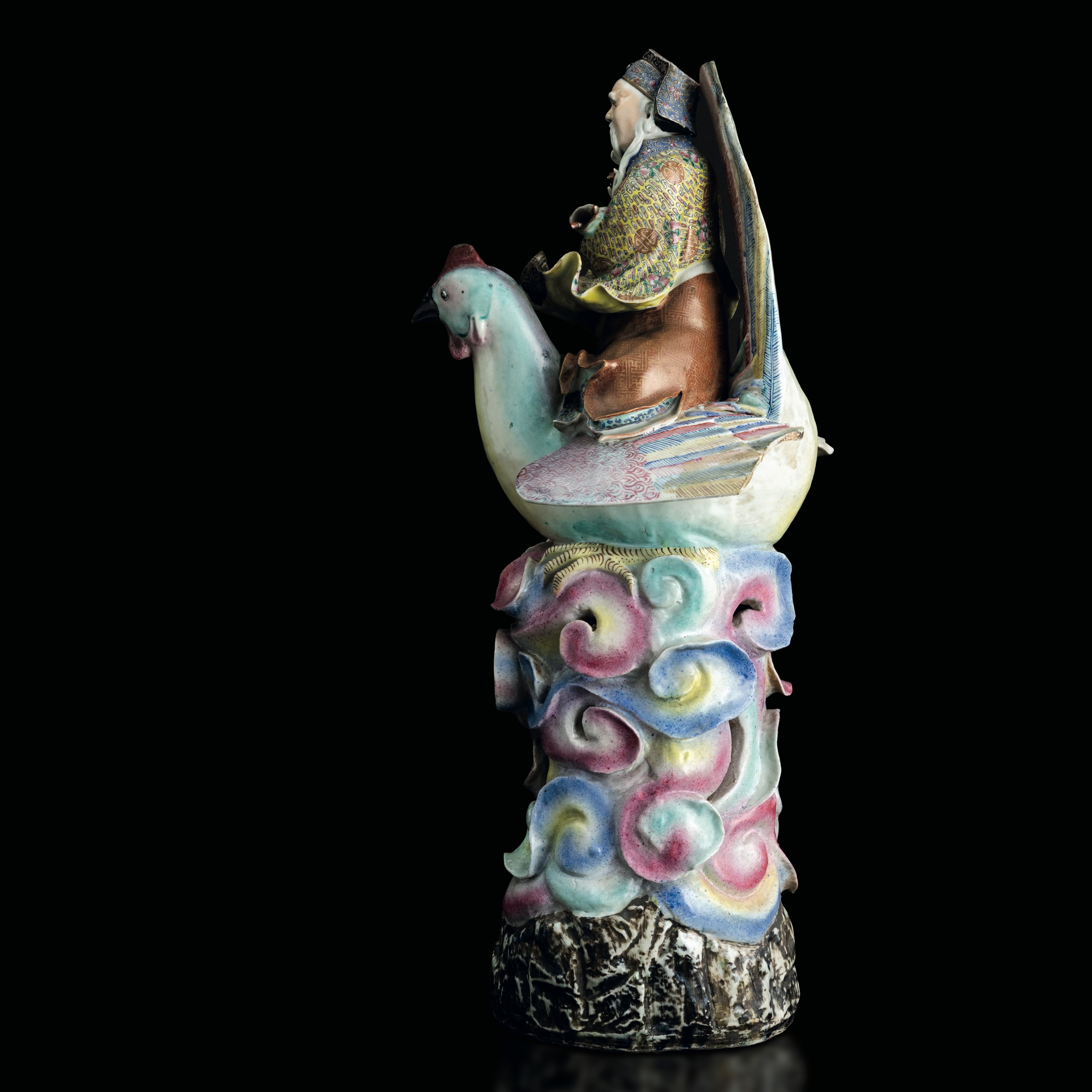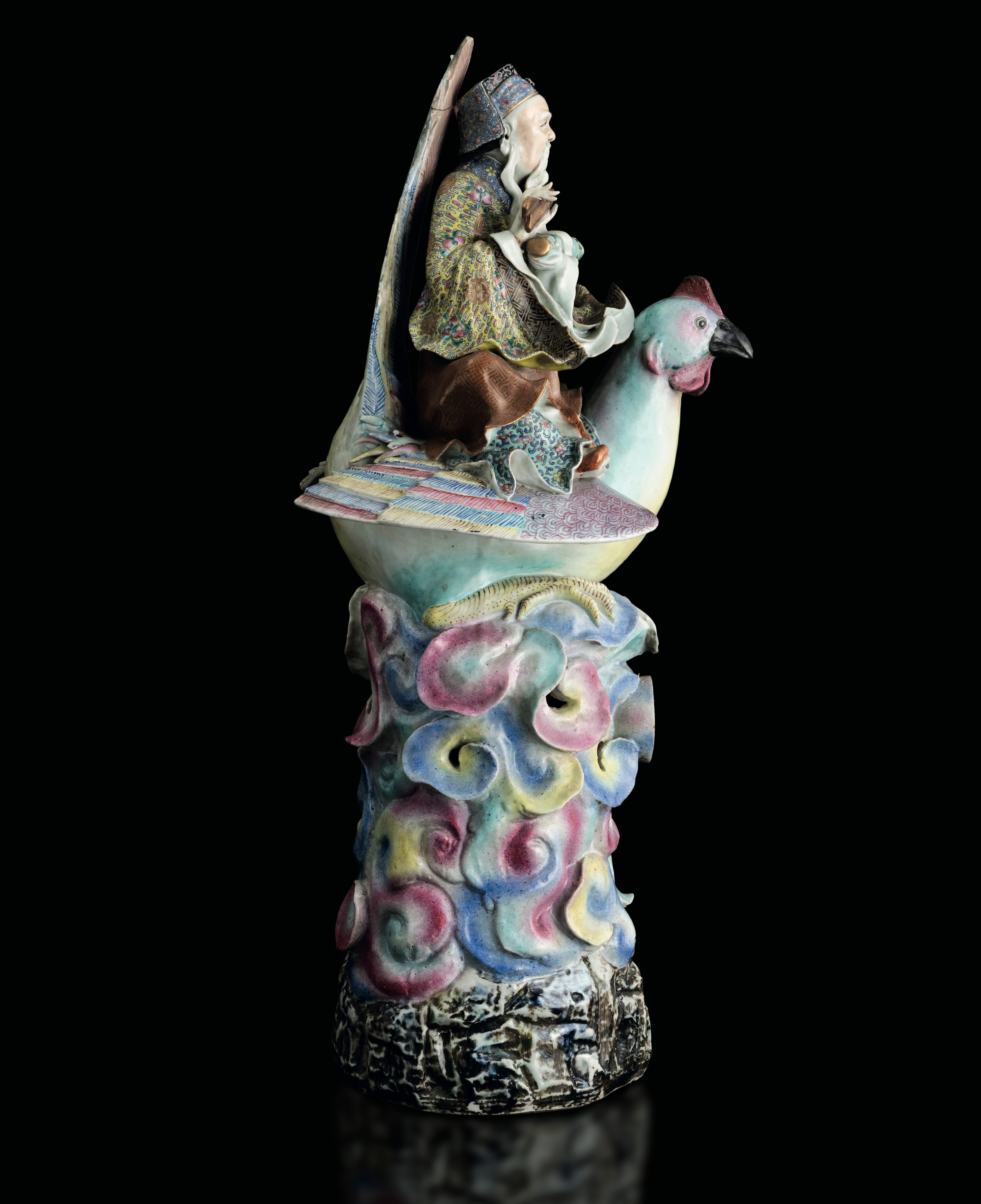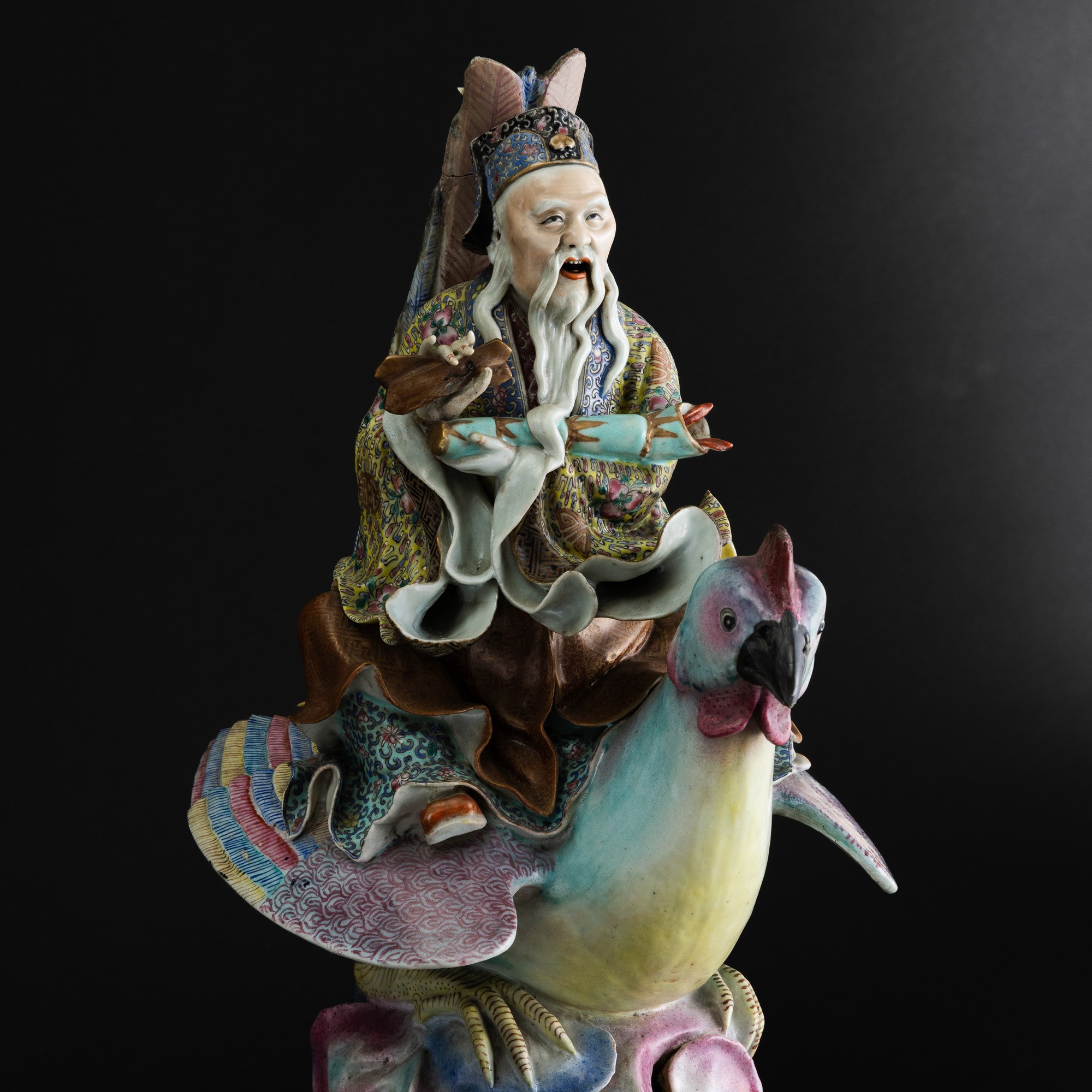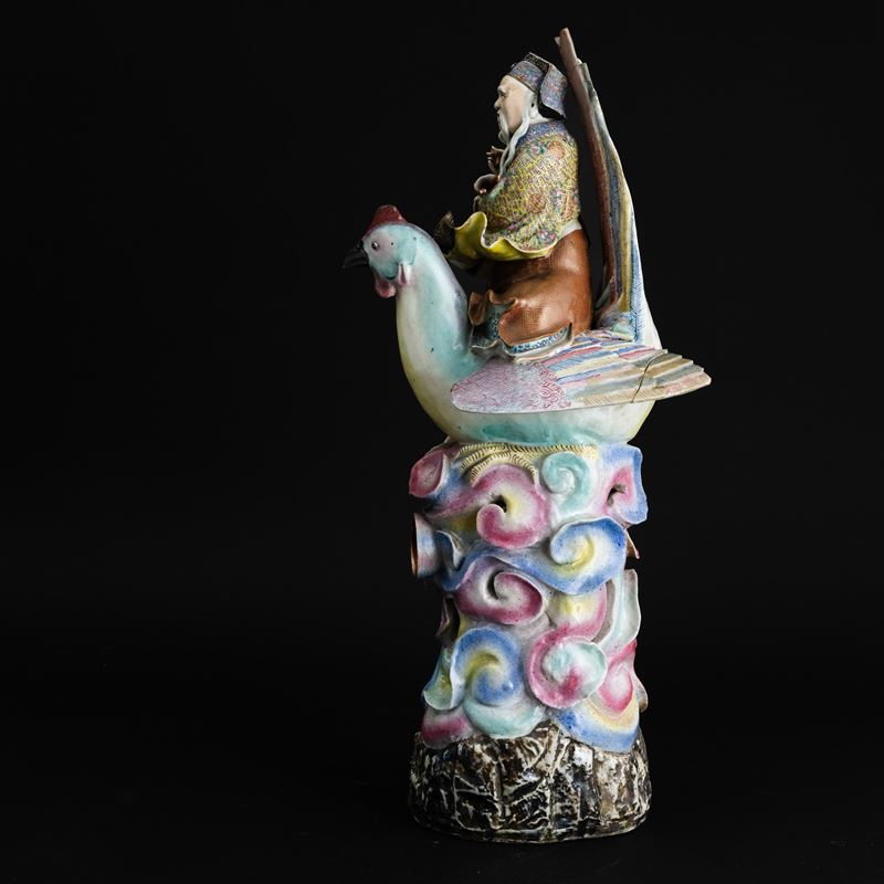 Grande figura in porcellana policroma raffigurante saggio a cavallo di un gallo, Dinastia Qing, fine XIX secolo