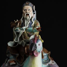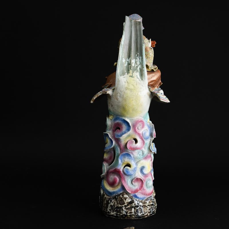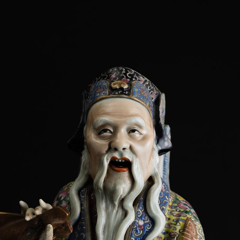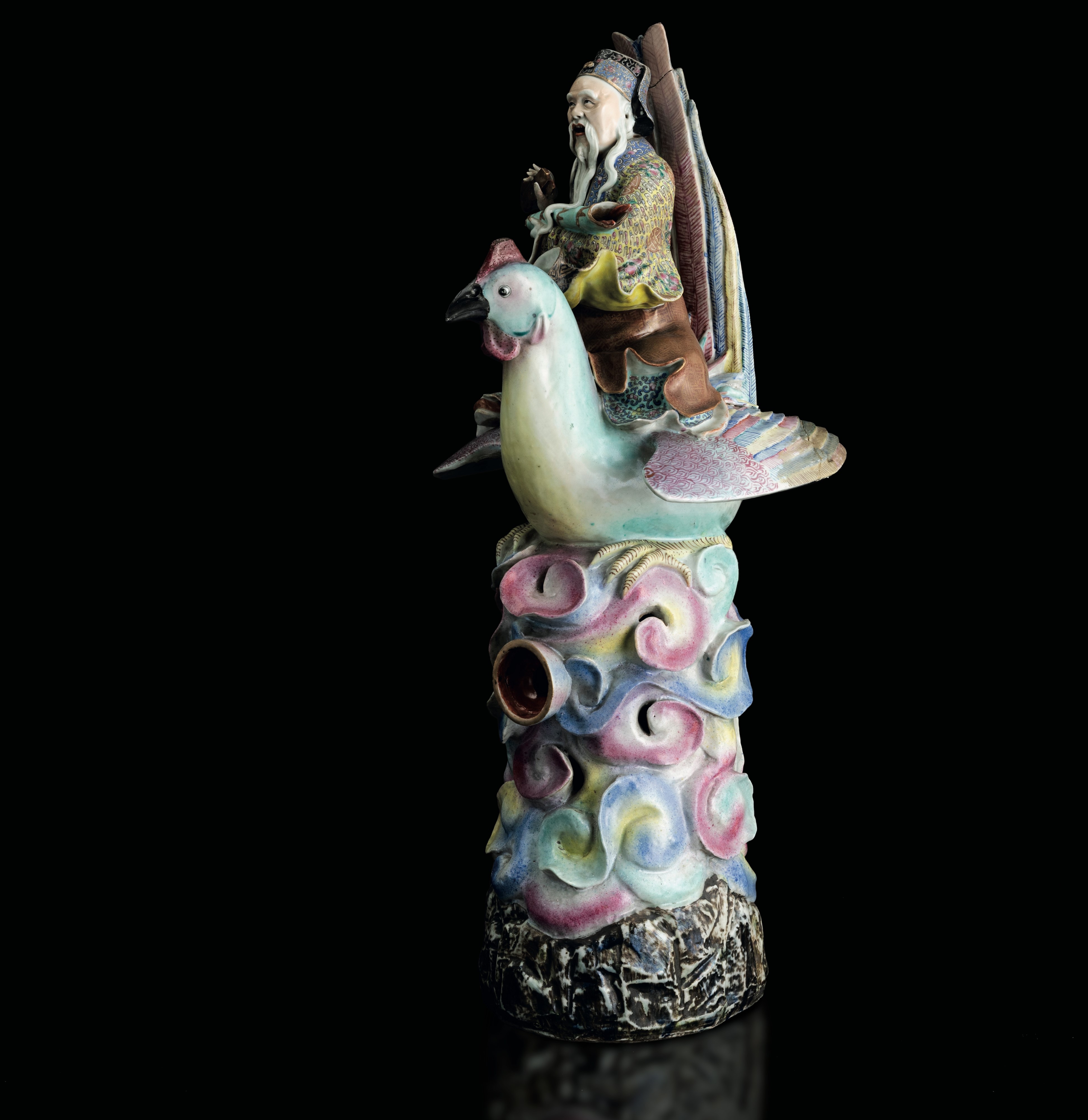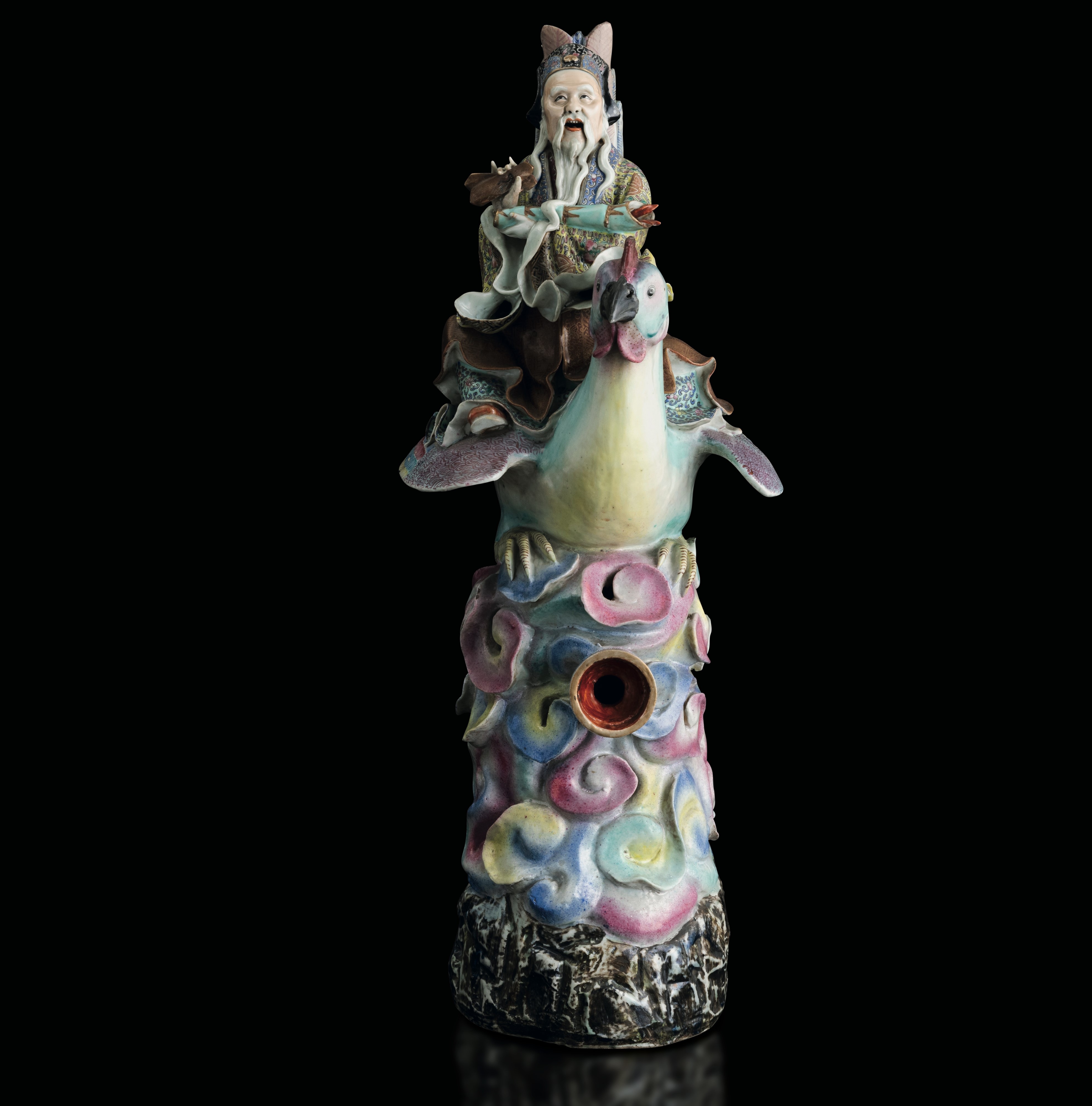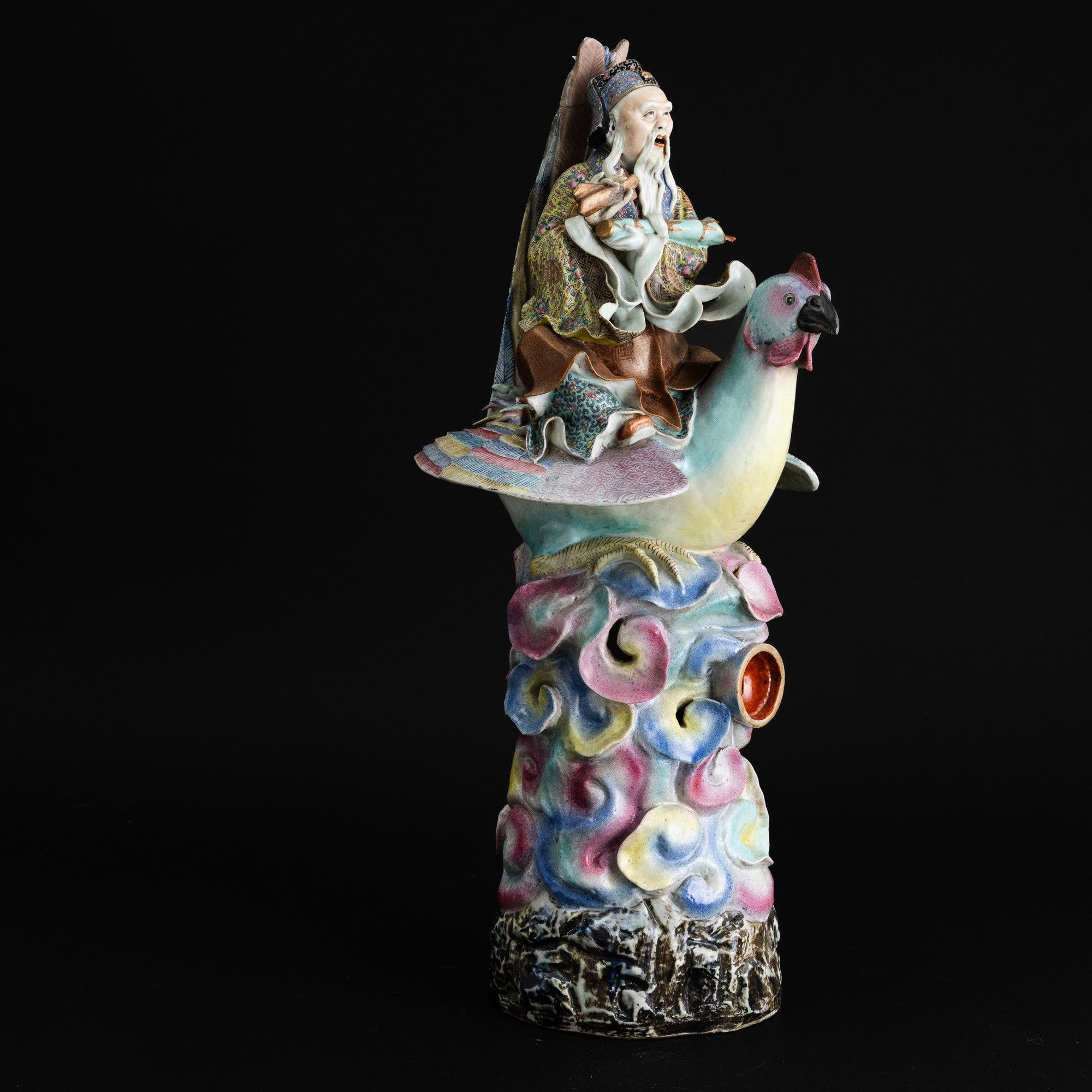 Grande figura in porcellana policroma raffigurante saggio a cavallo di un gallo, Dinastia Qing, fine XIX secolo