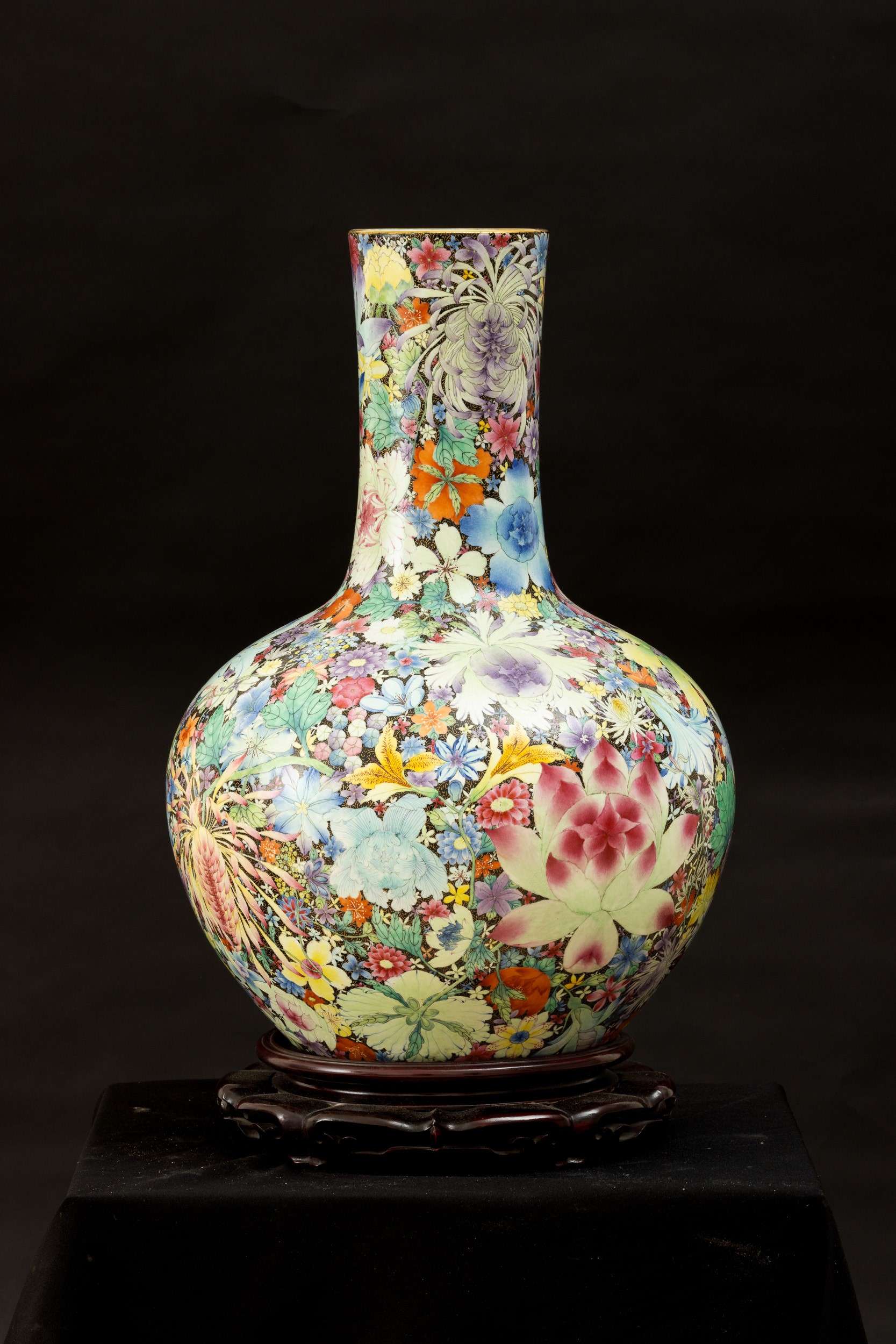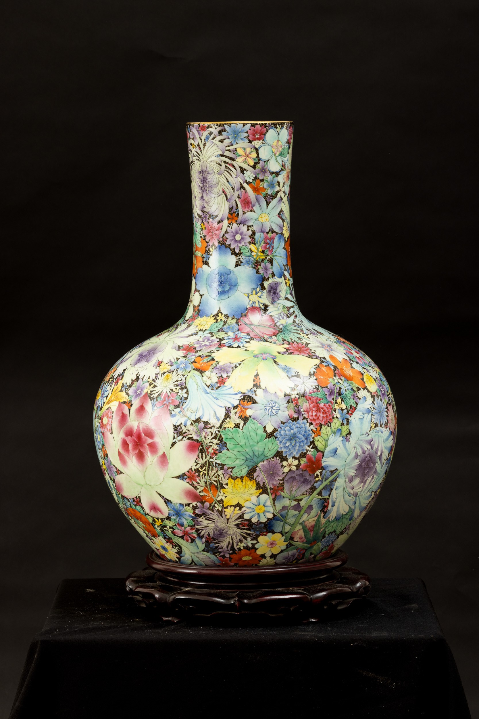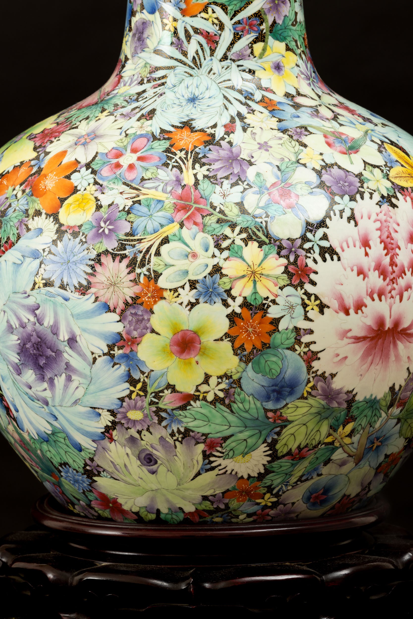 Grande vaso Tianqiuping Famiglia Nera in porcellana con decoro millefleures, Cina, Dinastia Qing, epoca Guangxu (1875-1908)