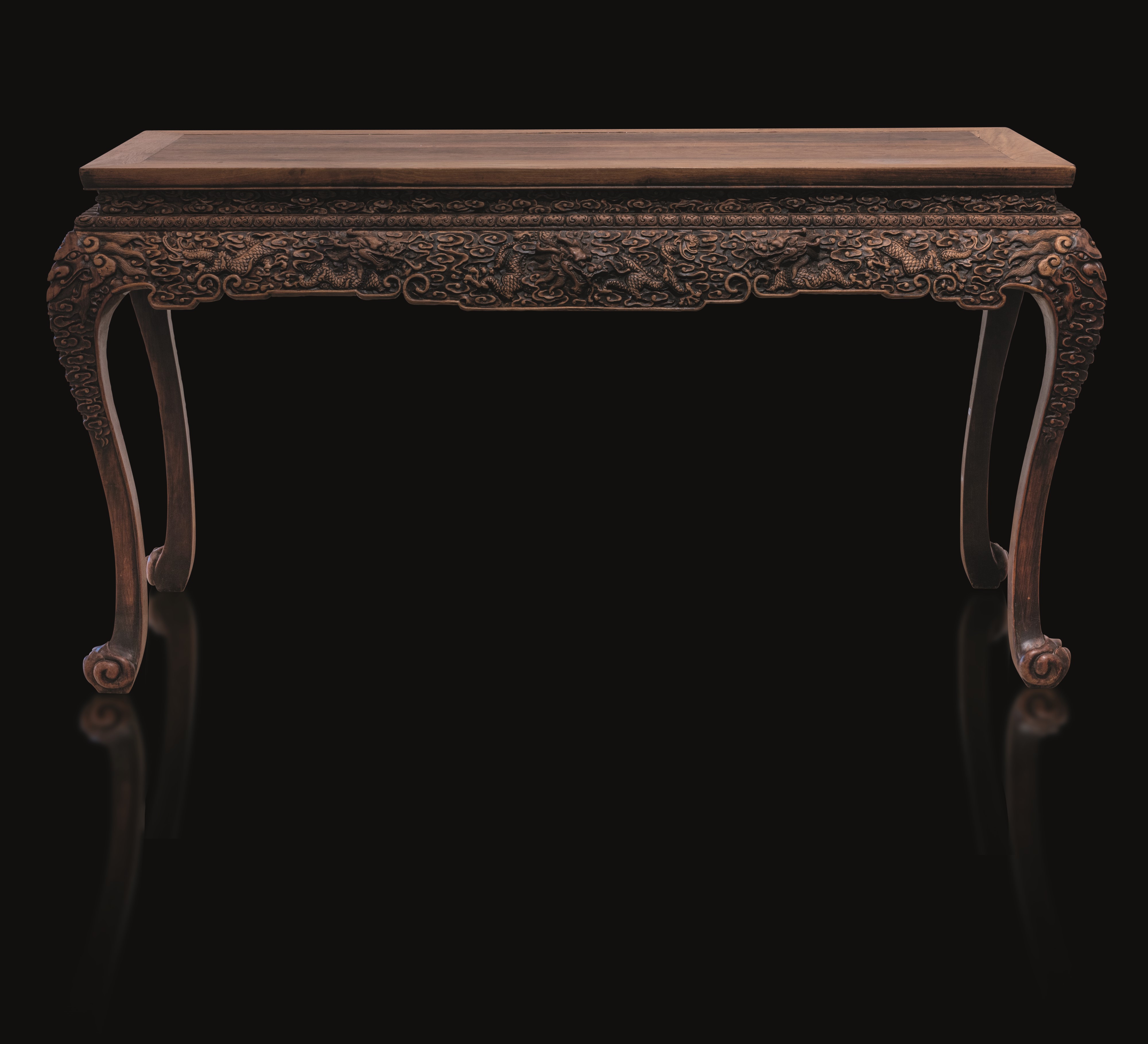 Importante console cerimoniale in legno di Huanghuali riccamente intagliato con decoro di draghi tra le nuvole in stile imperiale, Cina, Dinastia Qing (1644-1912)