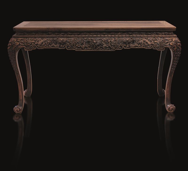 Importante console cerimoniale in legno di Huanghuali riccamente intagliato con decoro di draghi tra le nuvole in stile [..]