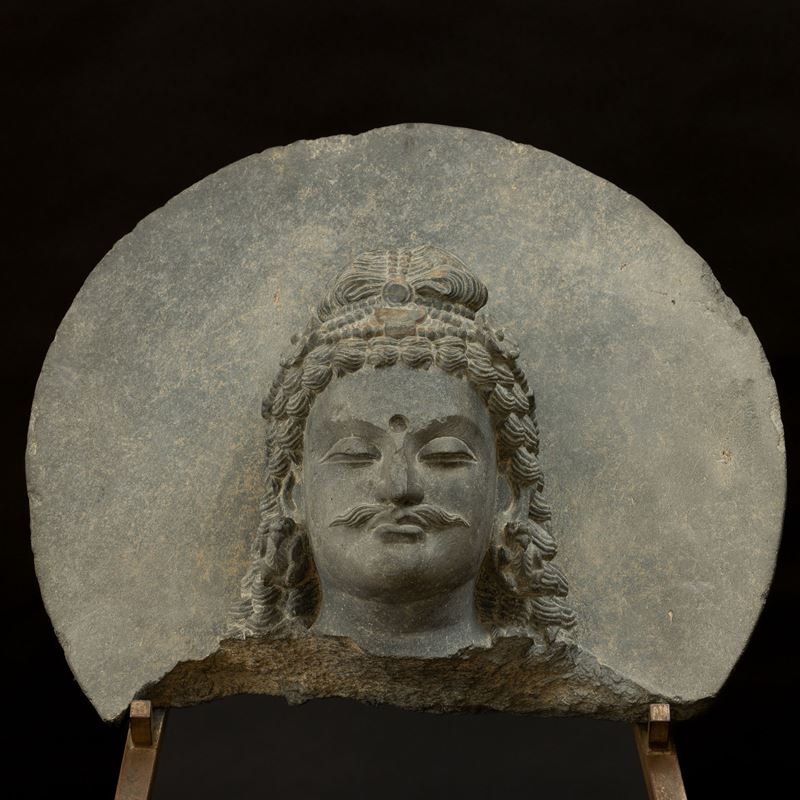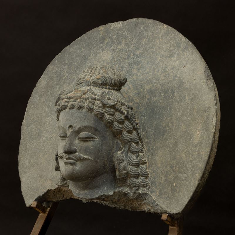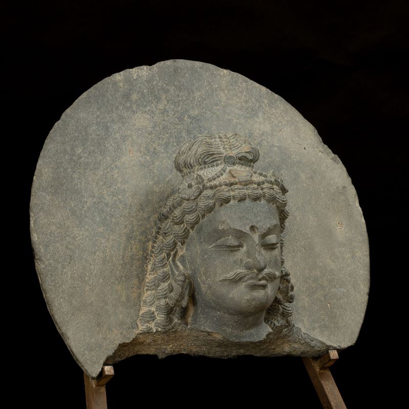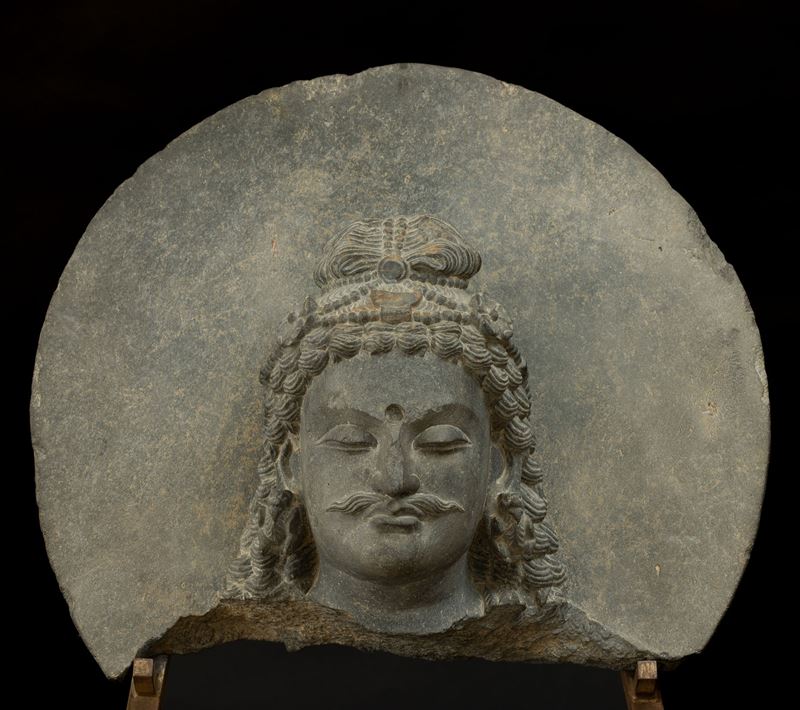 Importante Testa di Bodhisatwa scolpita in pietra, Gandhara, IV secolo