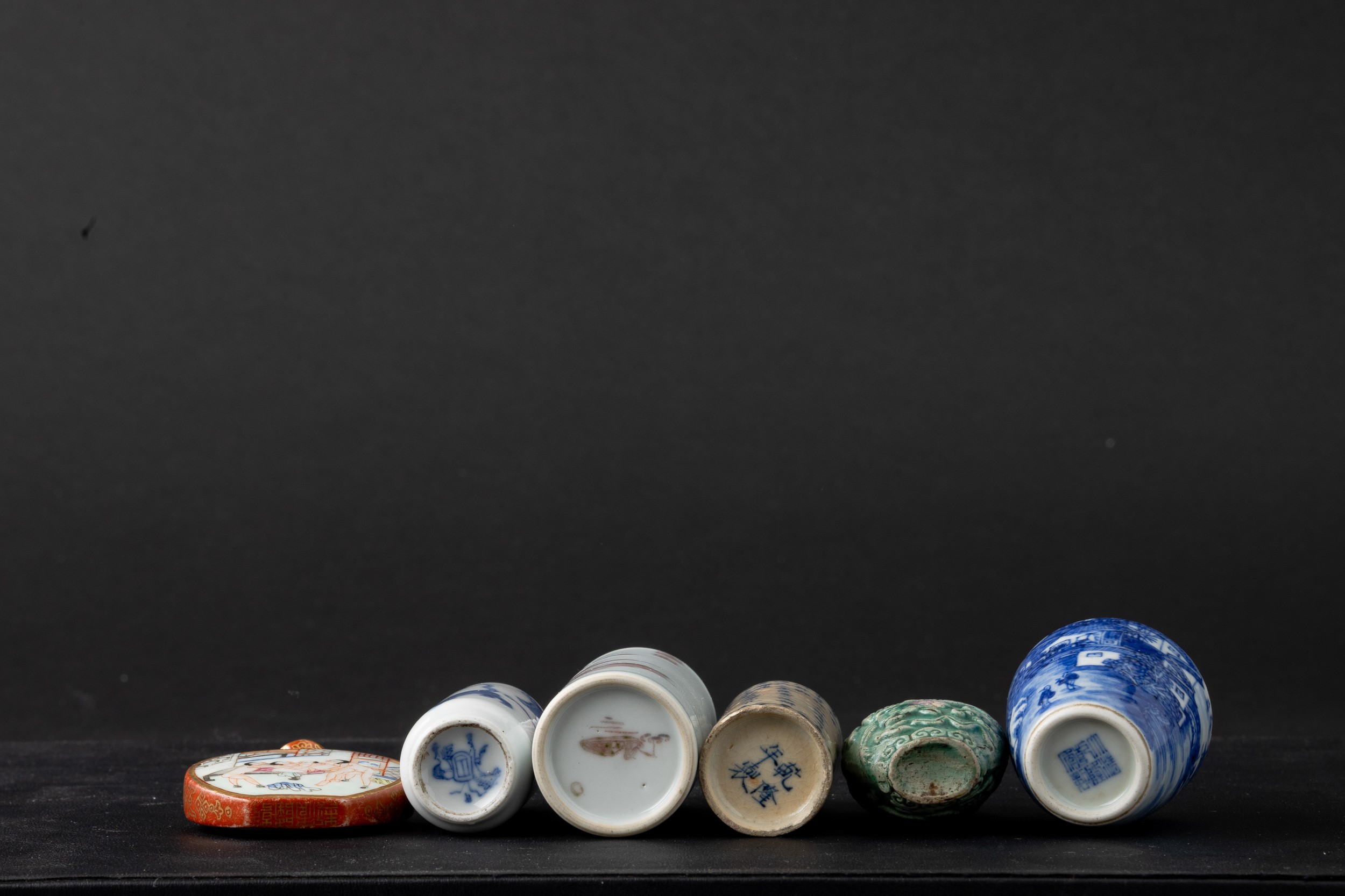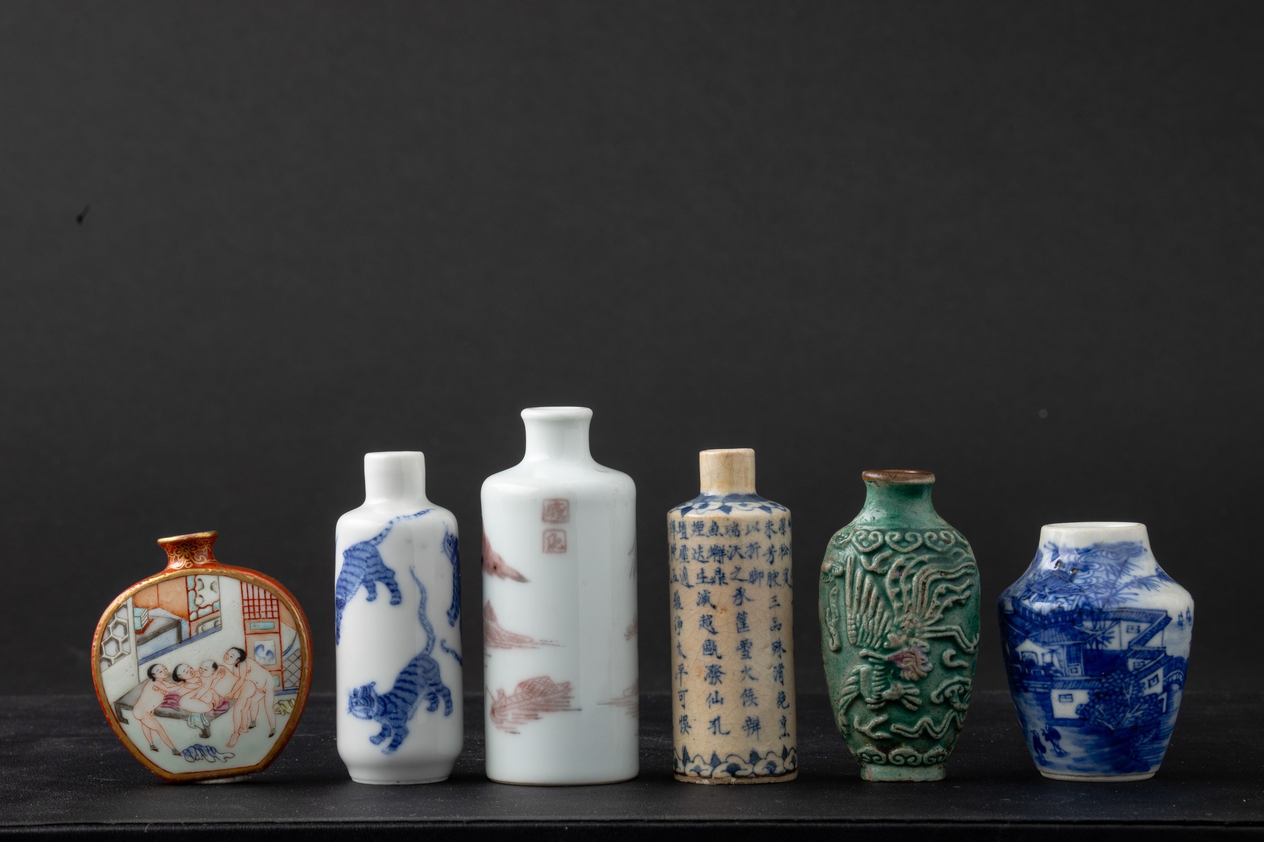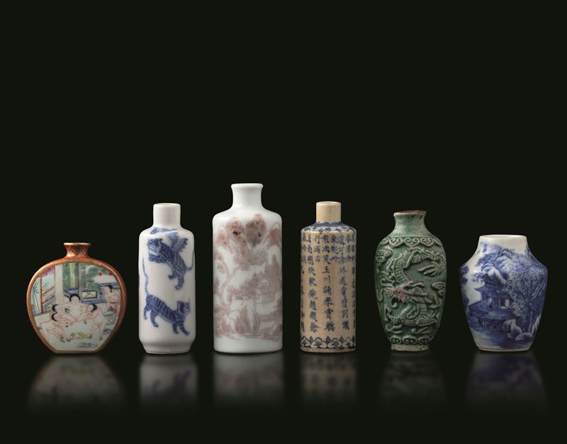 Lotto composto da sei snuff bottle in porcellana con disegni diversi, Cina, Dinastia Qing (1644-1912)