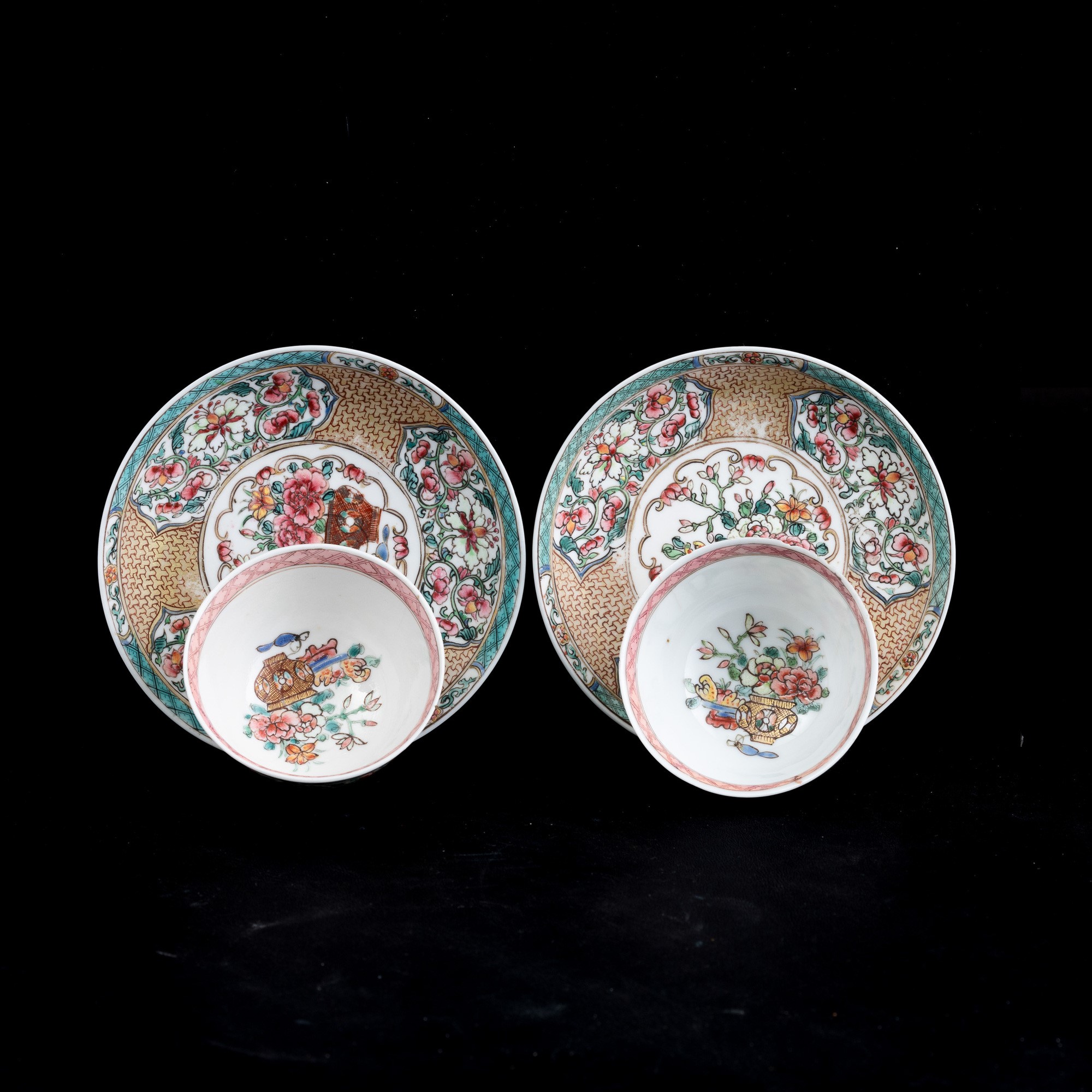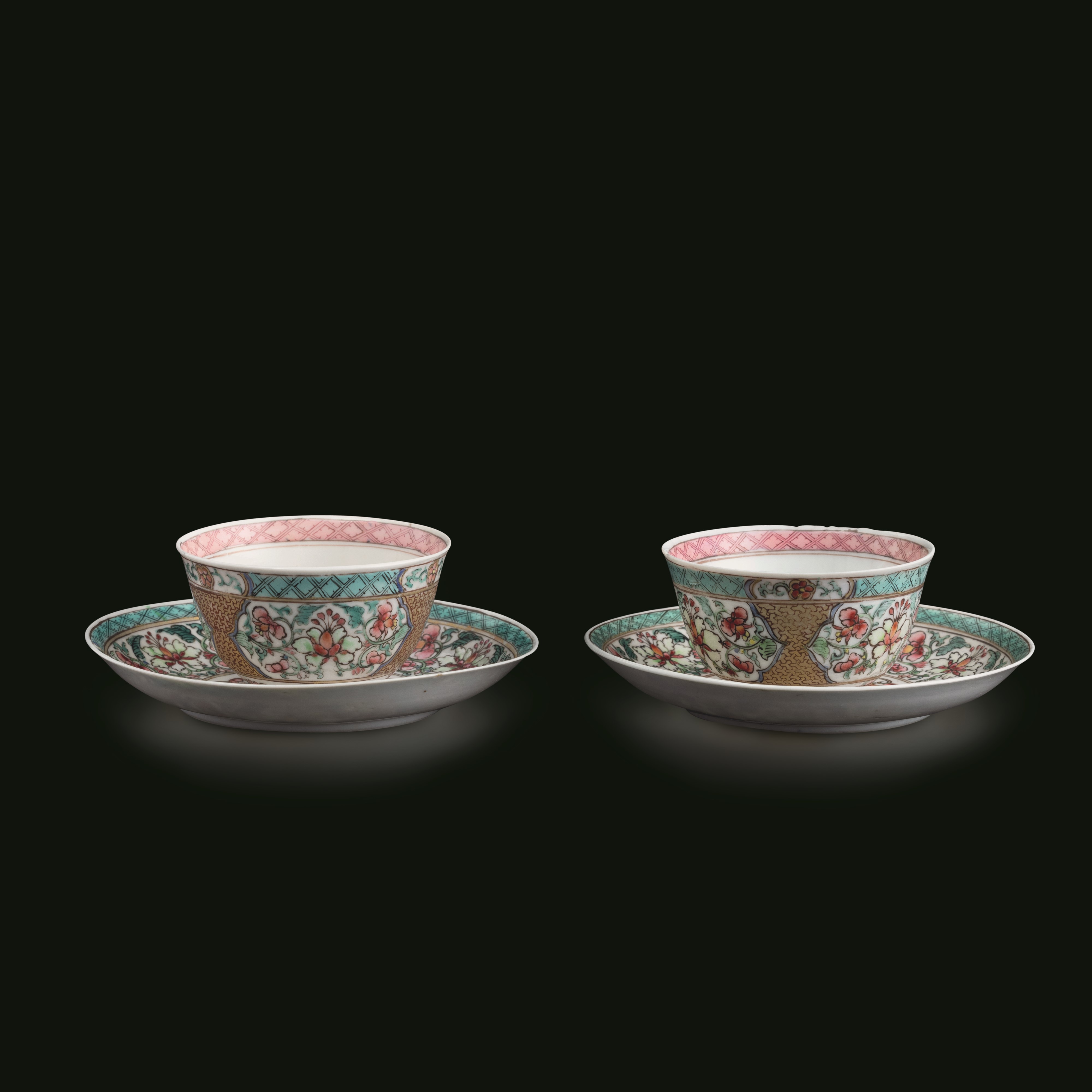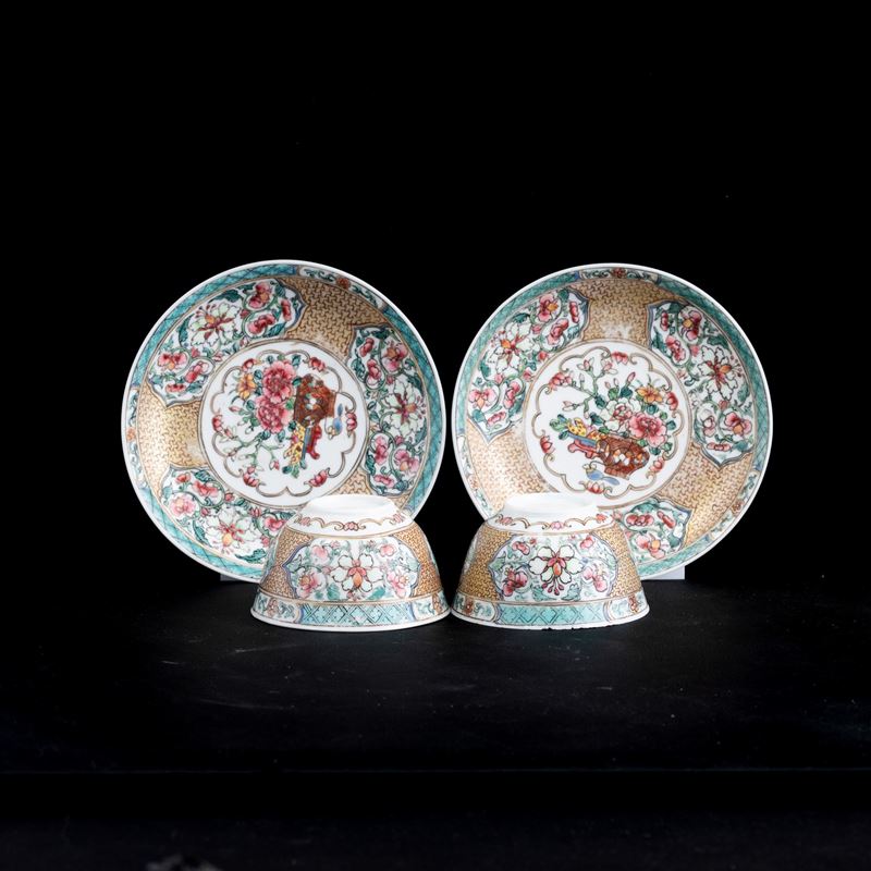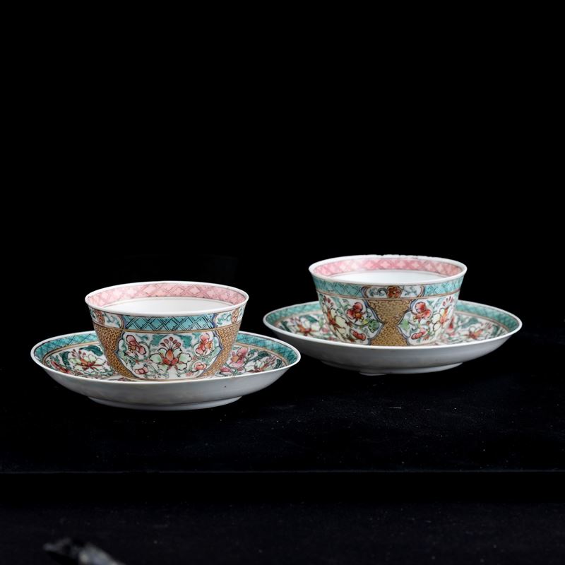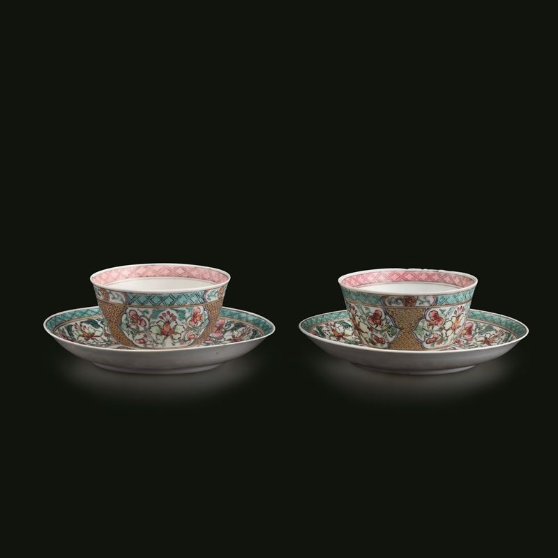 Lotto composto di coppia di tazzine con sottopiatto in porcellana Famiglia Rosa, Cina, Dinastia Qing, epoca Qianlong (1736-1796)