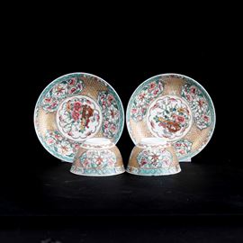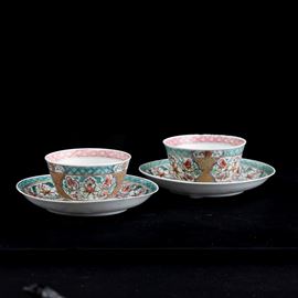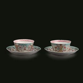 Lotto composto di coppia di tazzine con sottopiatto in porcellana Famiglia Rosa, Cina, Dinastia Qing, epoca Qianlong (173 [..]