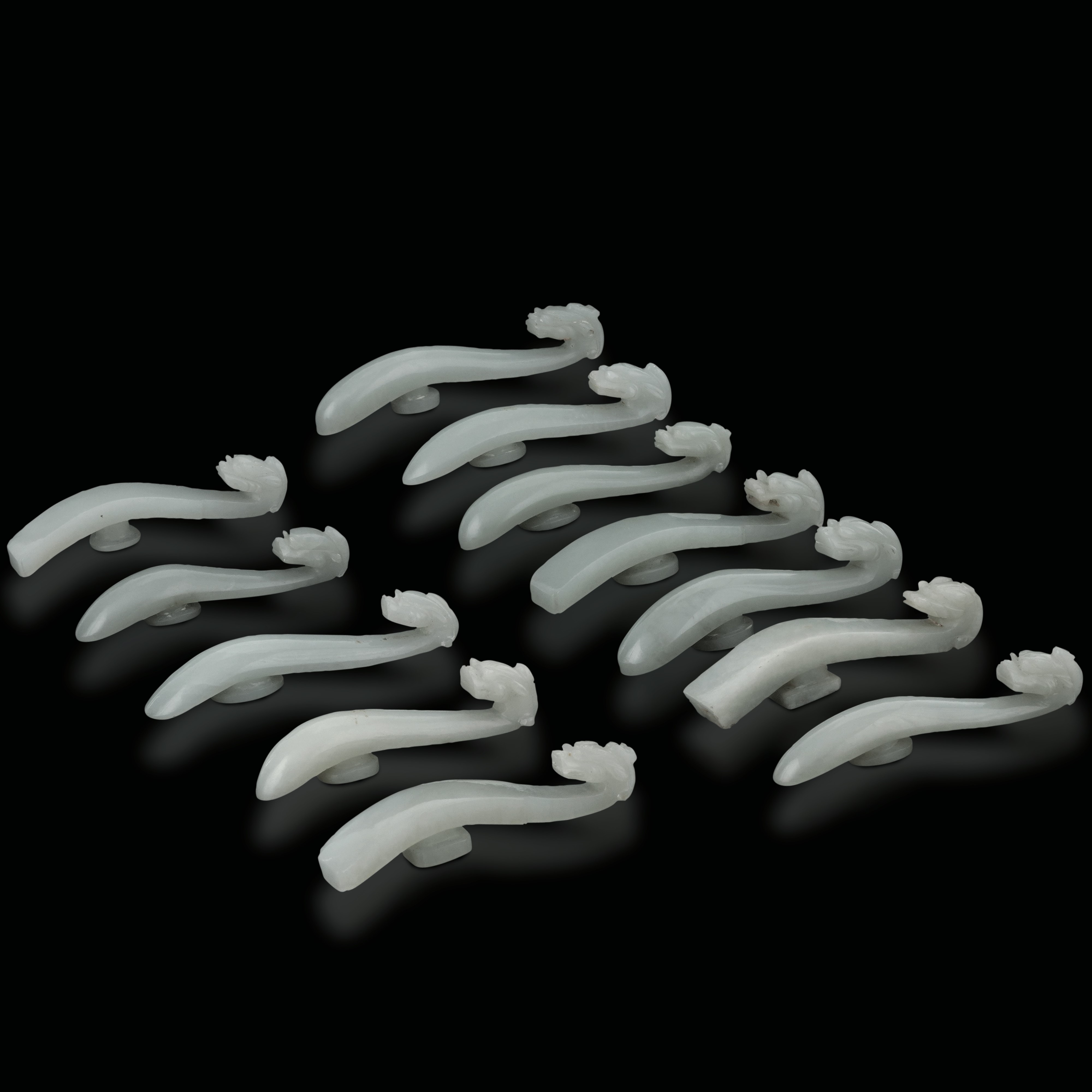 Lotto di dodici fibbie a forma di cintura in giada, Cina, XIX secolo