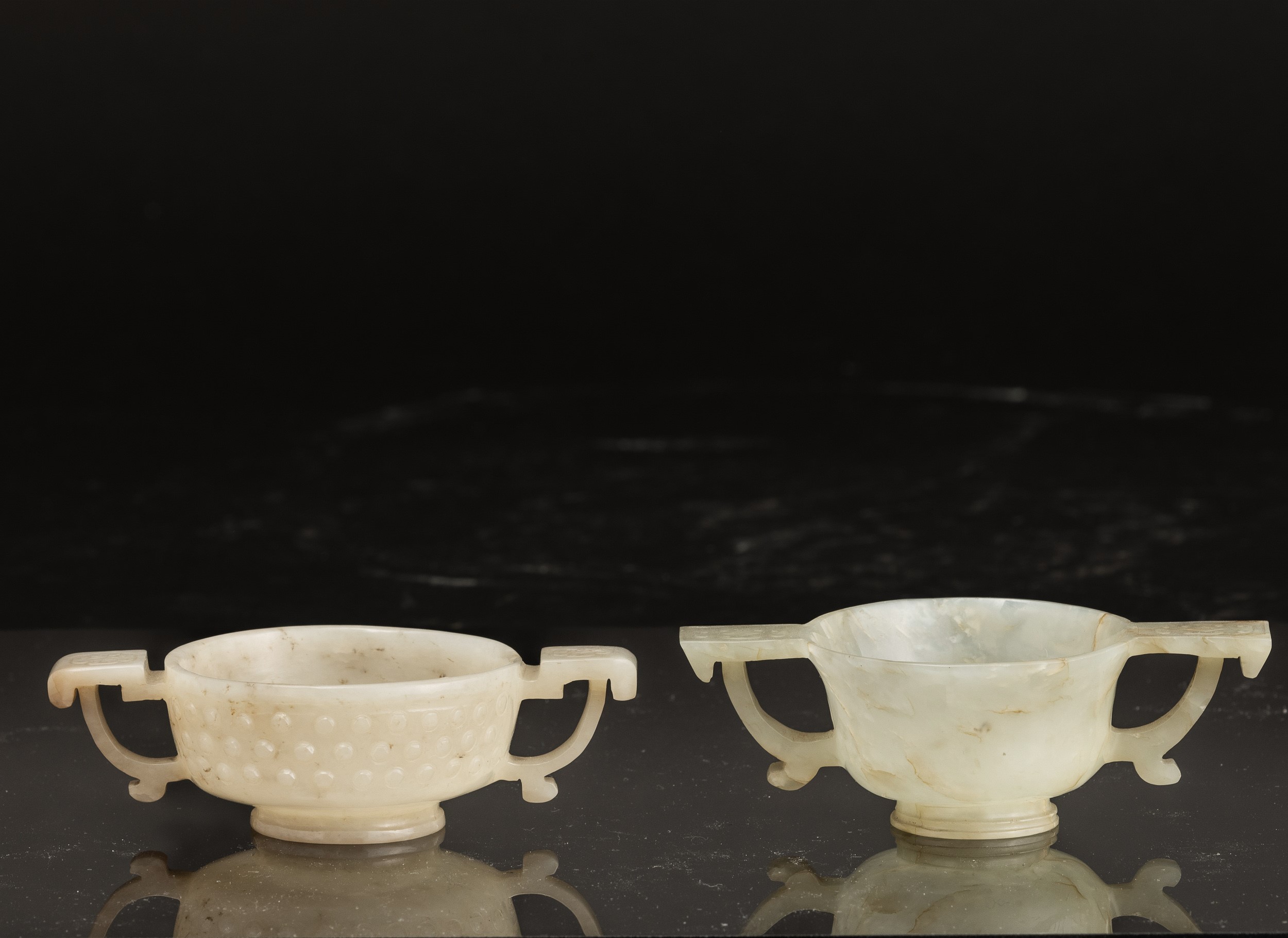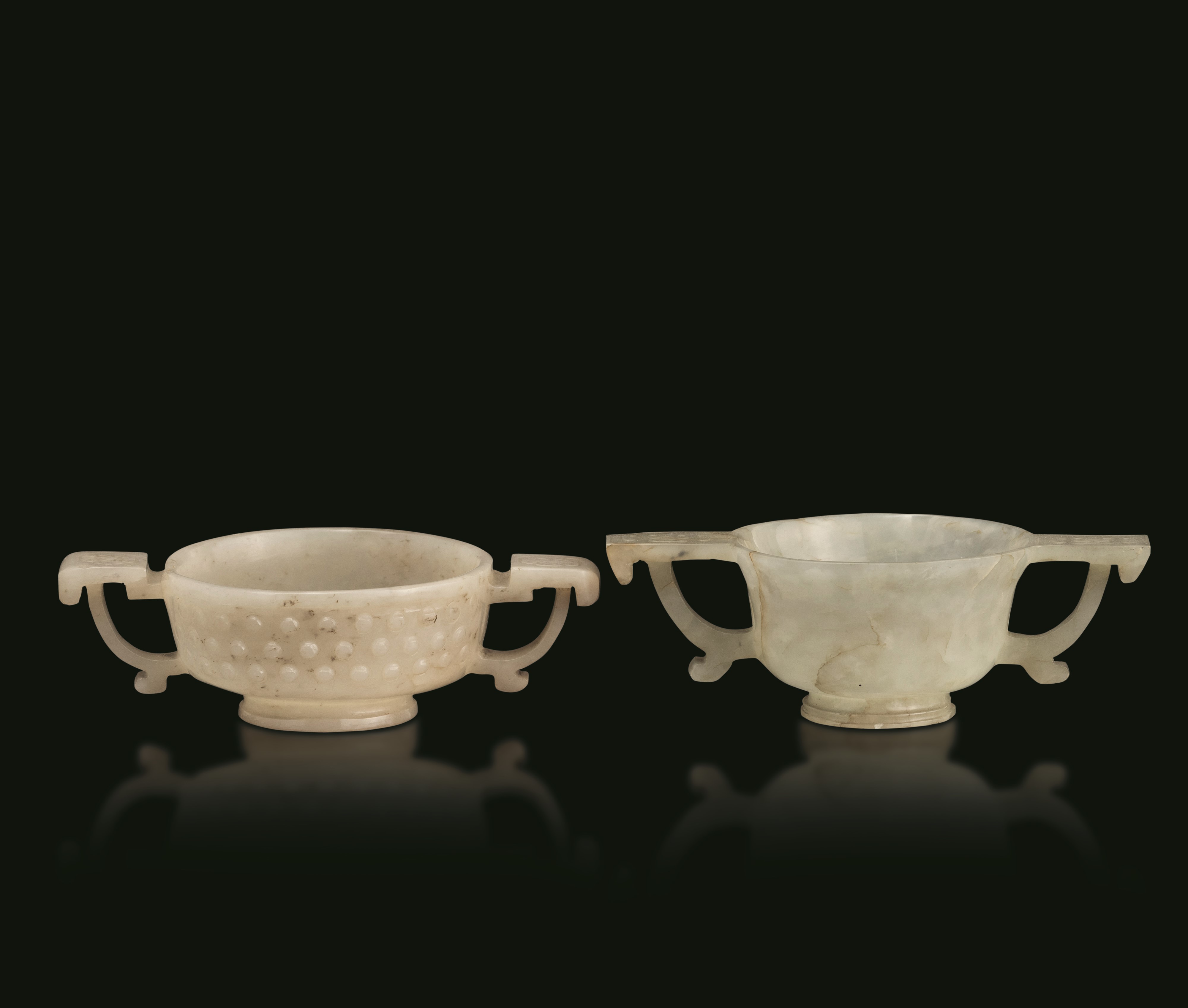 Lotto di due coppette cerimoniale in giada bianca e russet con manici e decori geometrici intagliati, Cina, Dinastia Qing, [..]