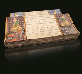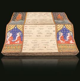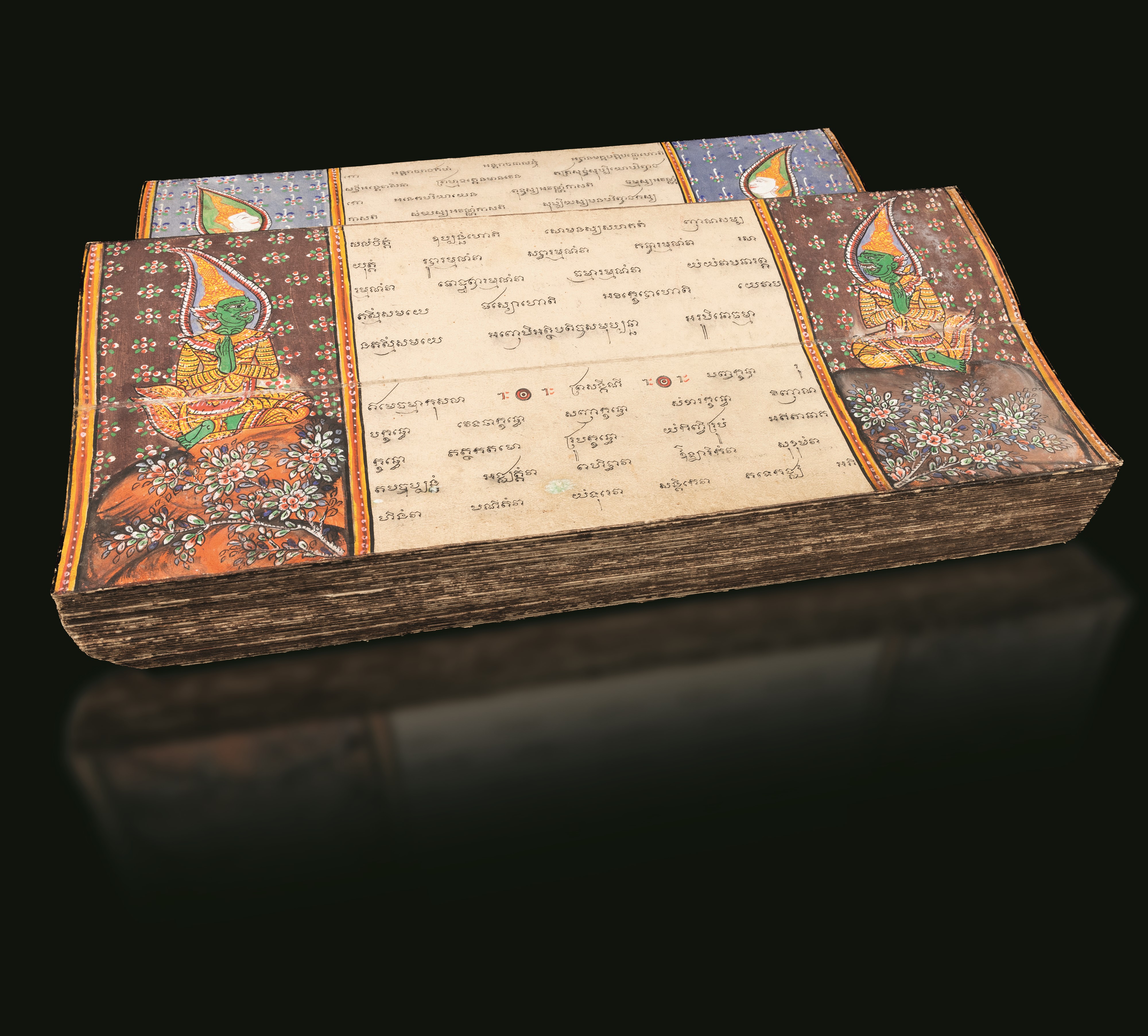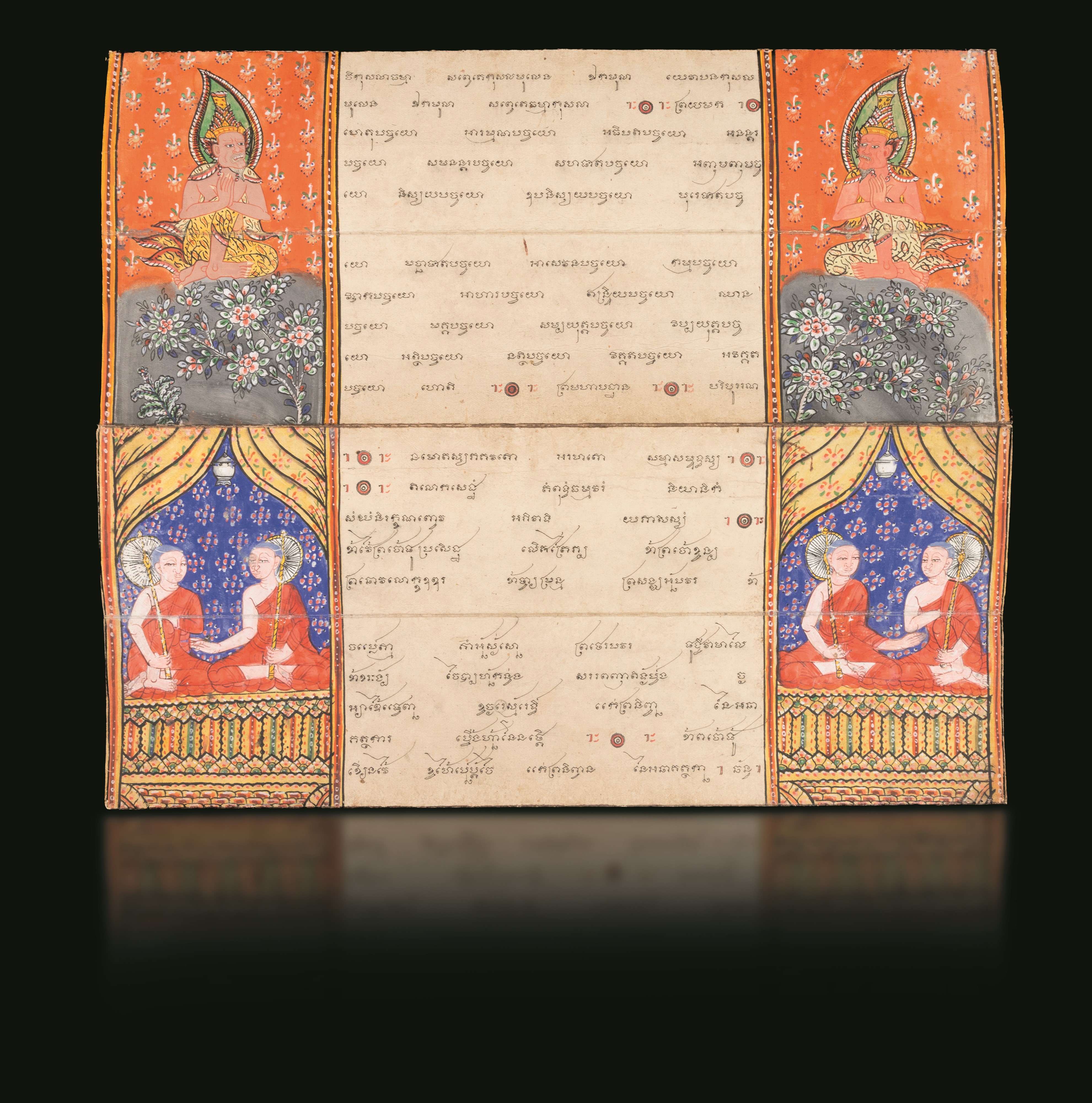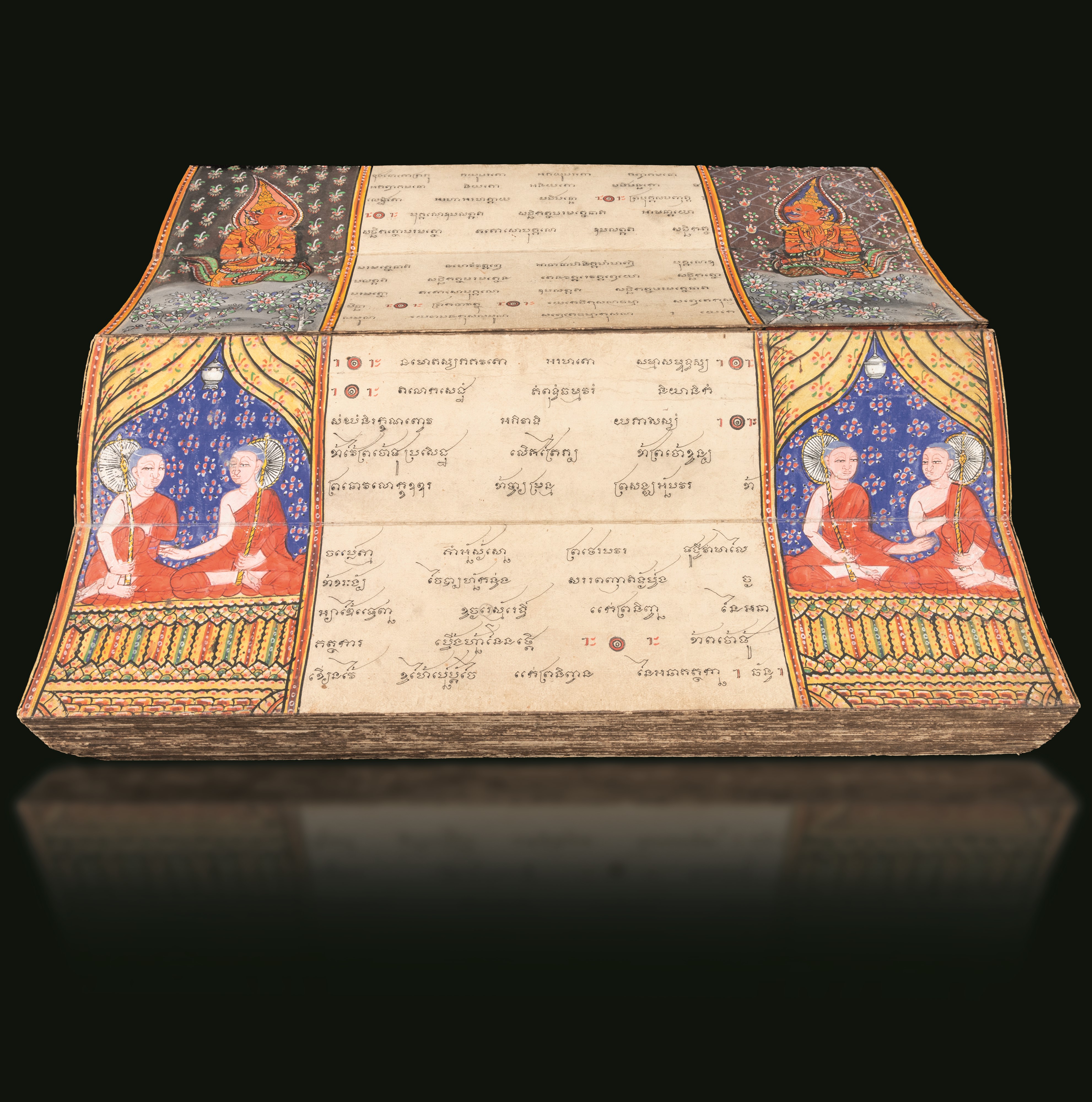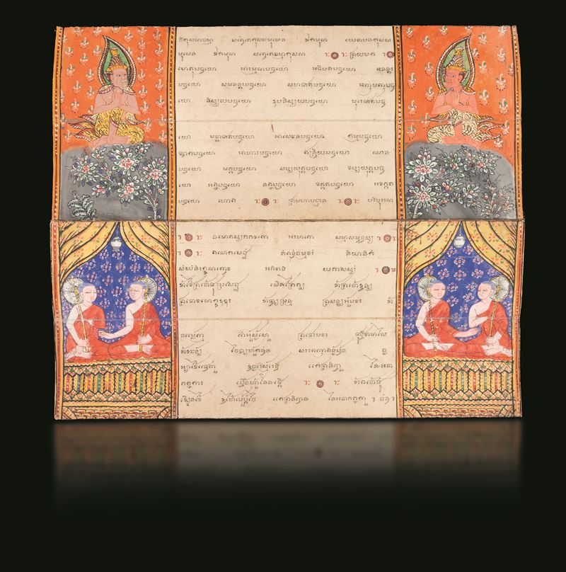 Questo manoscritto buddhista pieghevole è realizzato in sleuk rith, la forma più antica di libro dell'Impero Khmer, simile a quelli del Sud-est asiatico, e creato con fasci di foglie di palma. I manoscritti buddhisti illustrati simili, provenienti dal Sud-est asiatico, sono noti per le loro raffigurazioni di scene della vita del Buddha e delle storie delle sue vite precedenti, i Jataka. Queste scene sono finemente realizzate e spesso altamente dettagliate. Sebbene la maggior parte di questi manoscritti risalga al XVIII e XIX secolo, le loro illustrazioni si basano su testi in lingua pāli molto più antichi, originari dello Sri Lanka già nel I secolo a.C. La straordinaria bellezza di queste miniature risiede nella rappresentazione dell’ambiente naturale che circonda la figura centrale, il Buddha storico, sottolineando il suo profondo legame con la natura e con tutti gli esseri viventi.