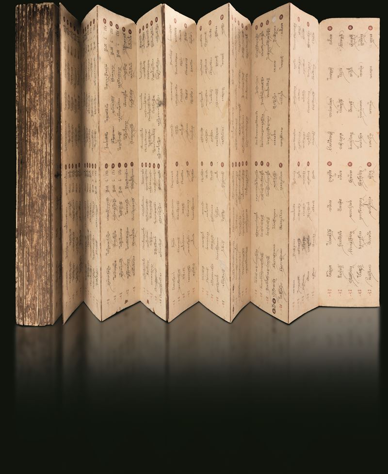 Manoscritti buddhisti in Khmer con disegni di personaggi e divinità, ripiegato su se stesso 51 volte, Cambogia, XIX secolo