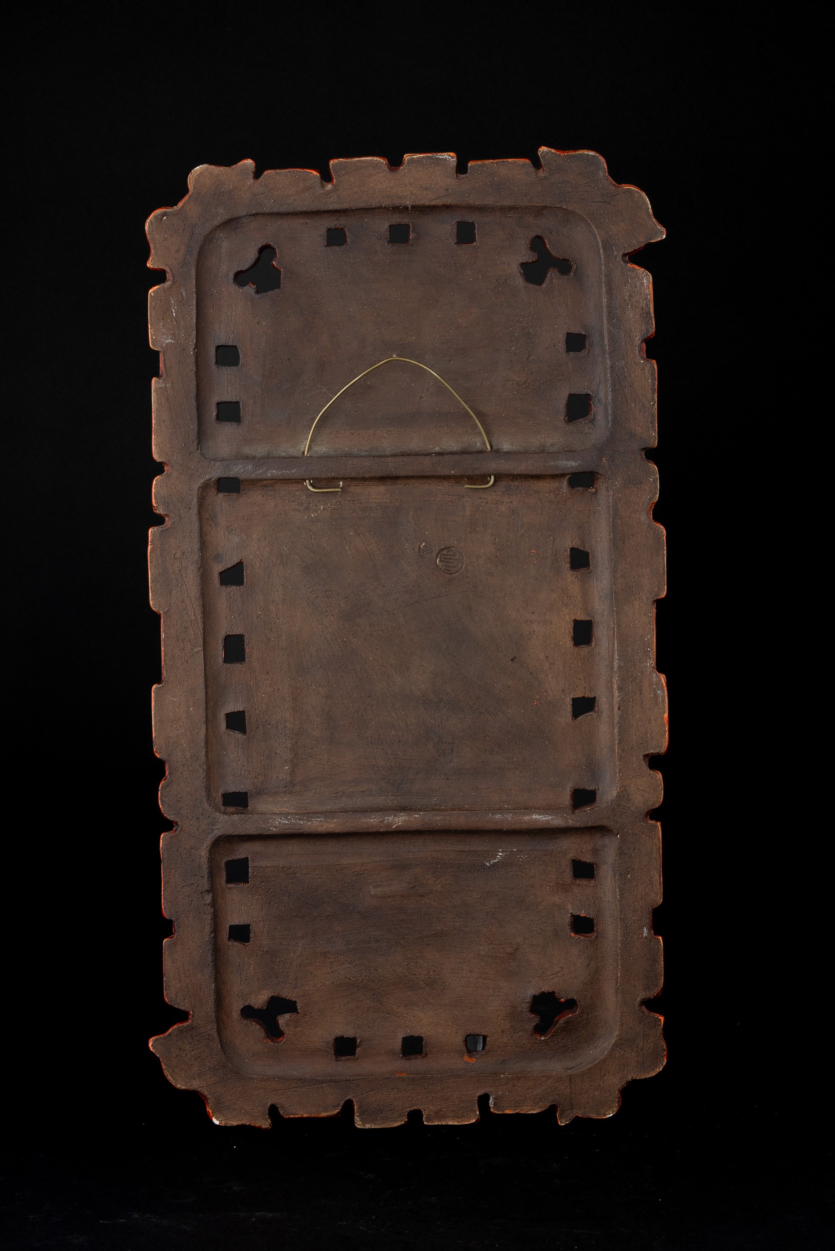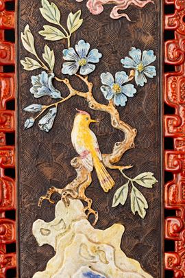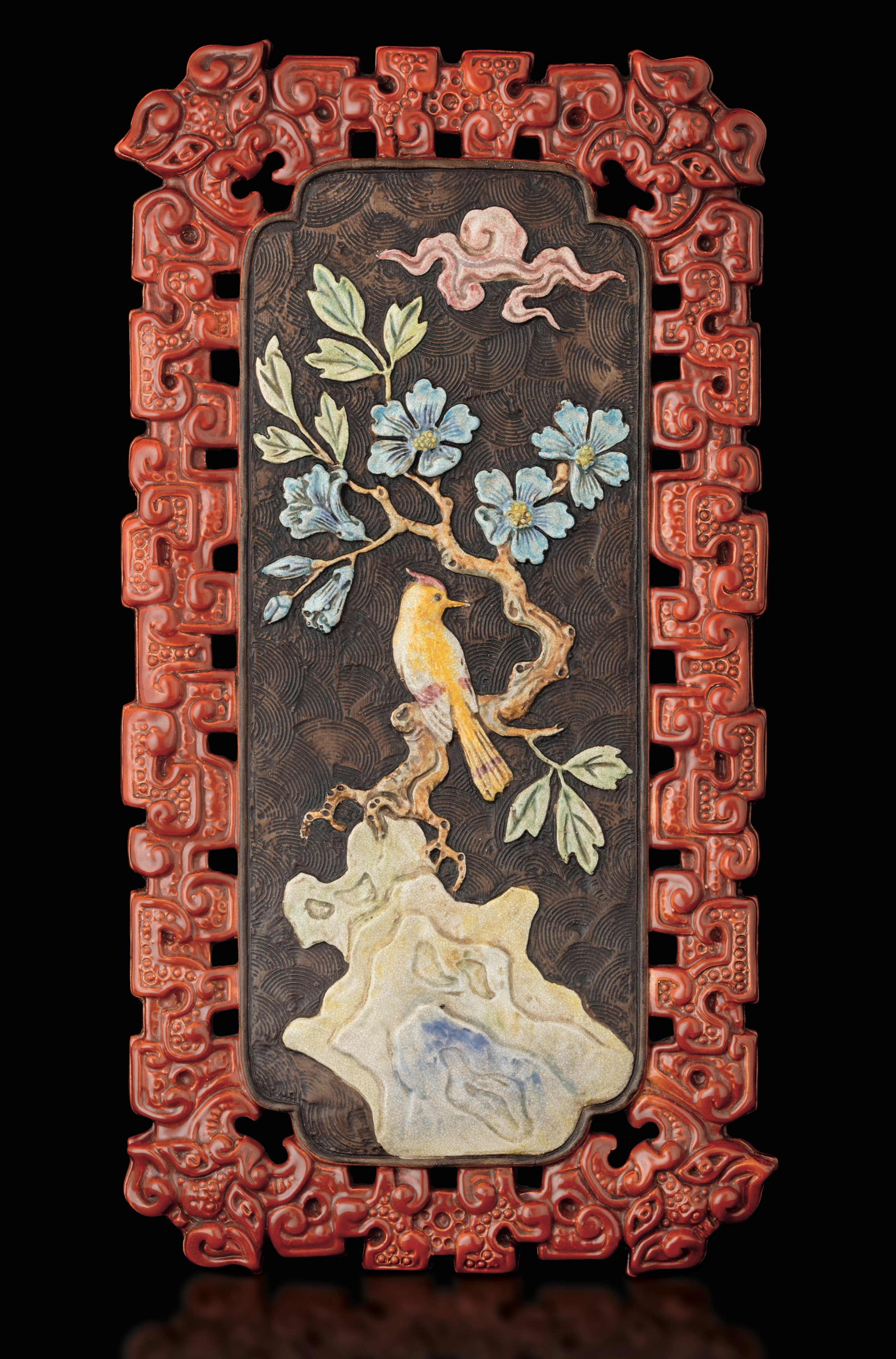 Pannello in porcellana policroma raffigurante Bonsai, Cina, XX secolo