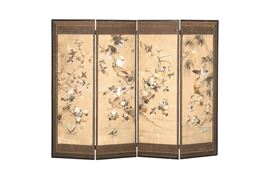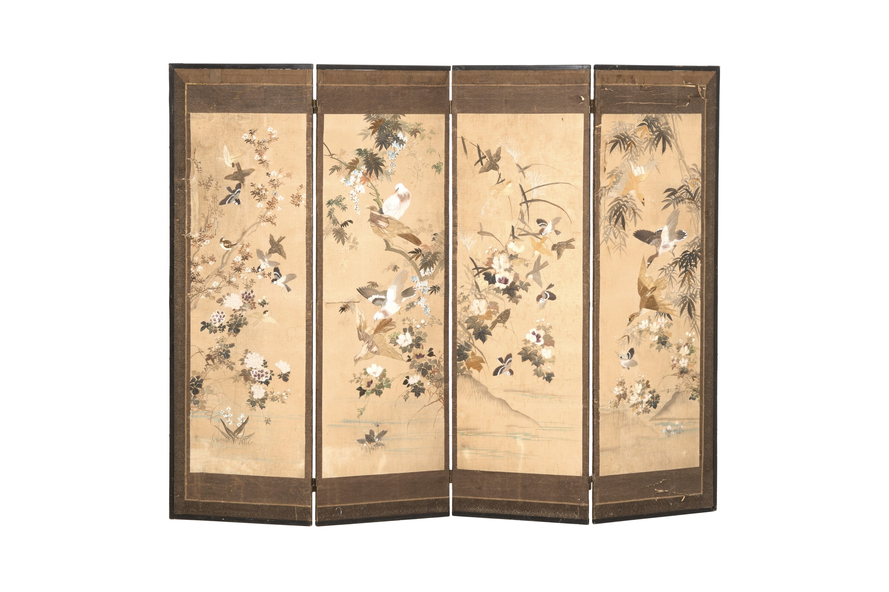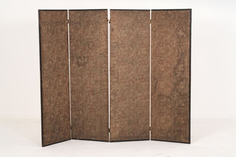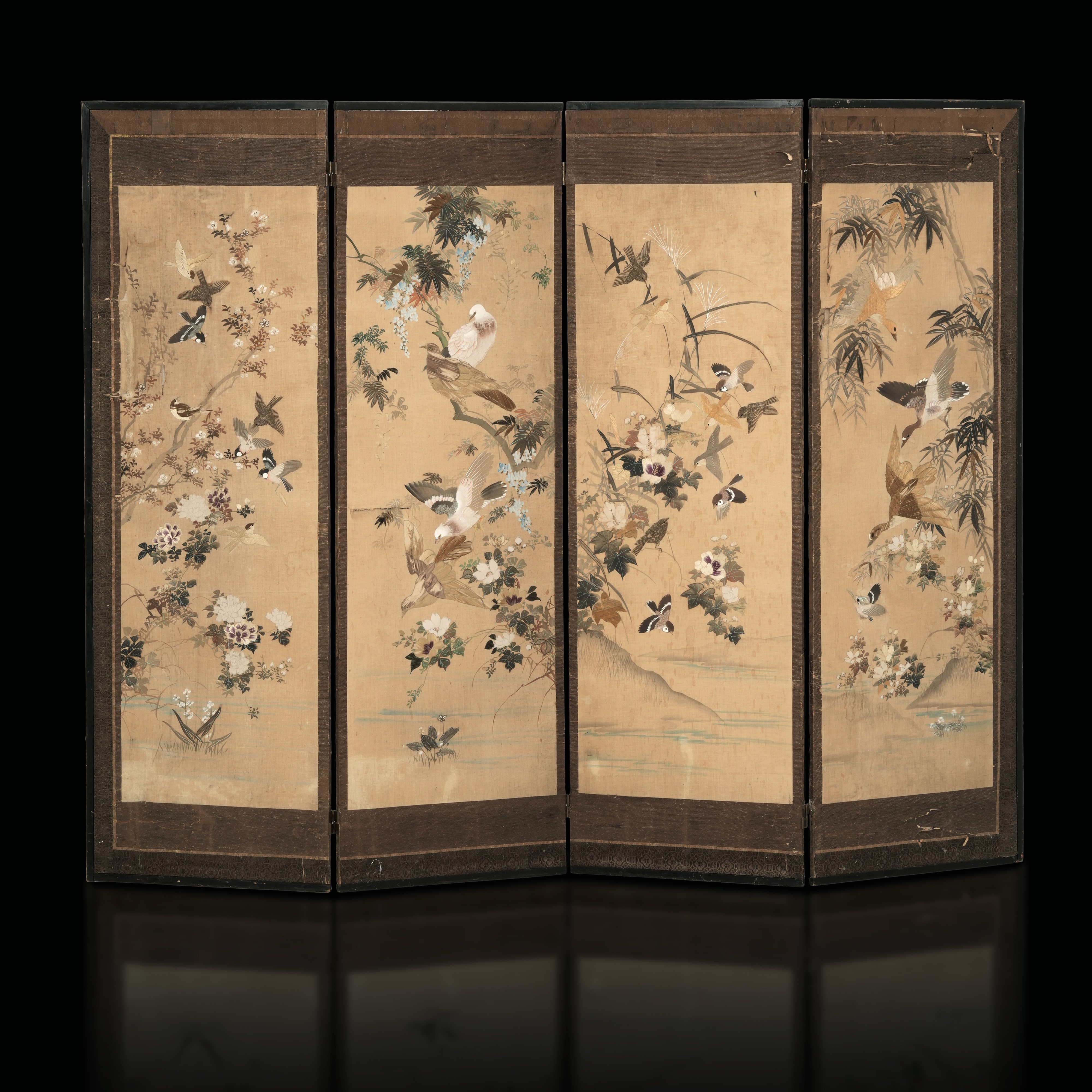 Paravento in legno a quattro ante con recami su seta a soggetto naturalistico, Cina, Dinastia Qing, fine XVIII secolo