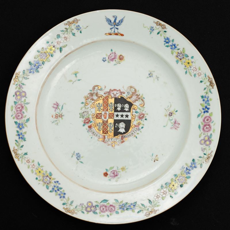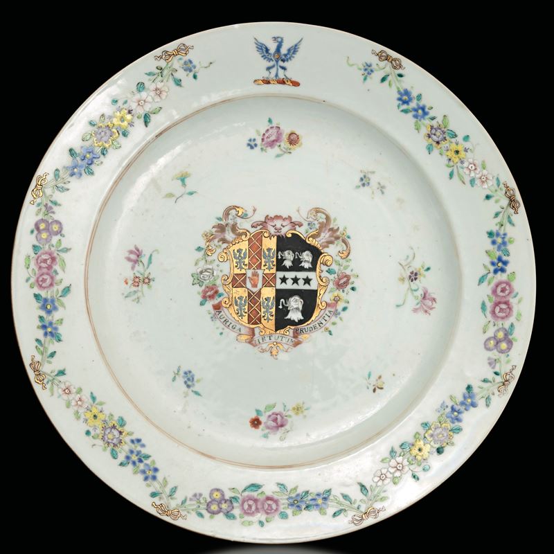 Piatto in porcellana Famiglia Rosa con stemma araldico nobiliare e motivi floreali, Cina, Dinastia Qing, epoca Qianlong (1736-1796)