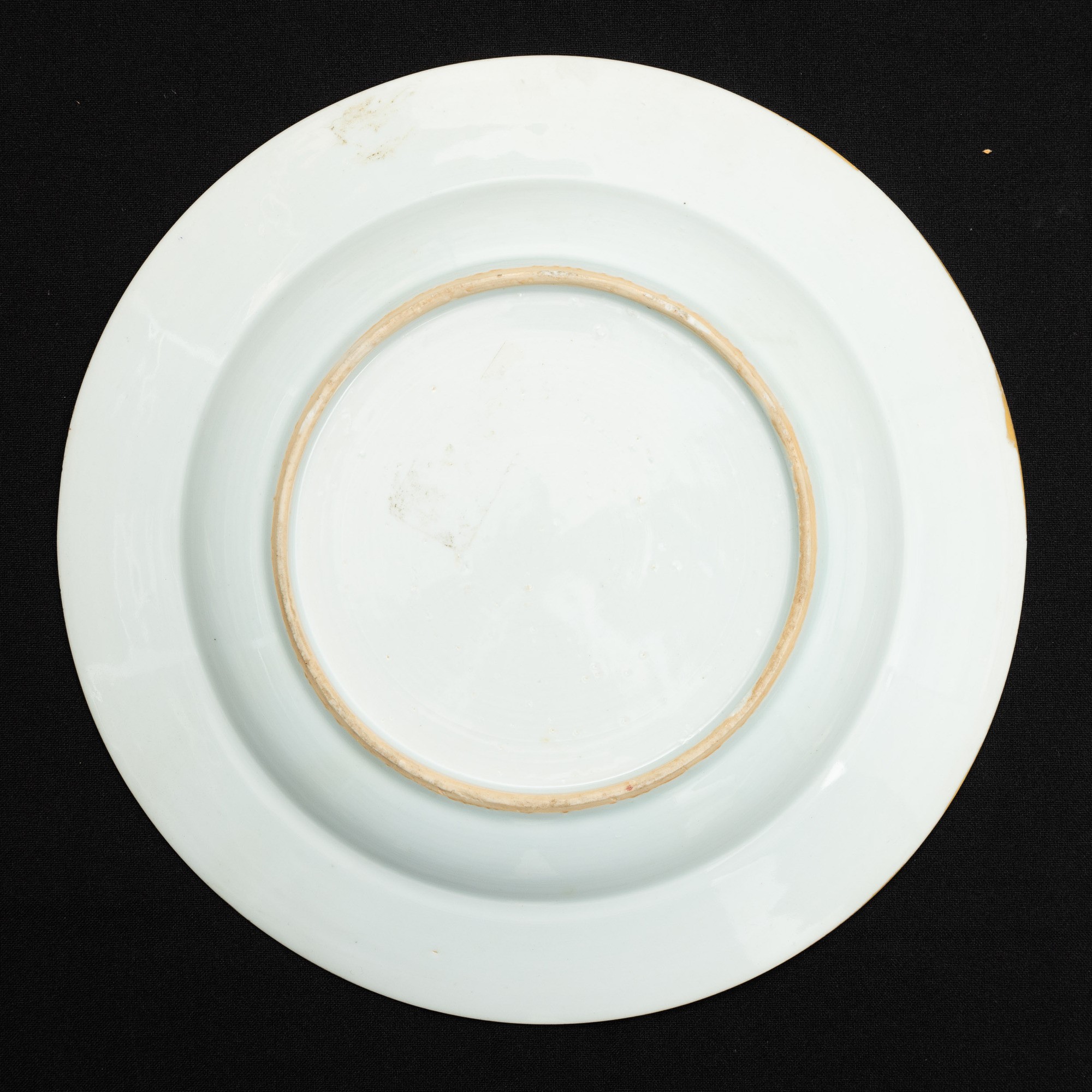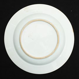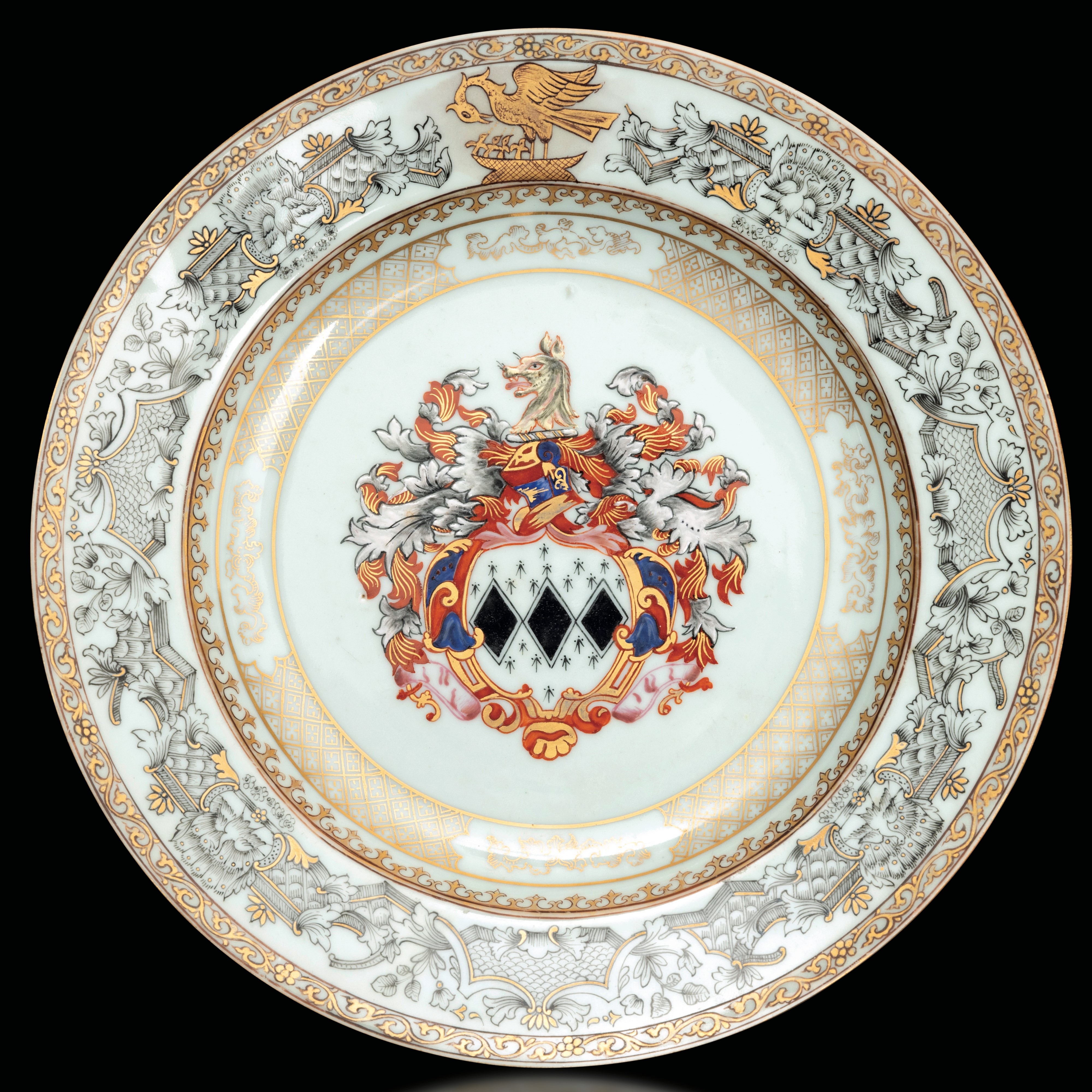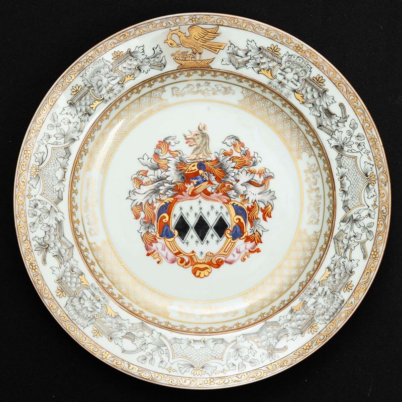 Piatto in porcellana Famiglia Rosa e Grisaille con stemma araldico nobiliare e decori blu e dorati a motivi floreali, Compagnia delle Indie, XVIII secolo