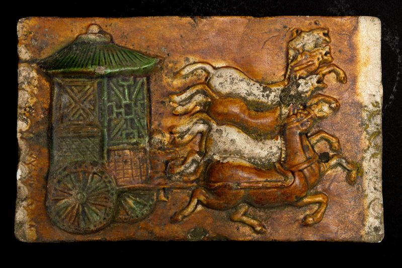 Rara placca in terracotta Sancai raffigurante cavalli, Cina, Dinastia Ming, XV secolo